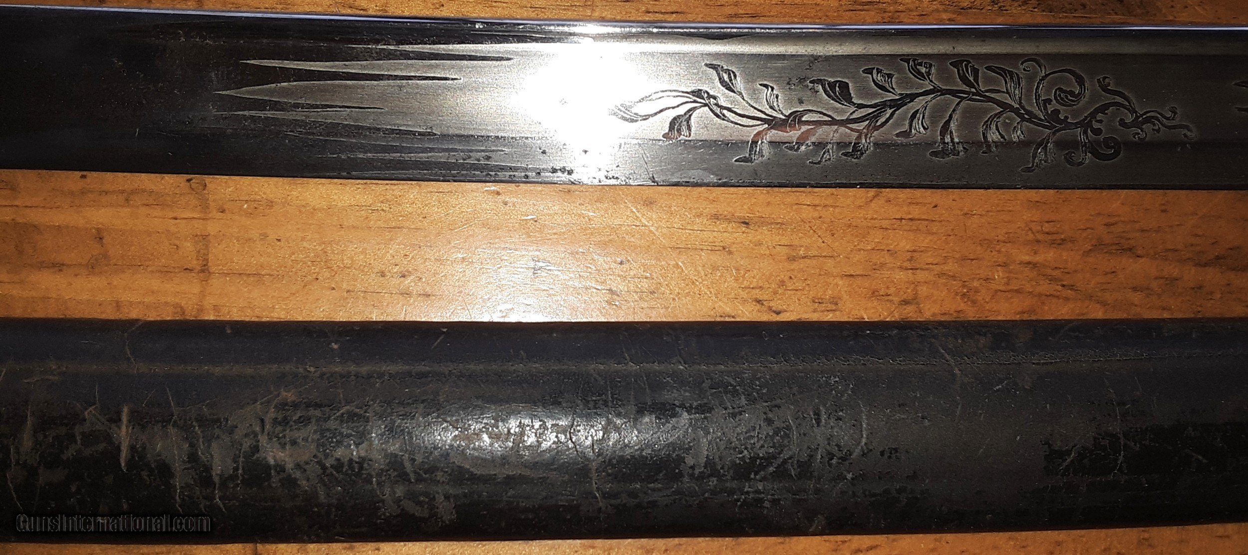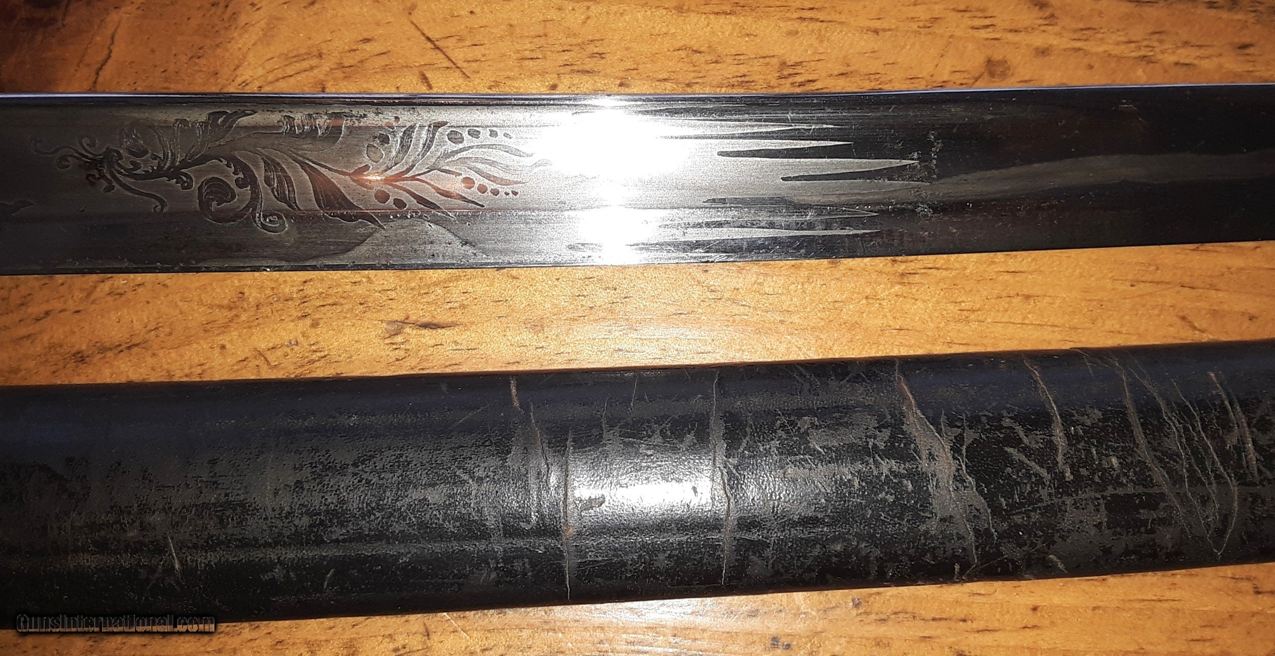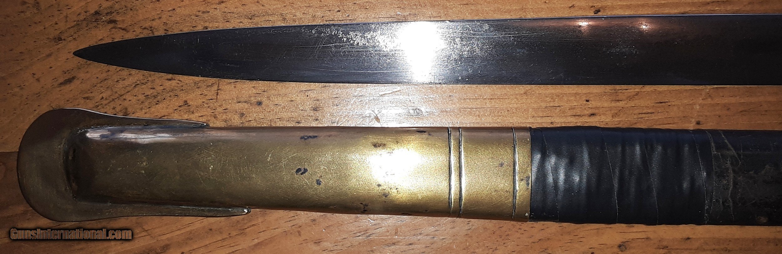 Description: Offered here is a nice-looking Ames Model 1850 Foot Officer sword and scabbard. The sword is in very fine condition with original sharkskin wrap and wire on the hilt, and the Ames maker mark etched on the blade The blade is tight and retains its original leather washer and has a higher quality etching than that commonly found on the foot officer swords, in this case covering almost 3/4 of the blade. The leather scabbard is an origninal Ames, so marked on the reverse upper mount. The scabbard was apparently broken and missing the lower drag. Someone did a previous repair, splicing some additional leather at the bottom and adding a modern but correct style reproduction drag. The leather above the drag remains weak and is reinforced with electrical tape to be able to display. There are restorers who can make it look good as new if buyer wishes to do that. Please take a look at all the photos as they provide the best description of condition. Shipping to the lower 48 contiguous states. Shipping cost $45.00. SOLD |