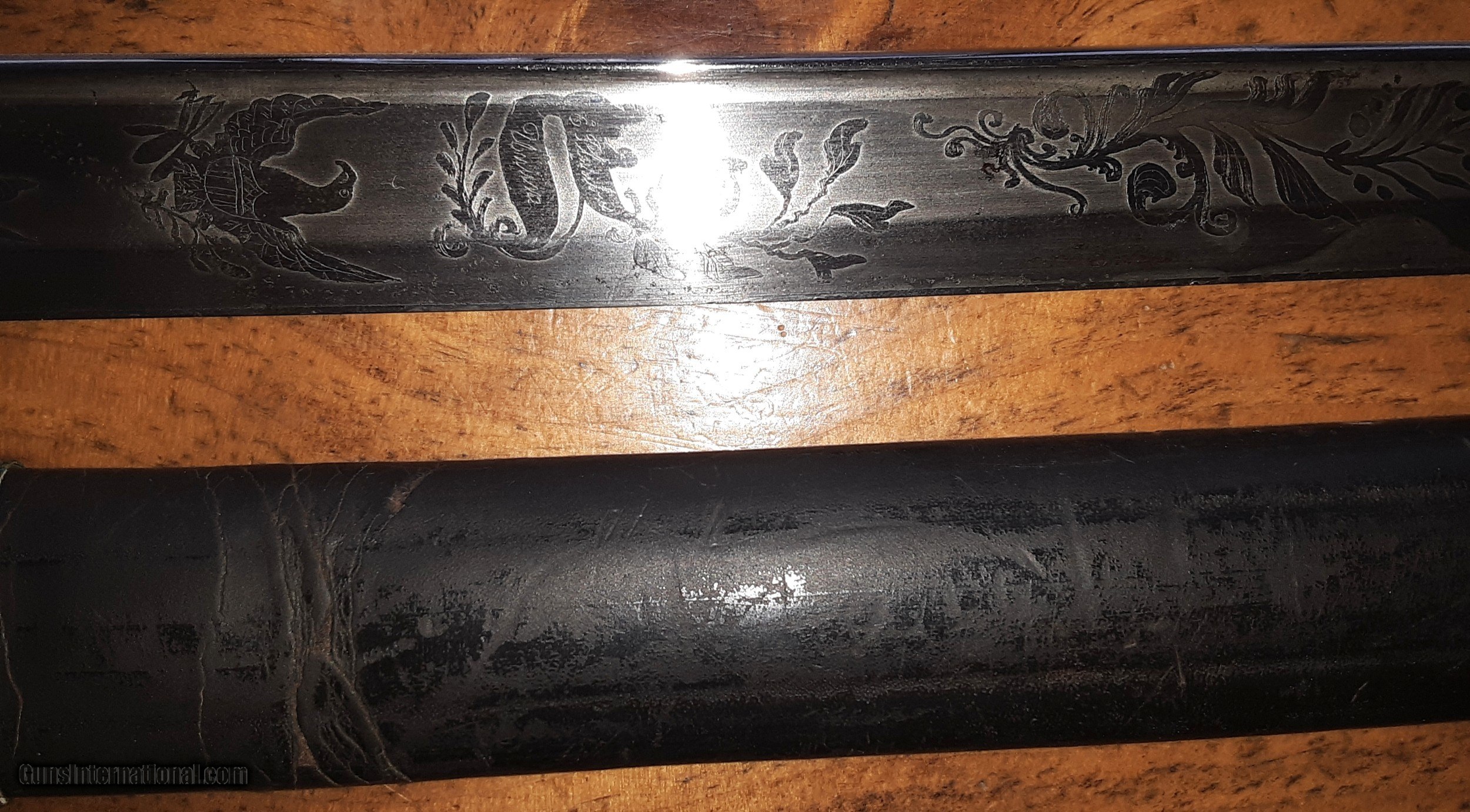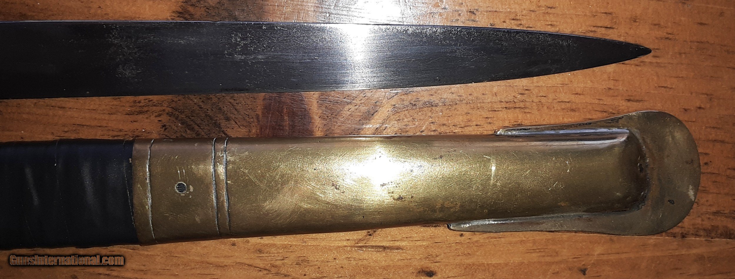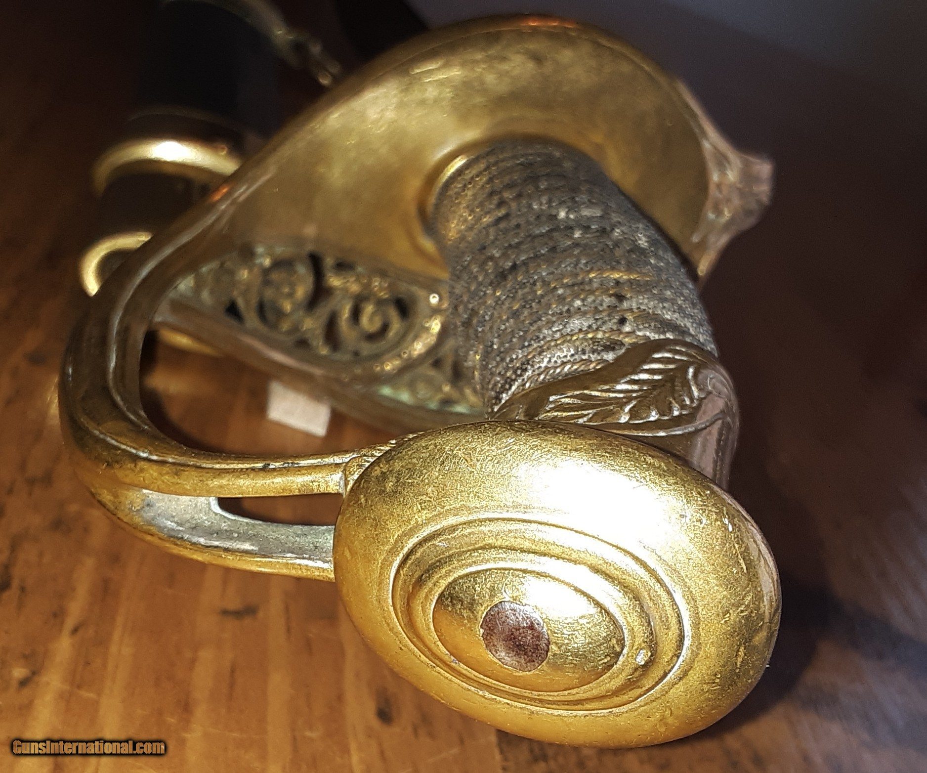 Description: Offered here is a nice-looking Ames Model 1850 Foot Officer sword and scabbard. The sword is in very fine condition with original sharkskin wrap and wire on the hilt, and the Ames maker mark etched on the blade The blade is tight and retains its original leather washer and has a higher quality etching than that commonly found on the foot officer swords, in this case covering almost 3/4 of the blade. The leather scabbard is an origninal Ames, so marked on the reverse upper mount. The scabbard was apparently broken and missing the lower drag. Someone did a previous repair, splicing some additional leather at the bottom and adding a modern but correct style reproduction drag. The leather above the drag remains weak and is reinforced with electrical tape to be able to display. There are restorers who can make it look good as new if buyer wishes to do that. Please take a look at all the photos as they provide the best description of condition. Shipping to the lower 48 contiguous states. Shipping cost $45.00. SOLD |