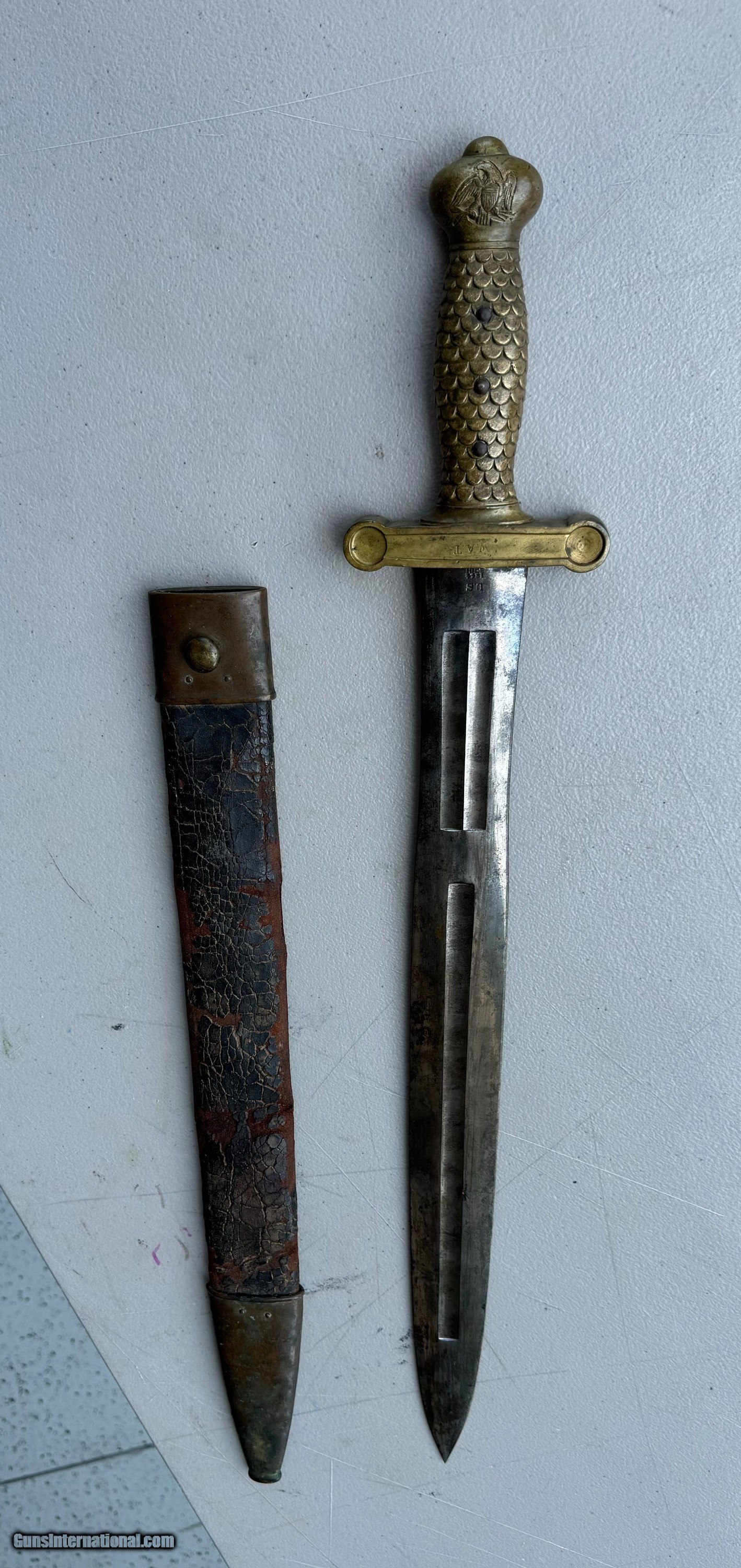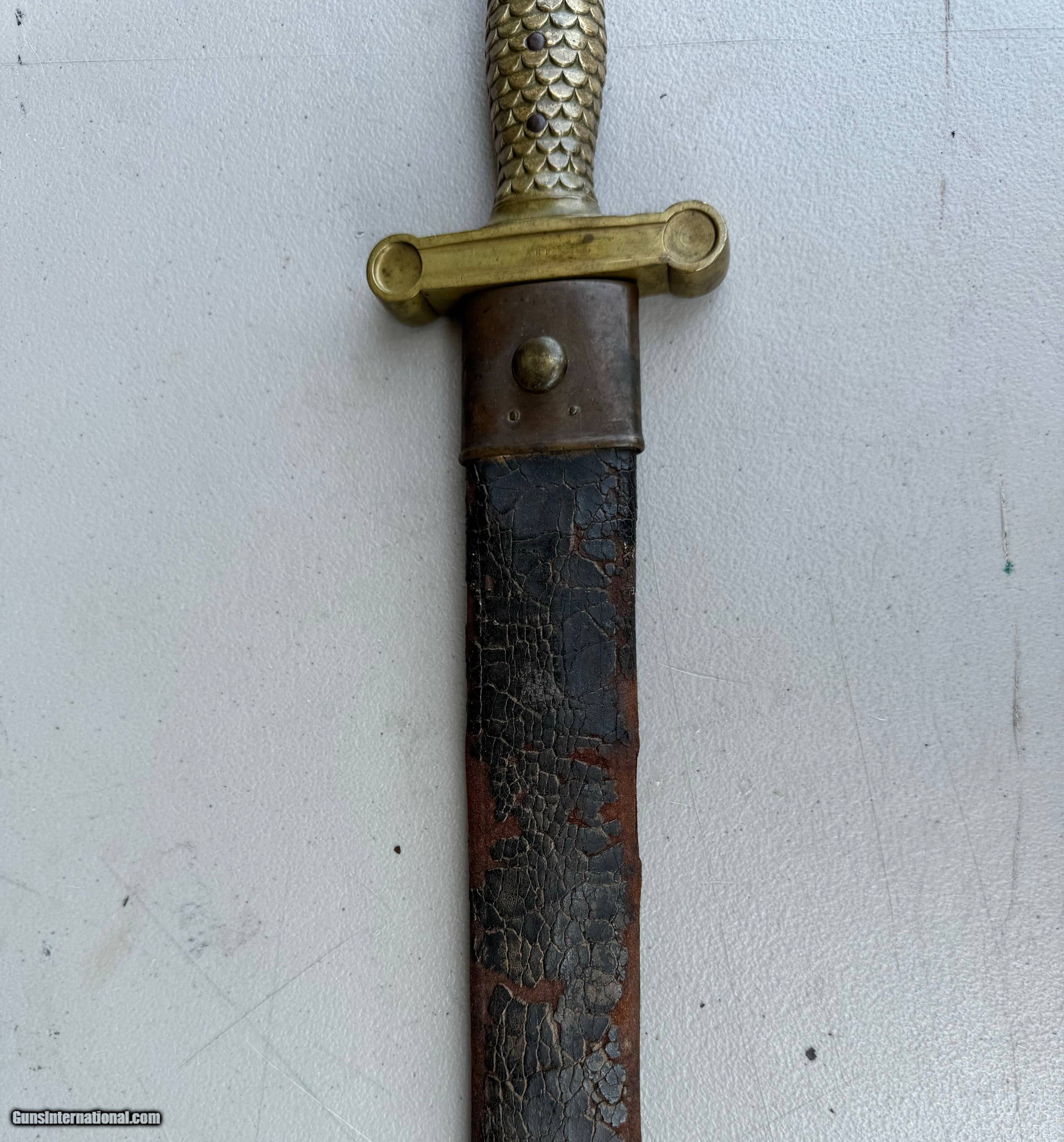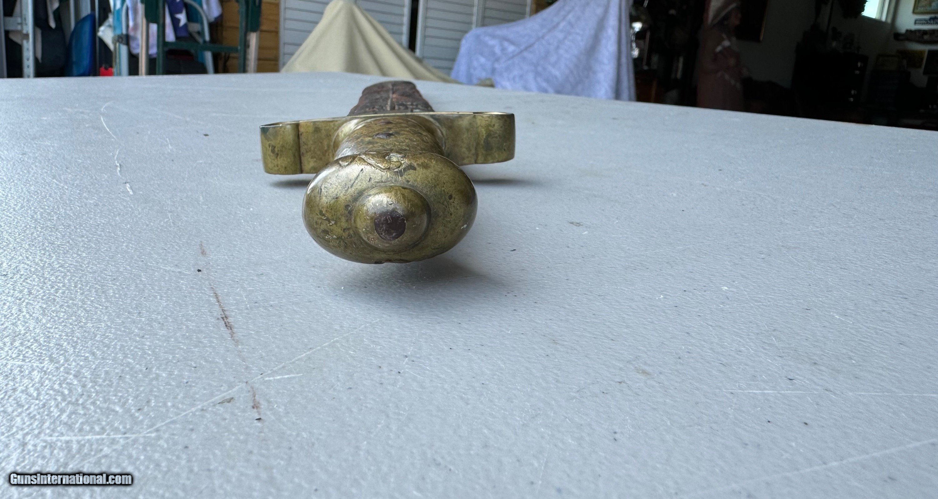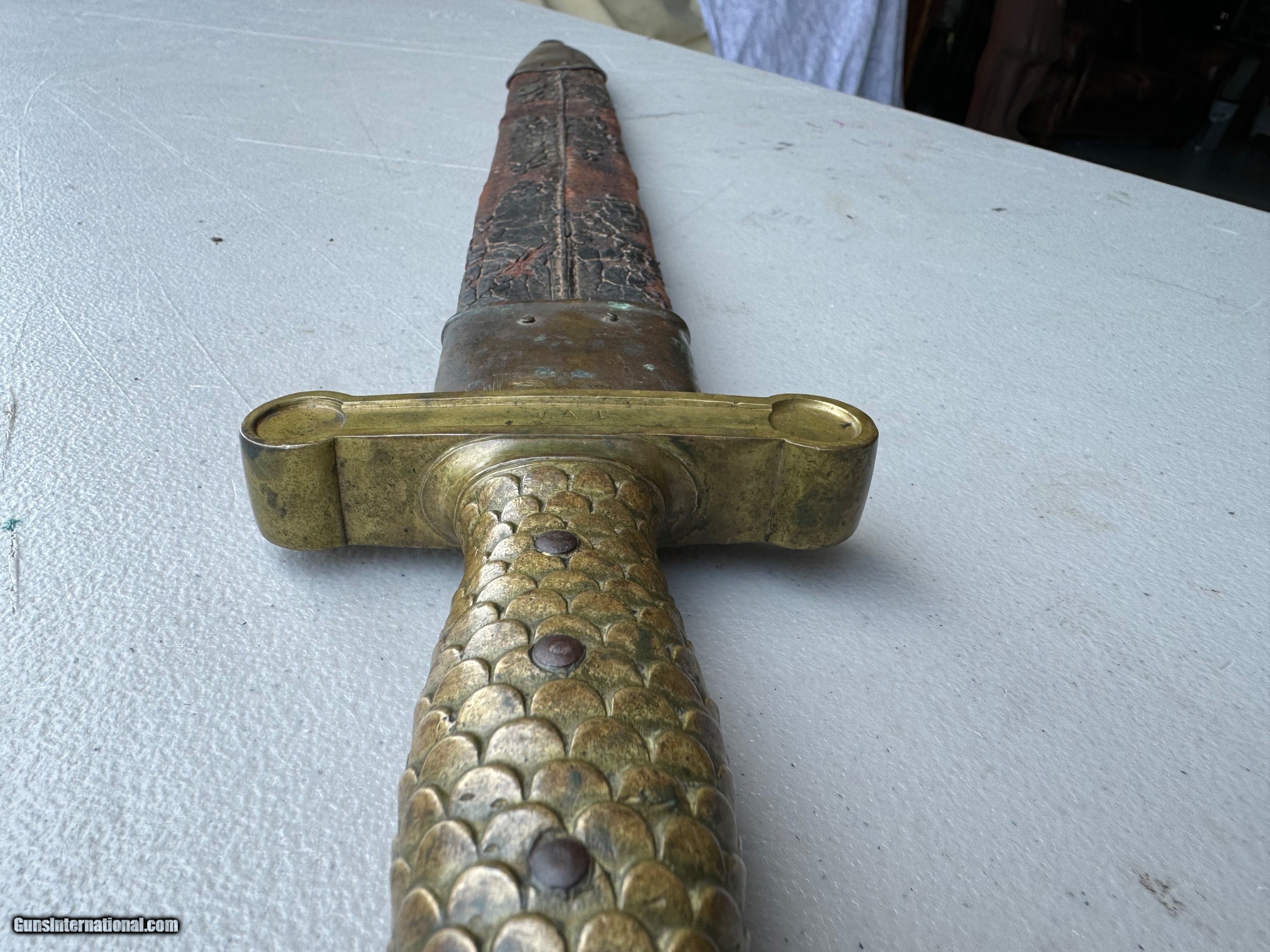 Description: Here's a Excellent Example of a True Survivor! N.P Ames Artillery Short Sword dated 1944 . Has correct inspector stamped with W.A.T. And J.H inspectors ! Blade is untouched original . Rare thing about this Short Sword is that the original leather scabbard has survived 180 years ! The leather on the Scabbard is in poor condition but is still all there . Brass parts are in excellent original condition. Overall a excellent Condition Survivor With U.S. American History ! Please review my photos and email me with any questions? 3 day inspection as allways ! Thank you for looking , Little Jo SOLD |