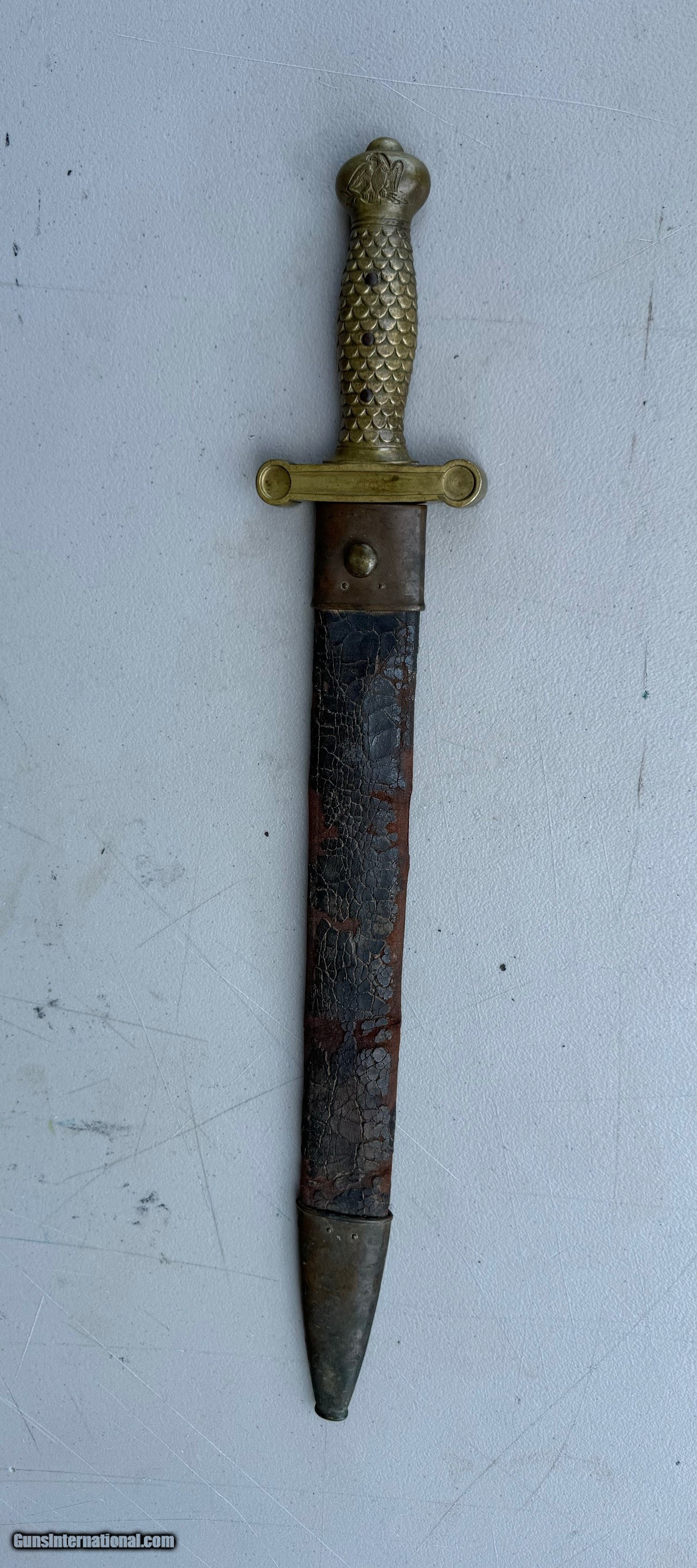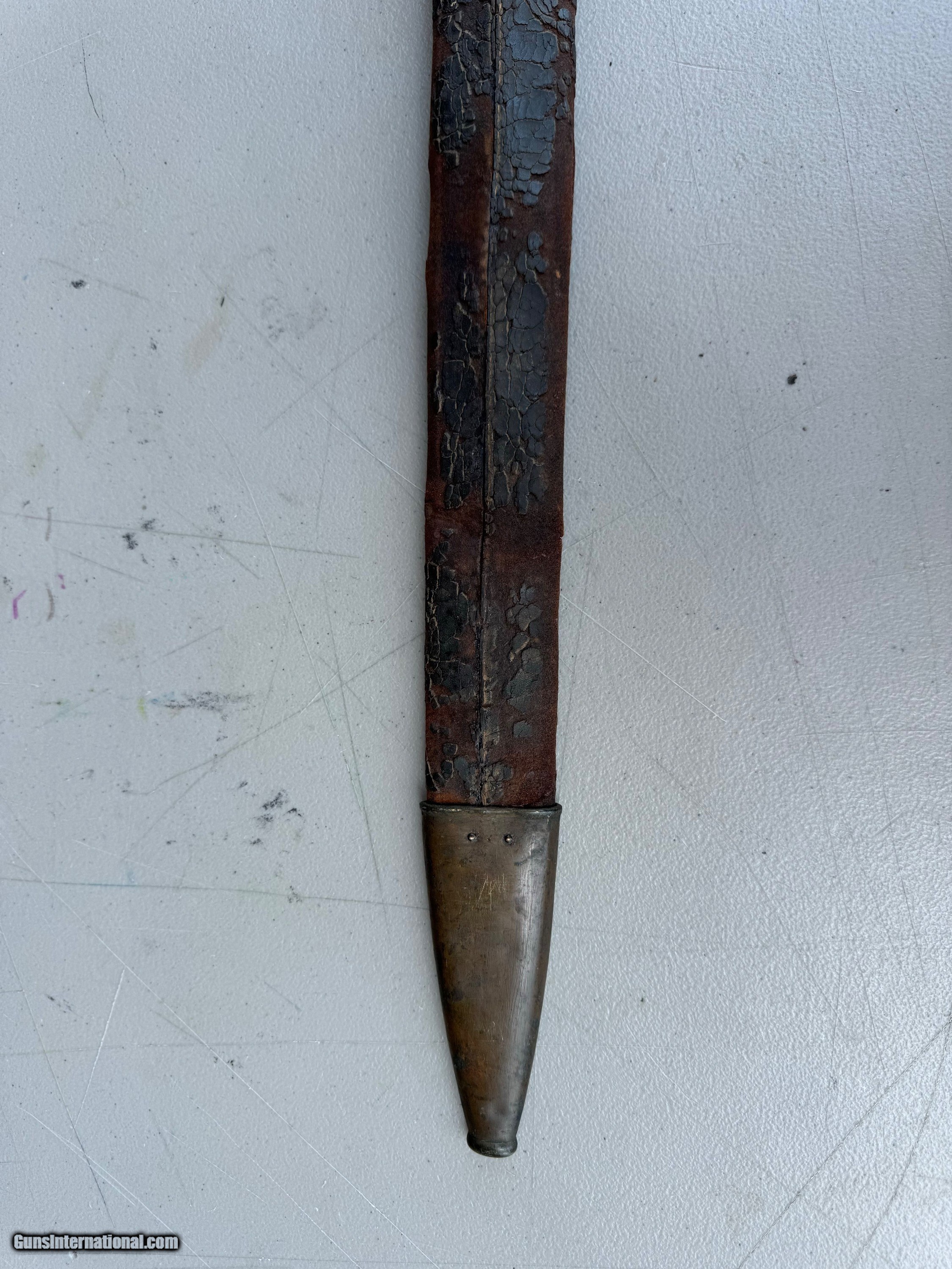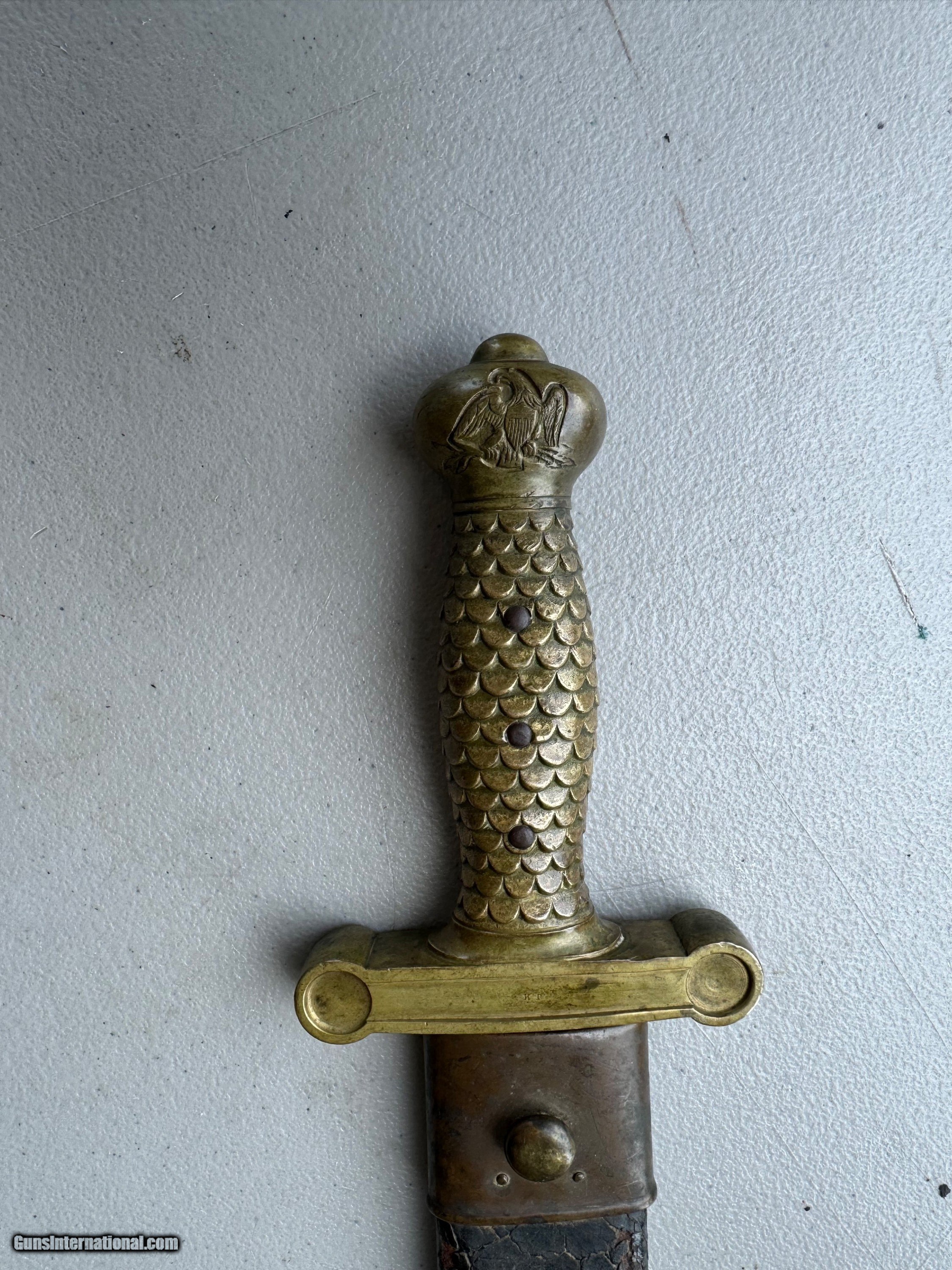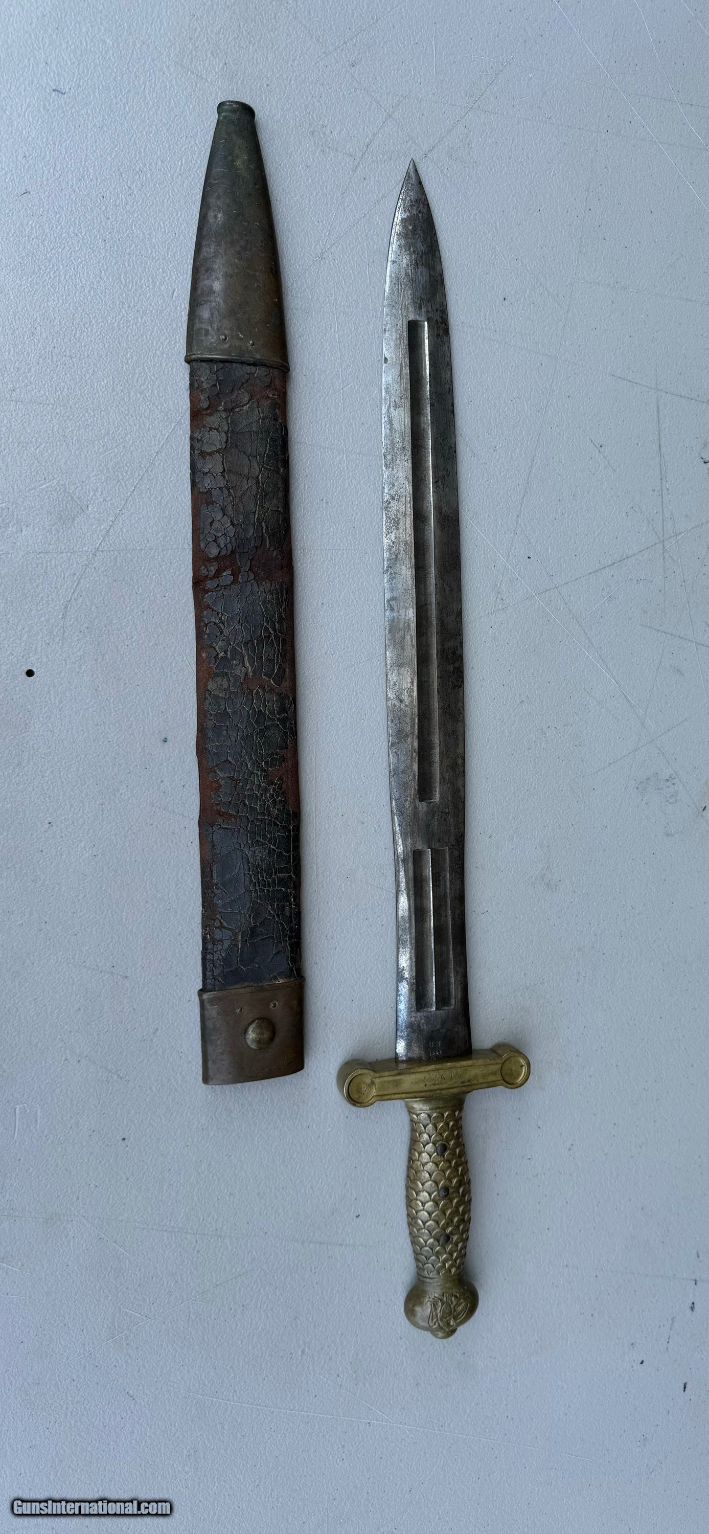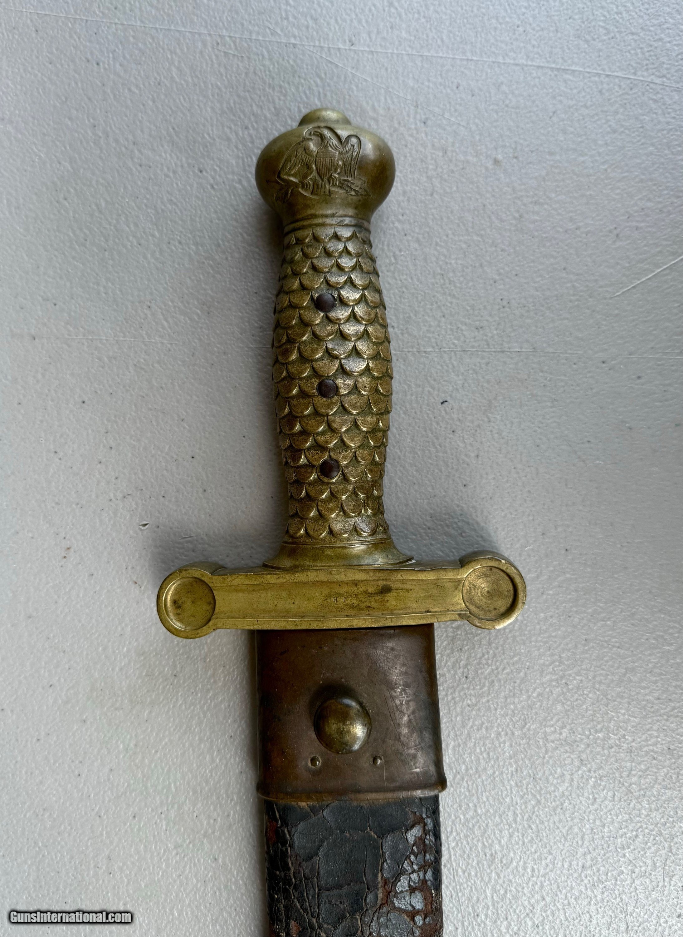 Description: Here's a Excellent Example of a True Survivor! N.P Ames Artillery Short Sword dated 1944 . Has correct inspector stamped with W.A.T. And J.H inspectors ! Blade is untouched original . Rare thing about this Short Sword is that the original leather scabbard has survived 180 years ! The leather on the Scabbard is in poor condition but is still all there . Brass parts are in excellent original condition. Overall a excellent Condition Survivor With U.S. American History ! Please review my photos and email me with any questions? 3 day inspection as allways ! Thank you for looking , Little Jo SOLD |
