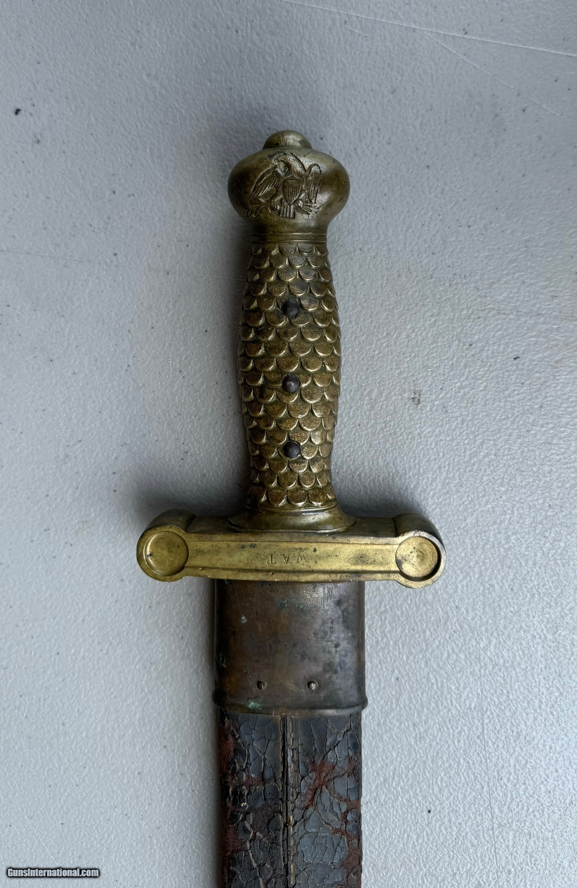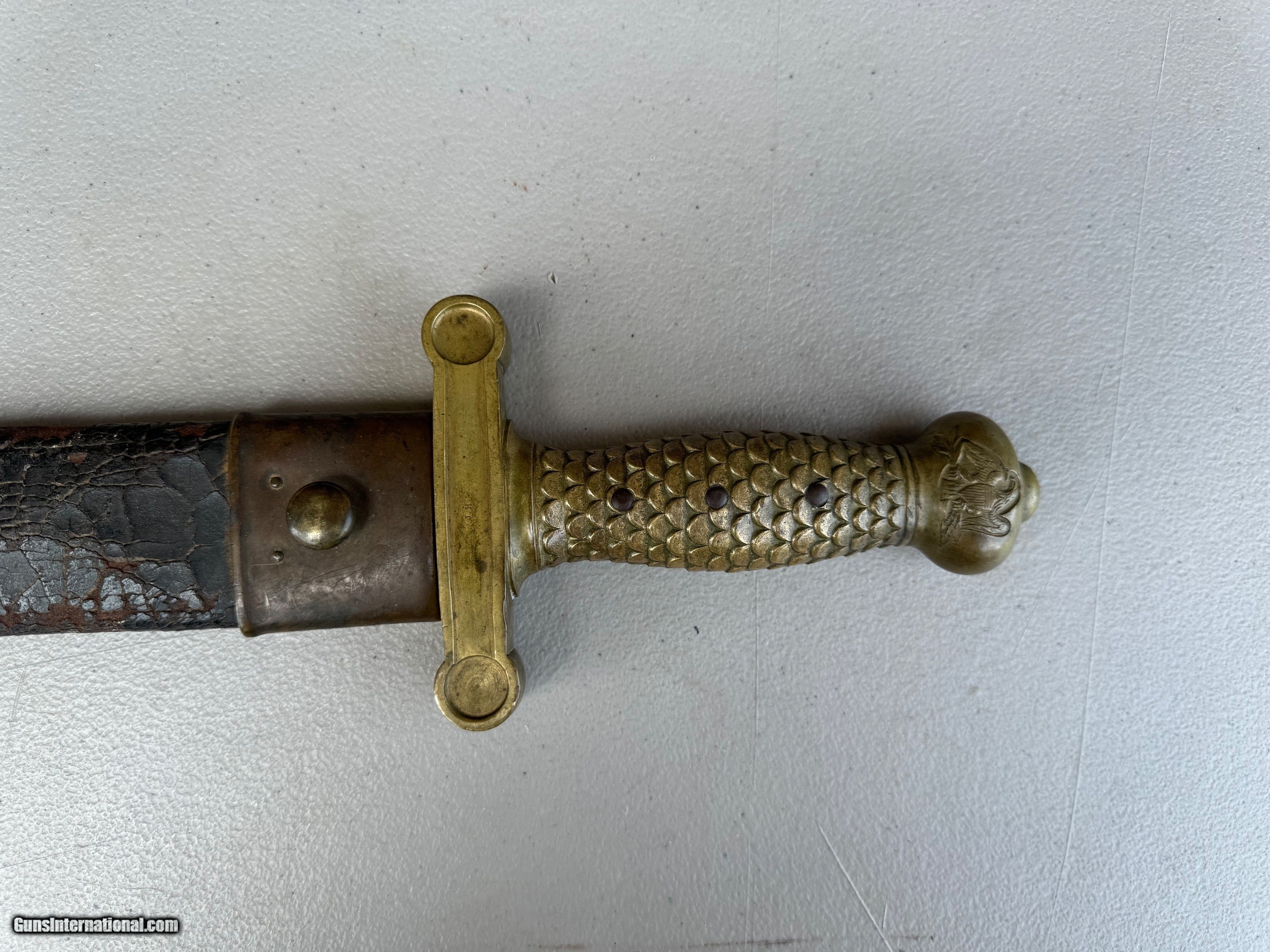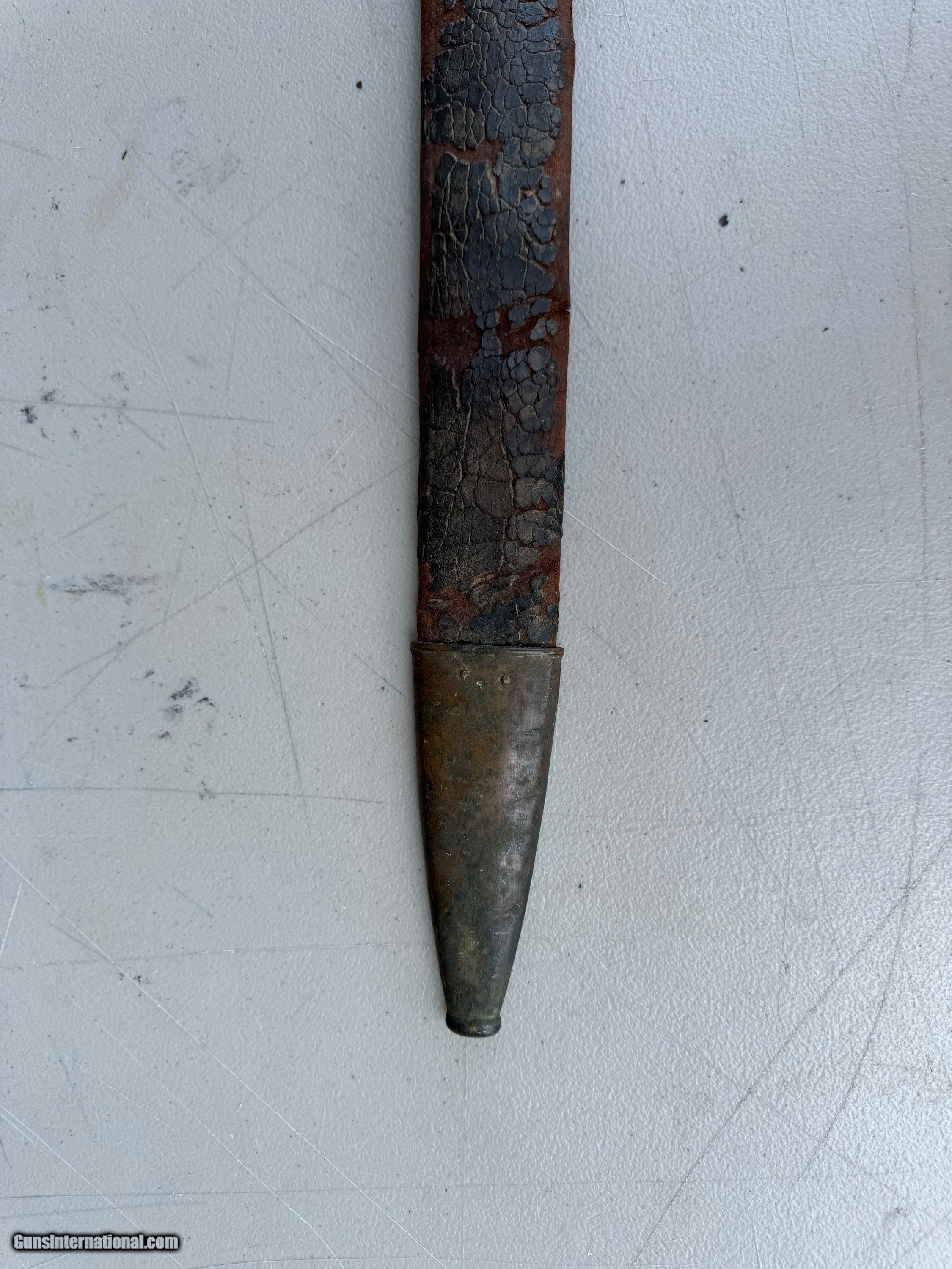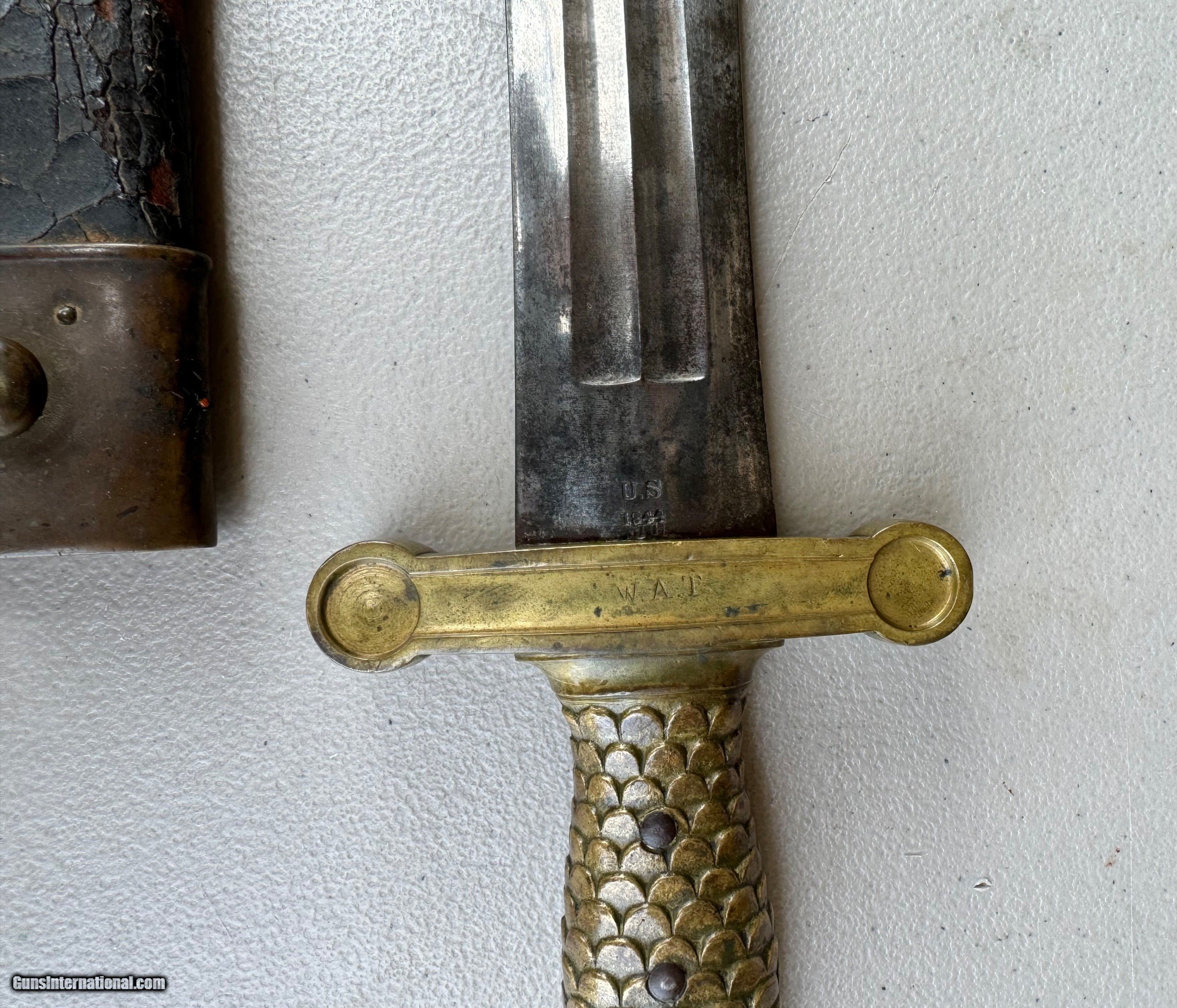Description: Here's a Excellent Example of a True Survivor! N.P Ames Artillery Short Sword dated 1944 . Has correct inspector stamped with W.A.T. And J.H inspectors ! Blade is untouched original . Rare thing about this Short Sword is that the original leather scabbard has survived 180 years ! The leather on the Scabbard is in poor condition but is still all there . Brass parts are in excellent original condition. Overall a excellent Condition Survivor With U.S. American History ! Please review my photos and email me with any questions? 3 day inspection as allways ! Thank you for looking , Little Jo SOLD |