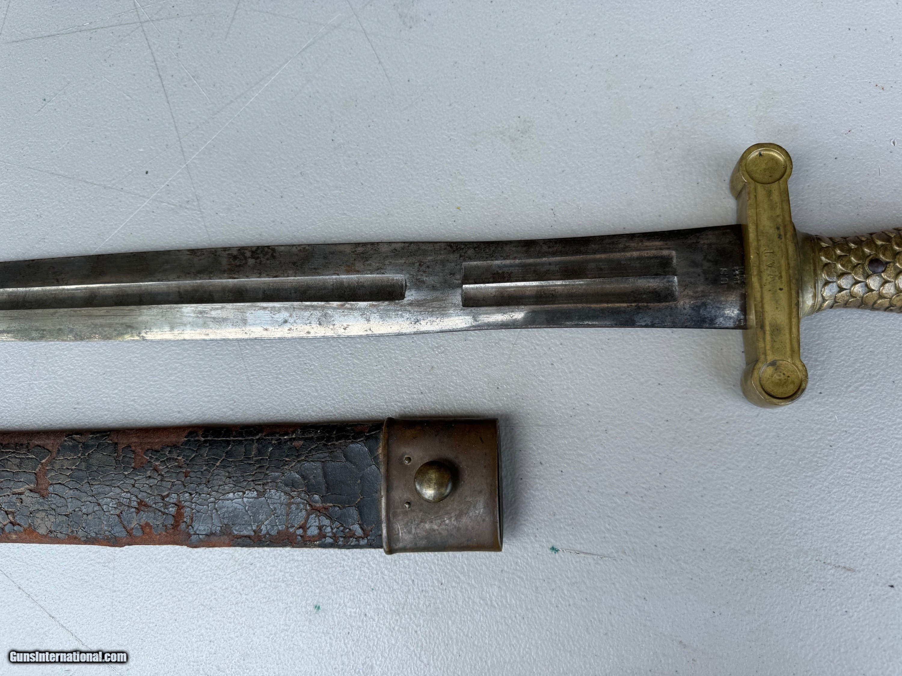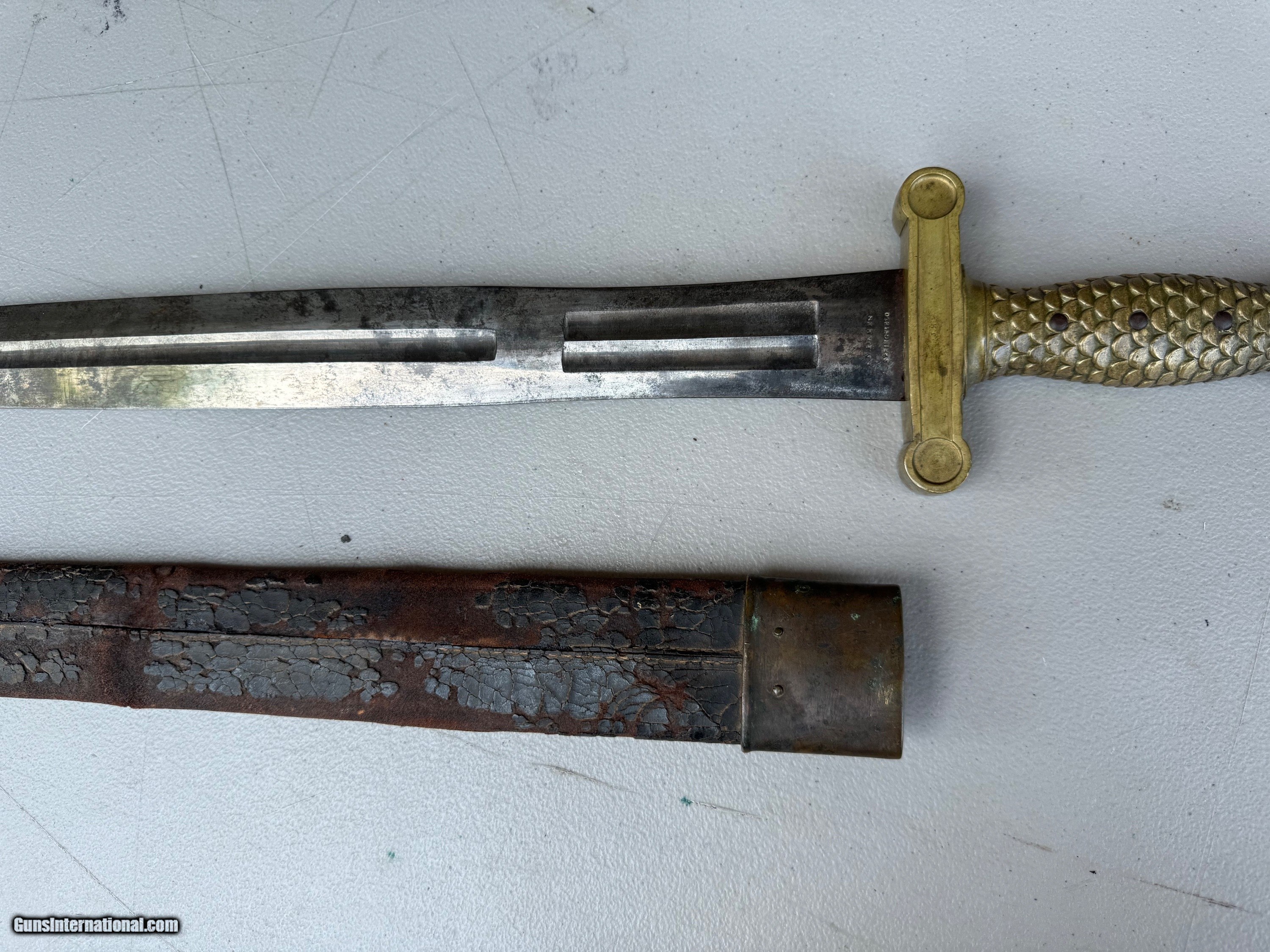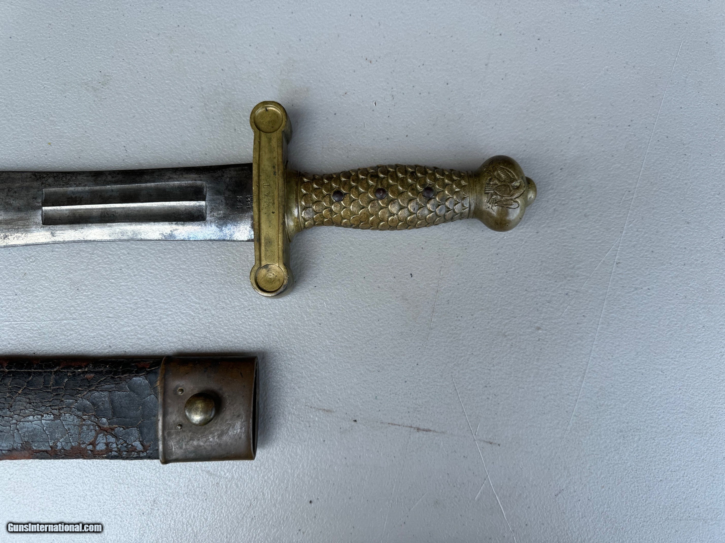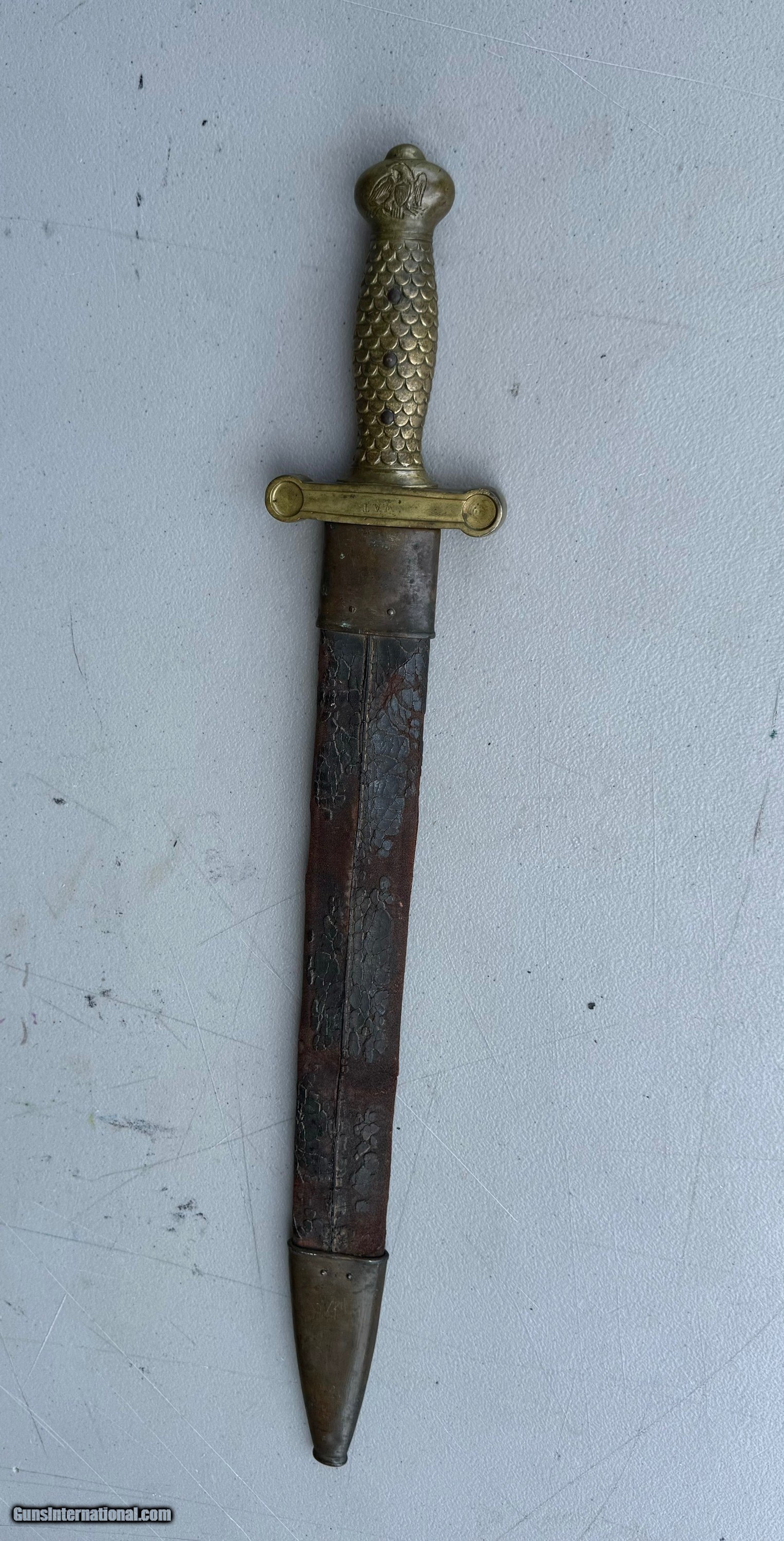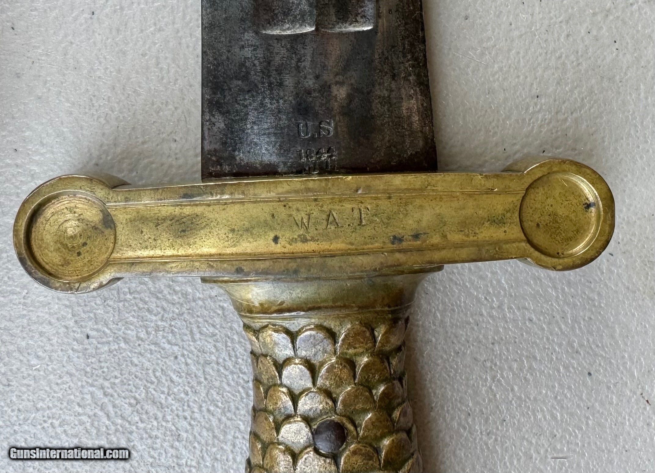 Description: Here's a Excellent Example of a True Survivor! N.P Ames Artillery Short Sword dated 1944 . Has correct inspector stamped with W.A.T. And J.H inspectors ! Blade is untouched original . Rare thing about this Short Sword is that the original leather scabbard has survived 180 years ! The leather on the Scabbard is in poor condition but is still all there . Brass parts are in excellent original condition. Overall a excellent Condition Survivor With U.S. American History ! Please review my photos and email me with any questions? 3 day inspection as allways ! Thank you for looking , Little Jo SOLD |