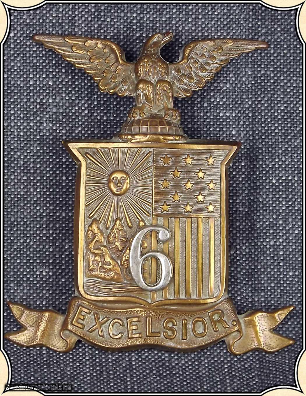 Description: New York National Guard Excelsior 6 Shako Insignia. With an Eagle perched atop a Shield, wings spread, the number 6 in front and a flag below marked Excelsior, this Shako insignia would be just the thing to add to your Shako or other cap/hat. Repairs to pin in the back have been done. PAYMENT Cash, postal money order, cashiers check, personal & business checks. May order at riverjucntion on-line with credit card. SOLD |