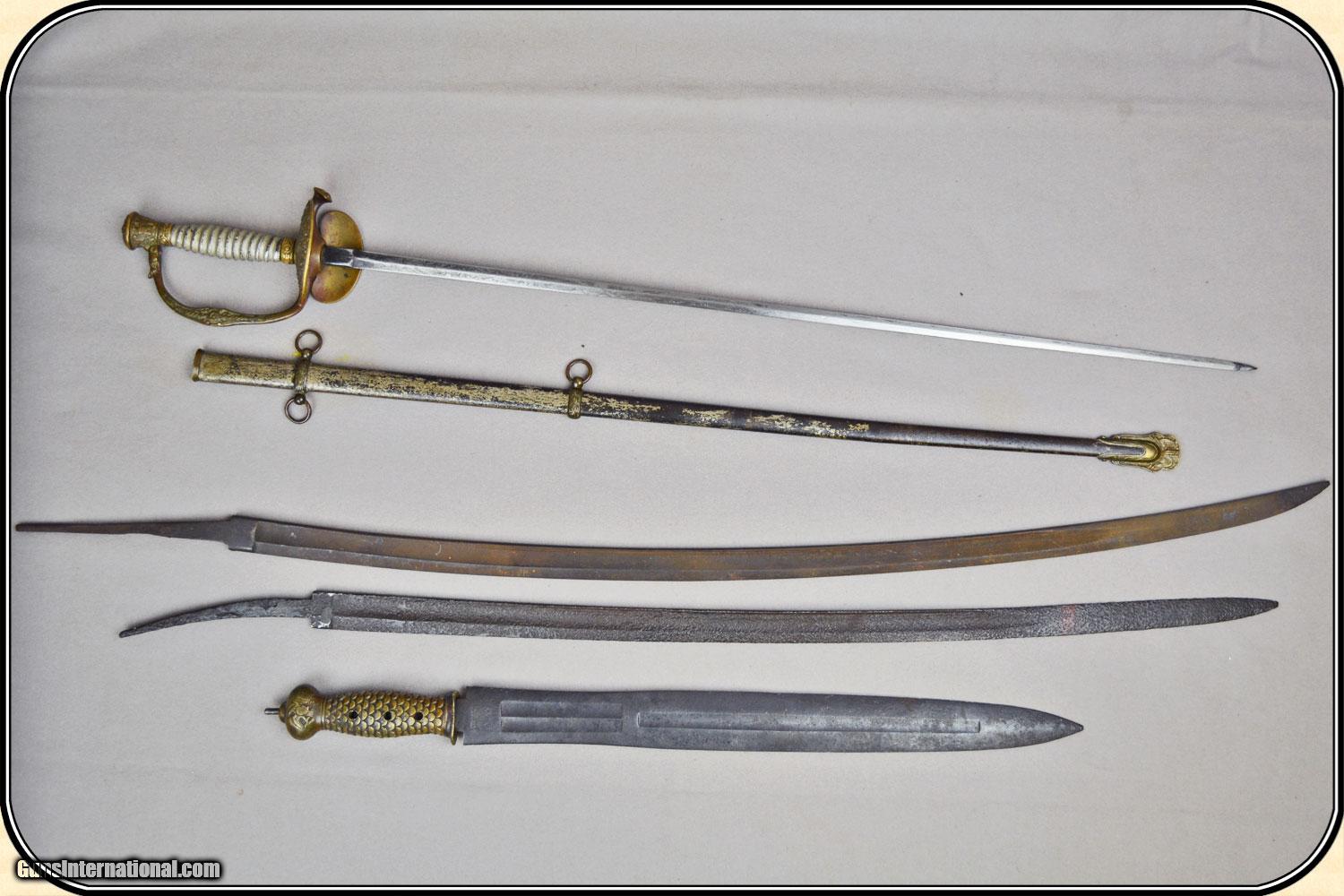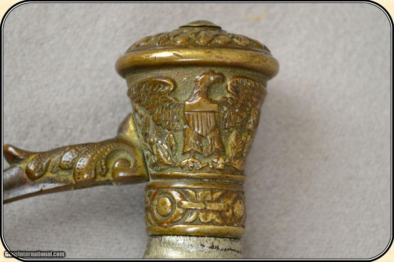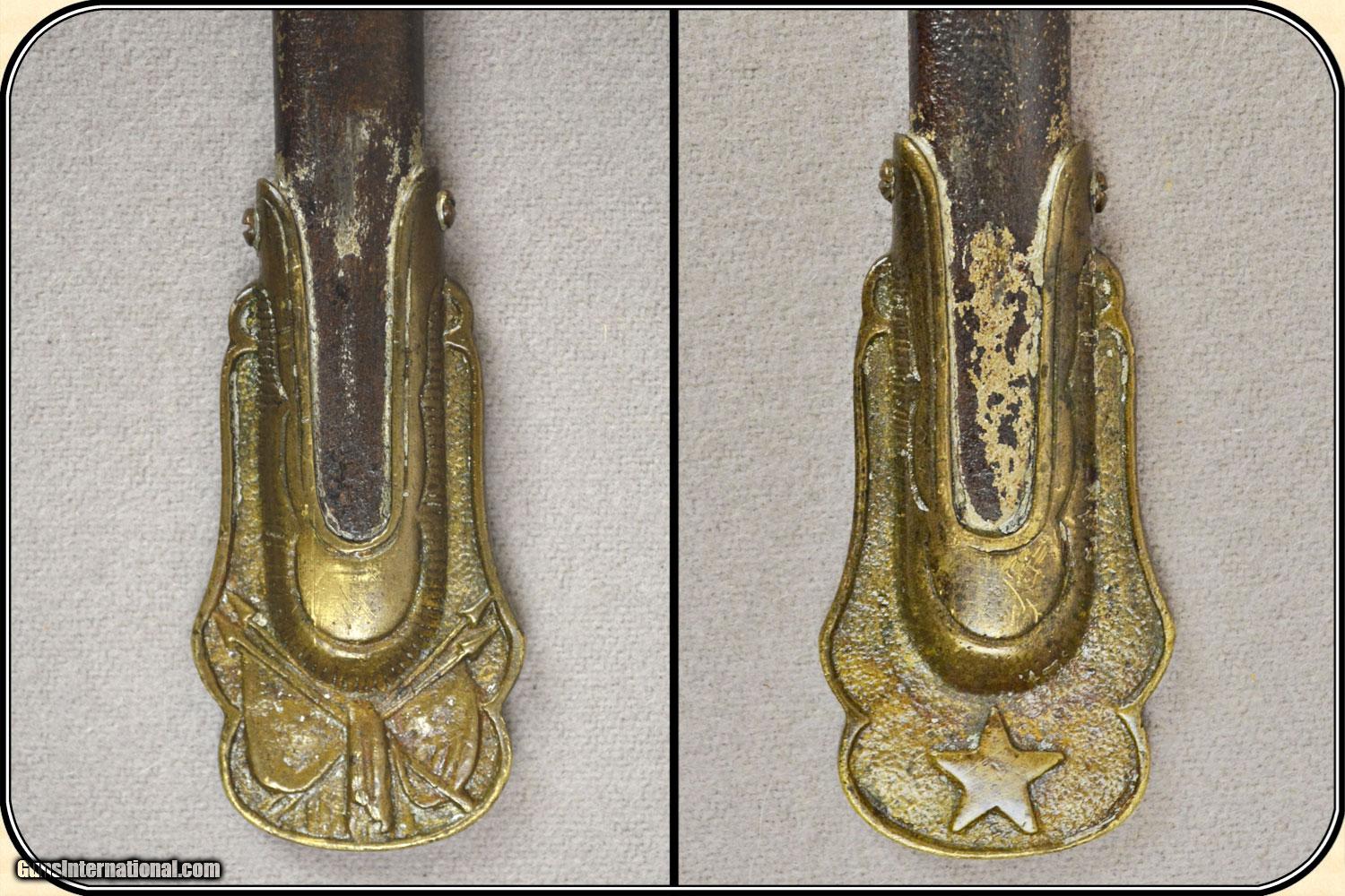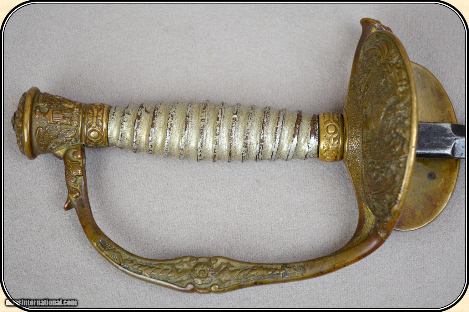 Description: The U.S. Model 1860 Staff & Field Officer Sword. This model was worn by officers in the rank of major and above, and by more junior officers filling staff positions. It was designed to replace the heavier and much sturdier Model 1850 Staff & Field Officer Sword. The shark skin handle cover and wire wrap are missing, but the wood grip is in place and not cracked. The sheath does have a lot of patina, but is solid. The etchings on the blade is faint but visible. The hilt has an ornately decorated "clamshell" folding guard embossed with an American Eagle and Stand of Arms.Federal officers carried the M1860 Staff & Field Officer's Sword during the Civil War and Indian Wars.Also included are 3 Battle field dug ups / pick ups. PAYMENT Cash, postal money order, cashiers check, personal & business checks. May order at riverjucntion on-line with credit card. SOLD |