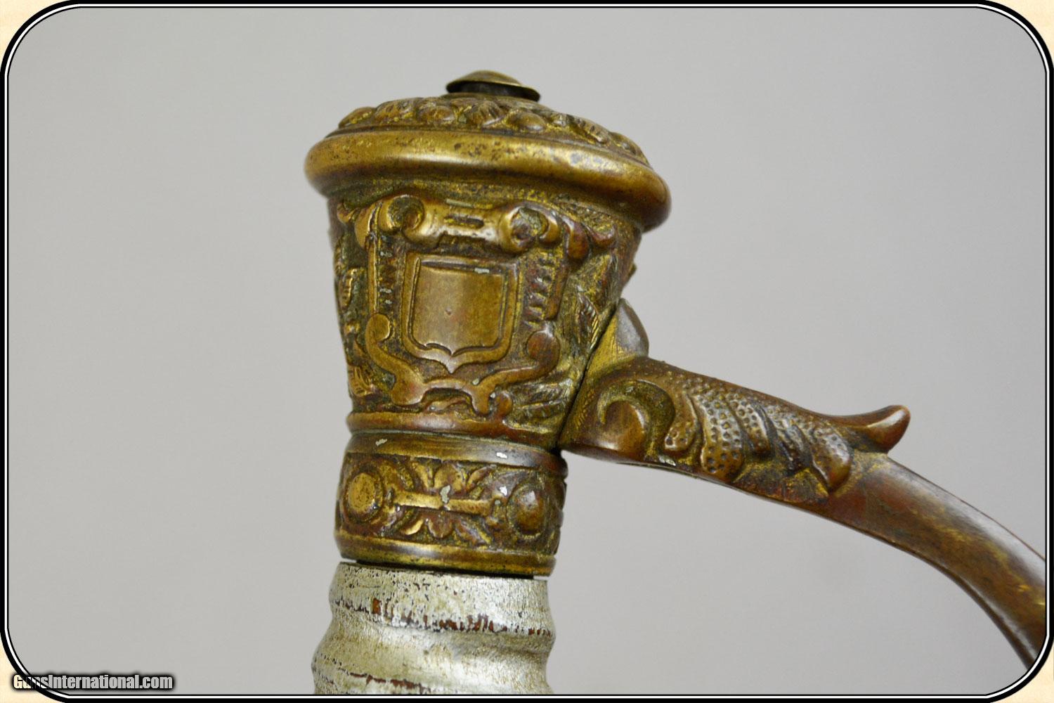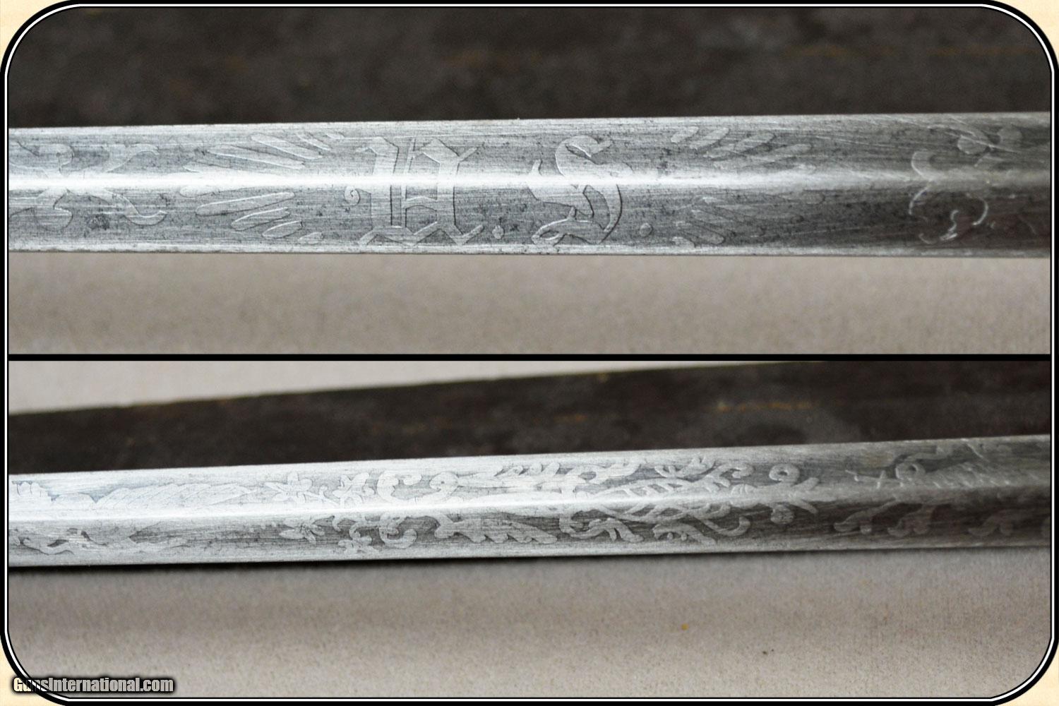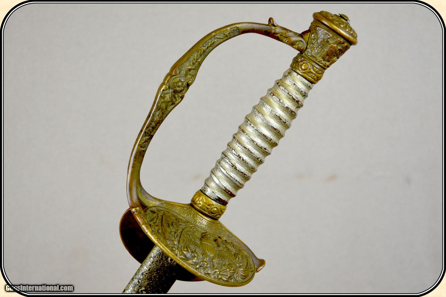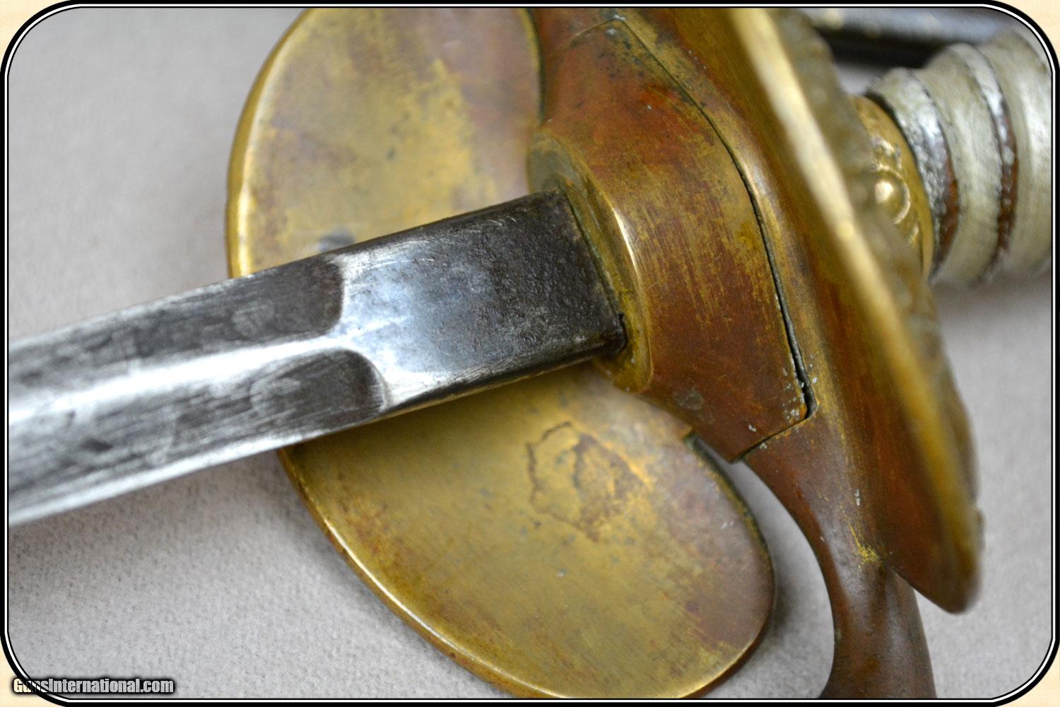 Description: The U.S. Model 1860 Staff & Field Officer Sword. This model was worn by officers in the rank of major and above, and by more junior officers filling staff positions. It was designed to replace the heavier and much sturdier Model 1850 Staff & Field Officer Sword. The shark skin handle cover and wire wrap are missing, but the wood grip is in place and not cracked. The sheath does have a lot of patina, but is solid. The etchings on the blade is faint but visible. The hilt has an ornately decorated "clamshell" folding guard embossed with an American Eagle and Stand of Arms.Federal officers carried the M1860 Staff & Field Officer's Sword during the Civil War and Indian Wars.Also included are 3 Battle field dug ups / pick ups. PAYMENT Cash, postal money order, cashiers check, personal & business checks. May order at riverjucntion on-line with credit card. SOLD |