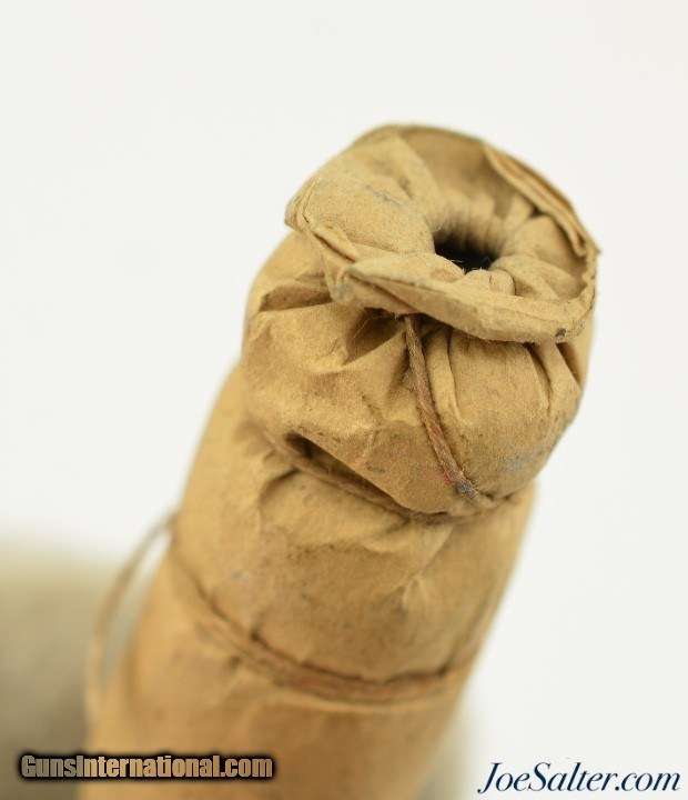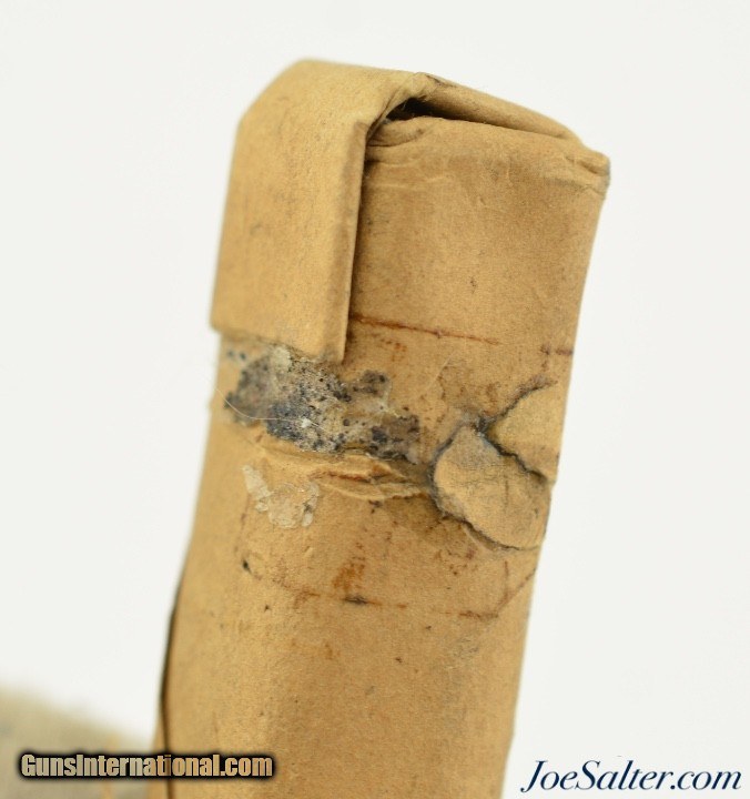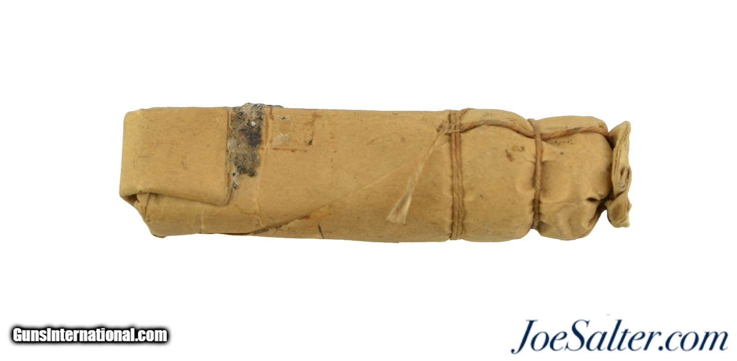 Description: This is an original Civil War .69 caliber buck and ball paper wrapped cartridge. The twine tied paper cartridge remains in excellent condition with some age darkening and a spot where a sticky tag was removed. Comes in a collector tube ready for display. Price: $65.00 Contact Seller |