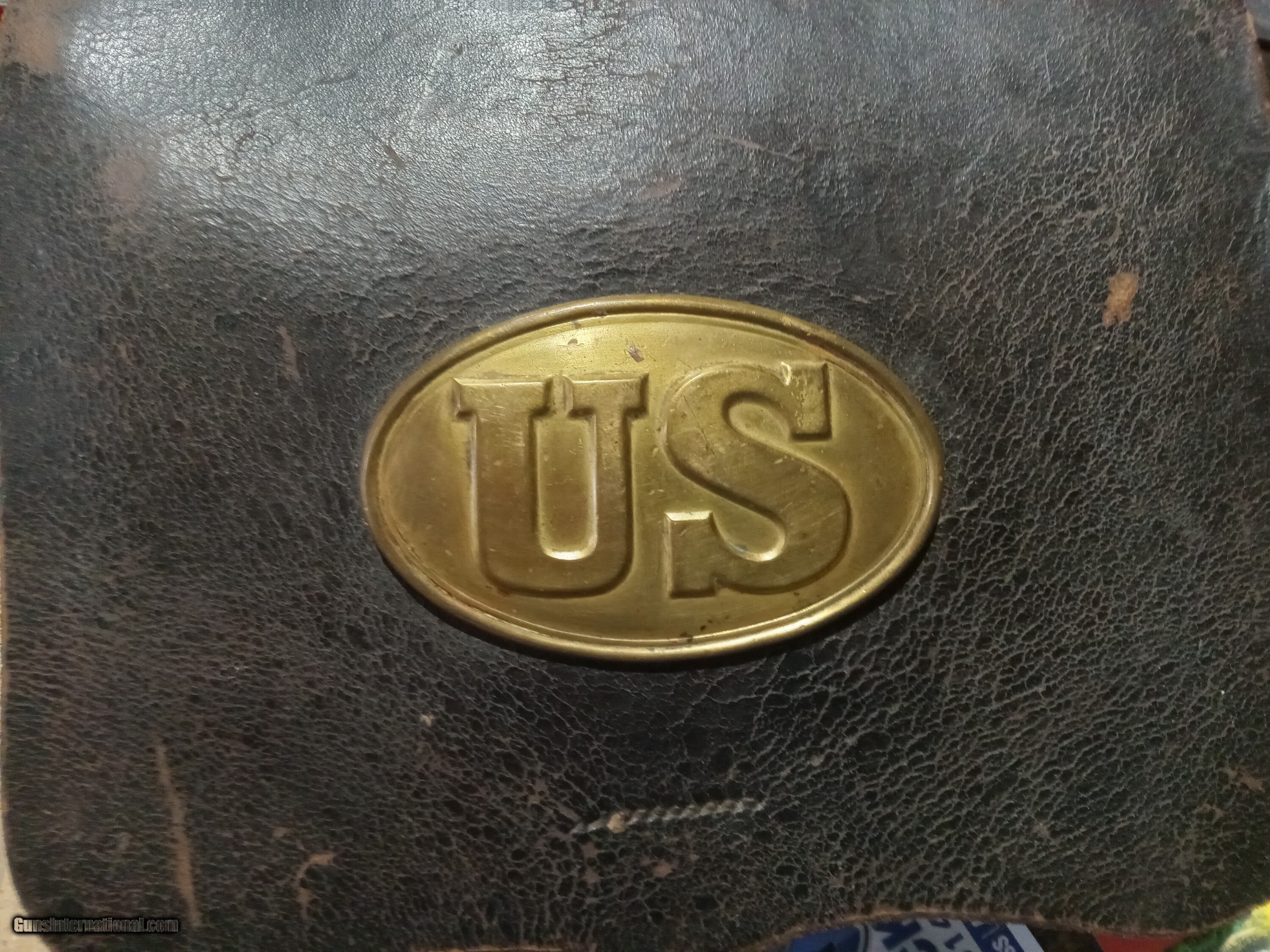 Original Civil War cartridge box, sling, and plates with soldiers name.