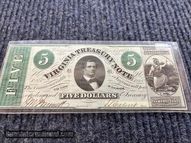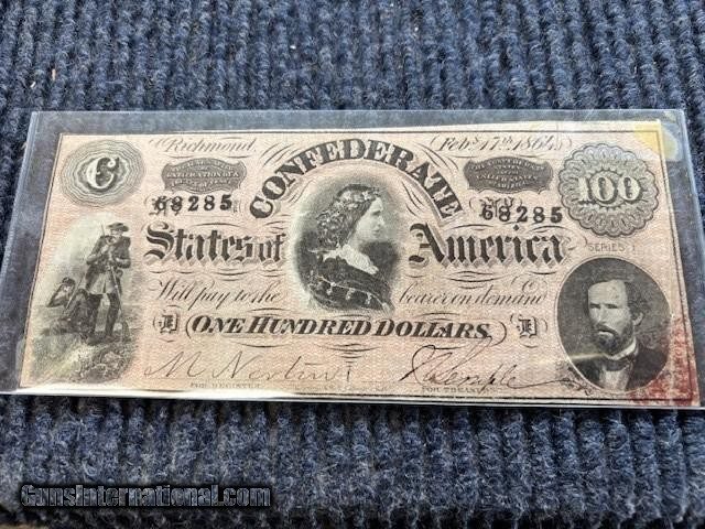 Description: Excellent condition Confederate currency with clear text and images: Confederate States $100 treasury note, and Virginia State $5 note. $95 listed price is for both notes with free shipping to a purchaser in the continental USA. Payment by Zelle, USPS money order or check (shipment once check clears). SOLD |