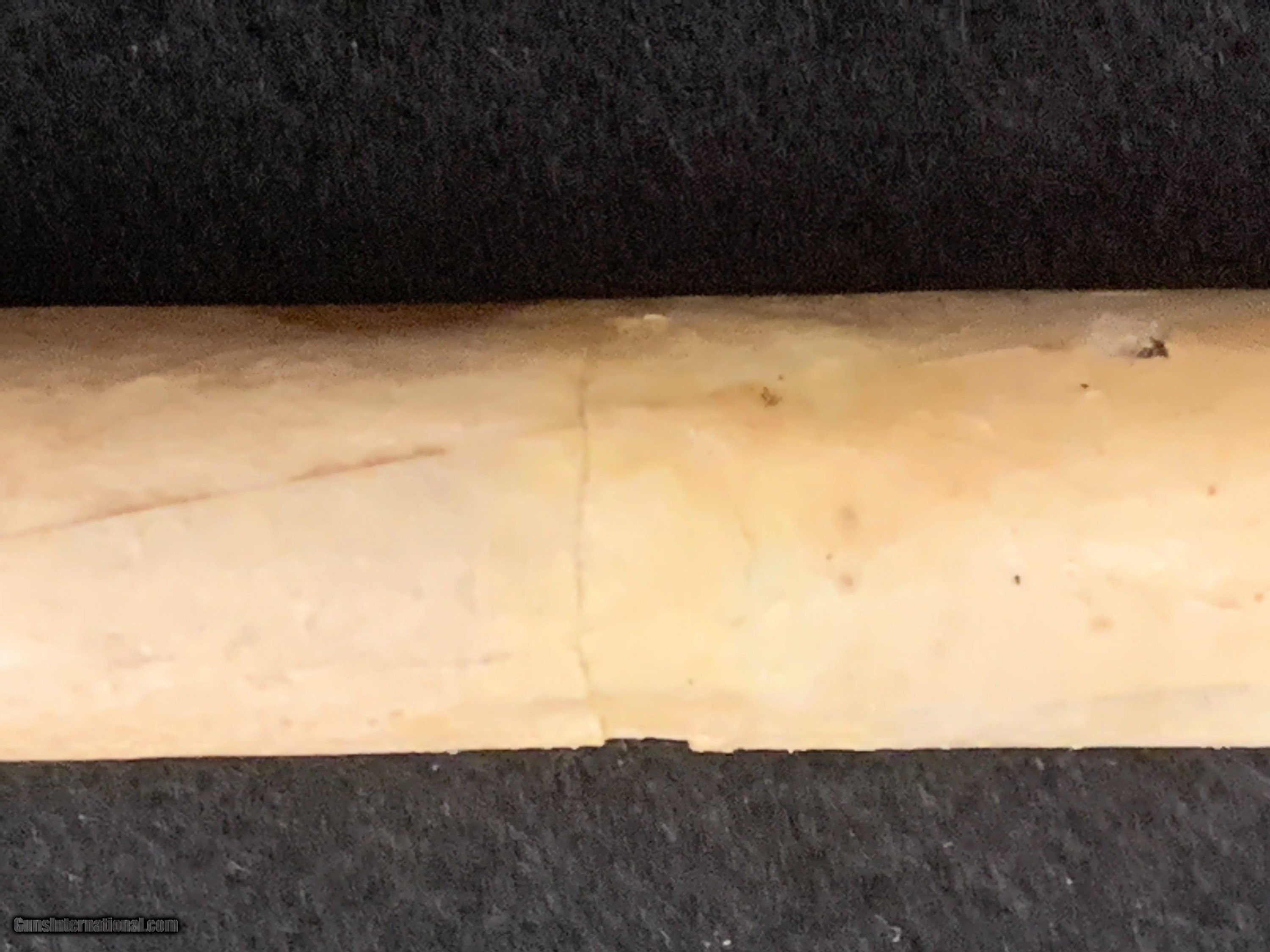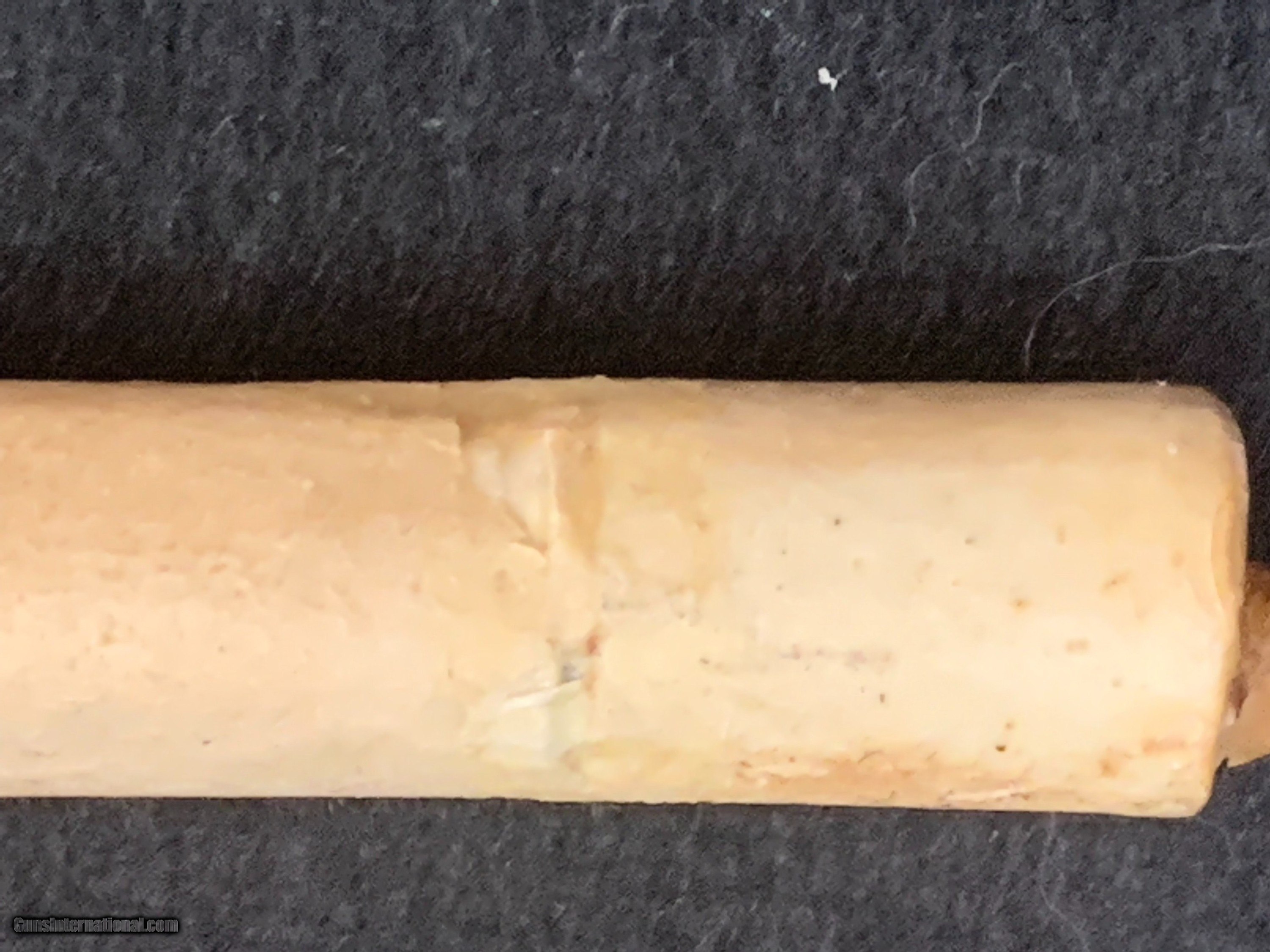 Description: ORIGINAL CIVIL WAR P-53 BRITISH ENFIELD .577 PAPER CARTRIDGE FREE SHIPPING!! Nice example of an original Civil War .577 Enfield paper cartridge. Millions of these were run through the blockade to Confederate as well as Federal forces during the war. This one does have a repair - the paper around the projectile has been re-glued. It's not really noticeable but there none the less. Priced accordingly. I've included some closeup pics of the repair. Please keep in mind that those photos are at maximum zoom. Only a very few grains of powder were lost. Not enough to make a difference in volume. Other than that it's all original. The wax dipped coating on the projectile end doesn't show in photos because it isn't darker but it's clearly there. No maker mark. If it ever had any it's long been AWOL. Measures 3" long. This is a bargain price for an original Enfield cartridge! Nice original cartridge to display next to your P53, P58 or P60 Enfield! CARTRIDGE WILL BE SHIPPED IN A PROTECTIVE PLASTIC TUBE. ALL SALES FINAL - RETURNS NOT ACCEPTED!! PAYMENT DUE WITHIN 5 DAYS OF PURCHASE. NO INTERNATIONAL SALES OR SHIPPING. PERSONAL CHECKS MUST CLEAR MY BANK ACCOUNT PRIOR TO SHIPMENT. PLEASE NOTE: I NO LONGER ACCEPT "MONEYGRAM" OR OTHER "CORNER STORE" MONEY ORDERS. SOLD |