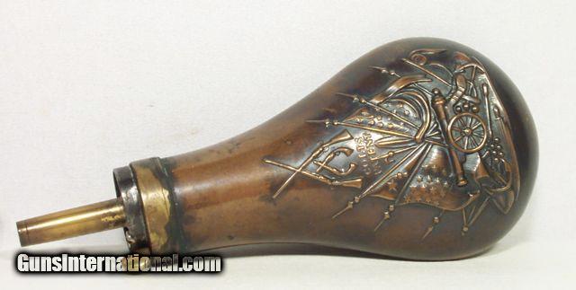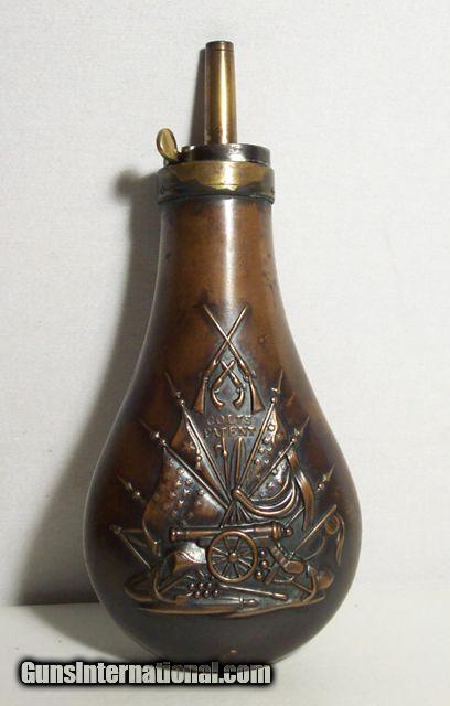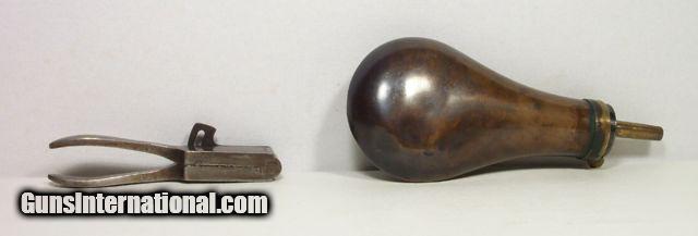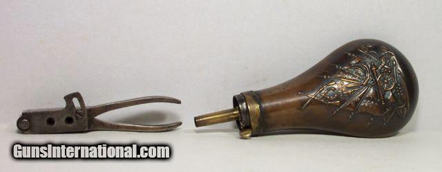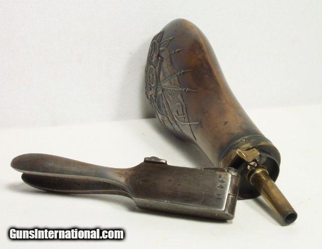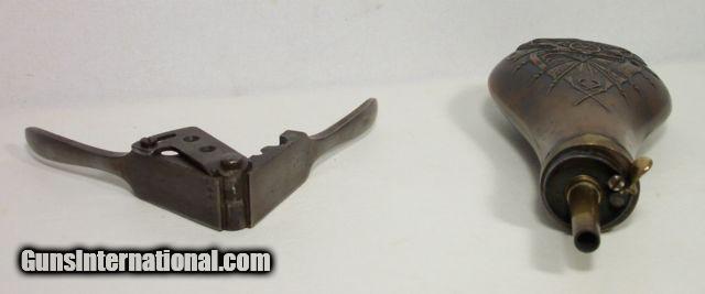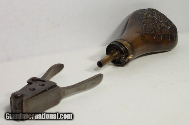 Description: SOLD!! Original Colt Powder Flask & 44 cal. Bullet Mold; flask is 7 ½” length overall & 3 ½” wide; very NICE overall condition; works as should; out of a Texas estate; antique, no FFL/C&R required for shipping; All items shipped fully insured Priority Mail- -Shipping & handling $30 (Texas residents please add 6.75% sales tax); return policy: three days inspection from the date the item is received; full refund of shipping both ways ONLY IF THE ITEM IS MISREPRESENTED. Note: International sales only as laws permit. Will ship C&R eligible items to C&R license. Antiques shipped without license to anyone EXCEPT New Jersey and City of New York where a FFL is required. SOLD |
