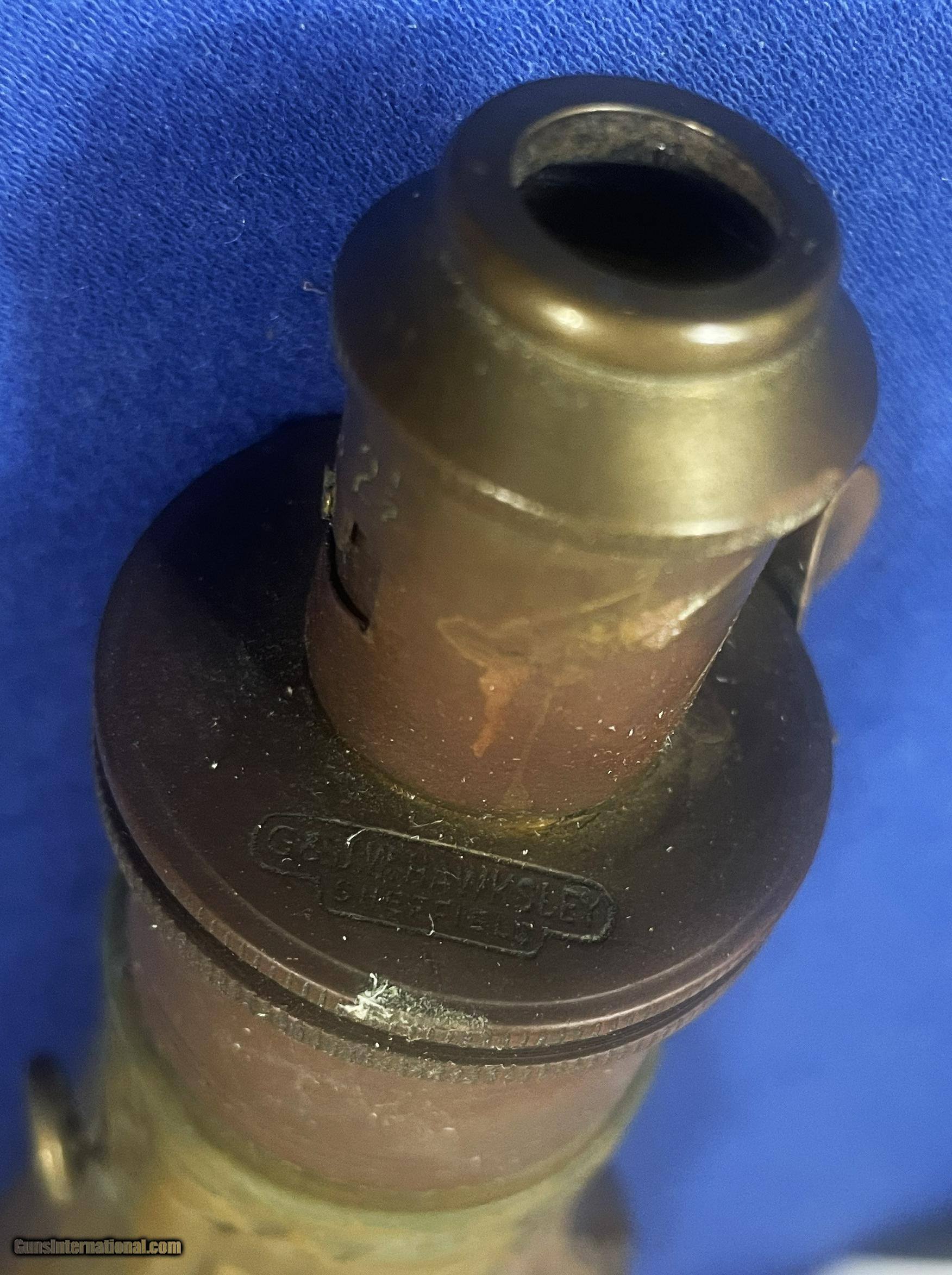 Description: ESPECIALLY NICE HAWKSLEY POWDER FLASK ORIGINAL PATINA SURFACES, WORKS PROPERLY, TOP SCREWS OFF TO FILL. 2 1/2 TO 3 1/4 DRAM MEASURE. PERFECT FOR SHOTGUN, MUSKET or BIG BORE RIFLE. TIGHT SEAMS EXCELLENT OVERALL CONDITION. $15.00 S&H SEE SELLERS OTHER LISTINGS AND COMBINE SHIPPING. Price: $170.00 Buy Now Contact Seller |