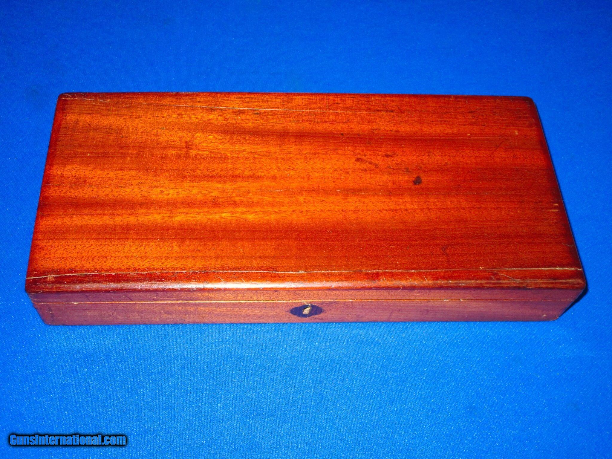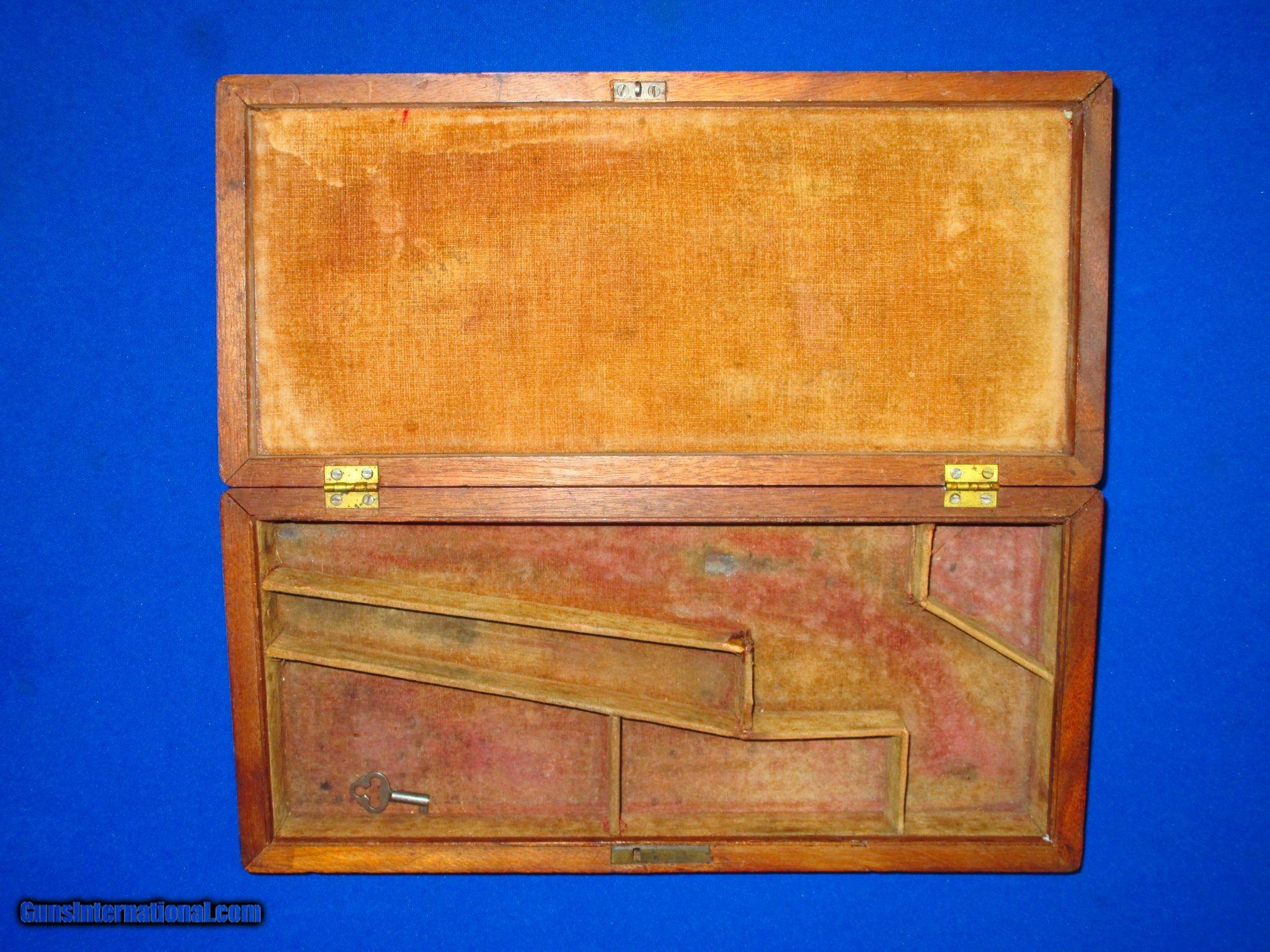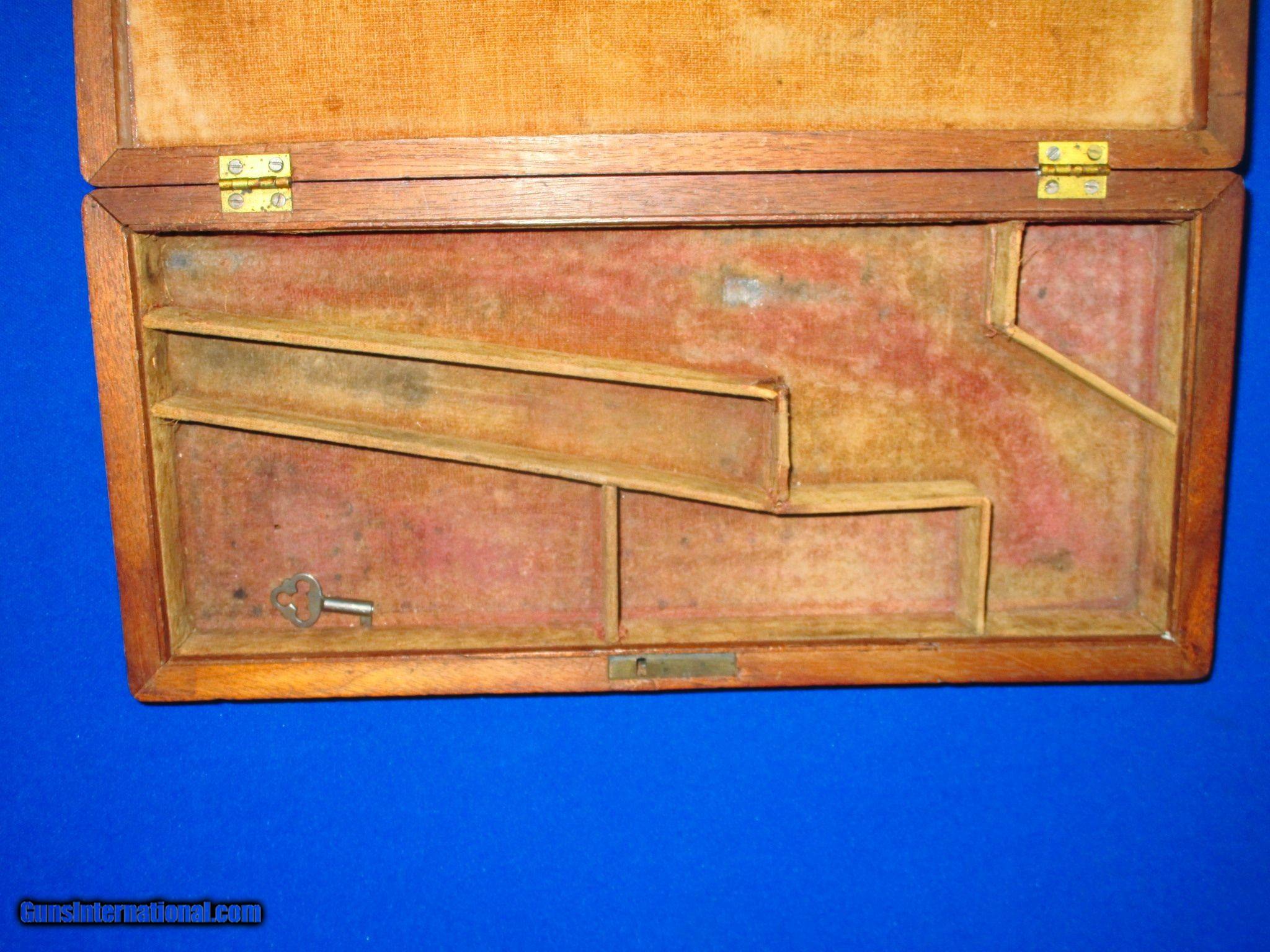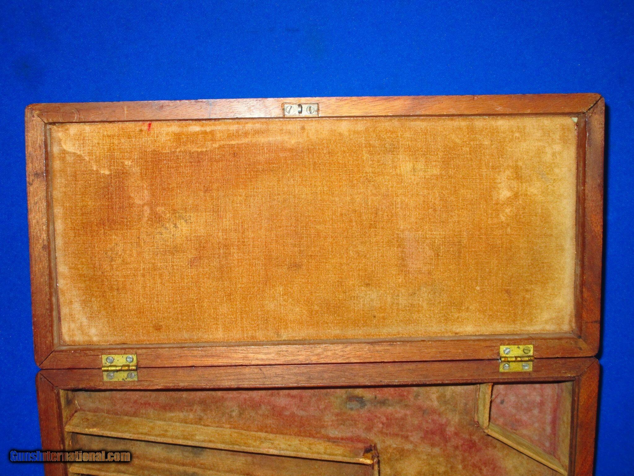 Description: An Original & Scarce Civil War Colt Factory Case For A Model 1862 Percussion Police Revolver With A 6 1/2 Inch Barrel In Nice Untouched Condition. All original and complete. The case has a nice interior and all partitions are original and very nice as shown. The hinges are also original. The outer shell of the box is nice throughout with a nice color to it. There are three very thin check lines in the top veneer of the box. These check are very thin and very light and tight. The box shows no warping in it. The box has its original key with it. This is A Very Nice Example Of An All Original And Hard To Find Factory Case For A 6 1/2 Inch Percussion Colt Model 1862 Police Revolver That Is In Nice Untouched Condition! SOLD |