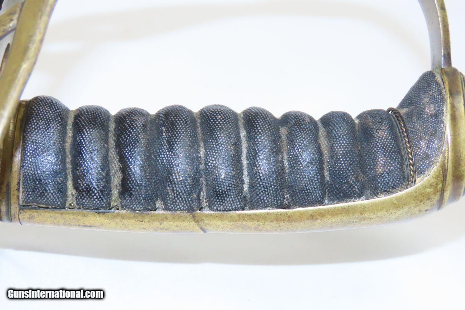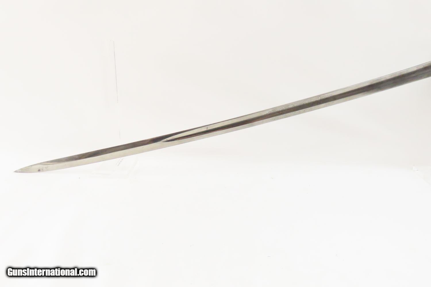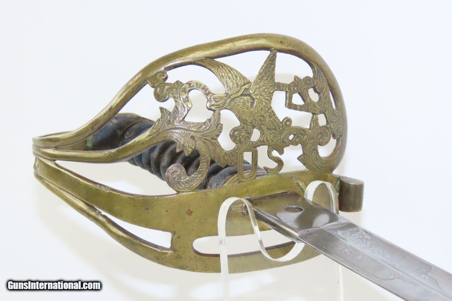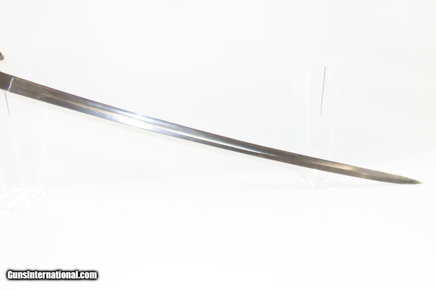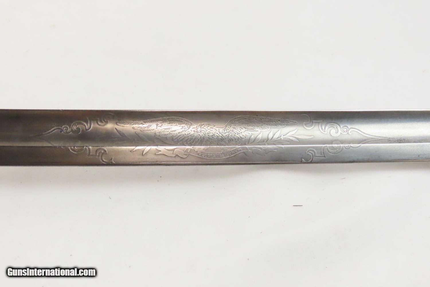 Description: PATRIOTIC US CIVIL WAR Saber by CLAUBERG of SOLINGEN w FEDERAL EAGLES c1861 Etched Private Purchase Officer’s Sword from Prussia Here we present an antique Patriotic Officer’s Saber by Clauberg, made circa 1861 in Solingen, Prussia. This blade is deeply etched with patriotic American symbolism on both sides. One panel is marked “U.S” while the other features a large federal eagle with spread wings and “E PLURIBUS UNUM” in a banner in its clutches. The hand guard likewise has this motif case into it for a particularly handsome appearance. This Latin motto is featured on the Great Seal of the United States and translates to “out of many, one”. This phrase was and remains important to this country which is united though made of many different states. It held a special significance during the American Civil War as this was a conflict centered around member states’ ability to leave the union. The overall length is 37-1/2 inches with the blade measuring 31 inches. The overall condition is very good. Bright. The hilt is solid, the hand guard has a small amount of movement. The handle’s rayskin grip is firm. The scabbard is in very good condition. A fabulous piece of history in fantastic condition! Own the original! This is a legitimate antique and not a reproduction. Overall condition as seen in photos. Very Fast. Very Safe. FREE SHIPPING WORLDWIDE. Delivered directly to your door by express mail! Guaranteed AUTHENTIC & Includes CERTIFICATE OF AUTHENTICITY. ancestryguns $1345 #20778 SOLD Antique: Yes |