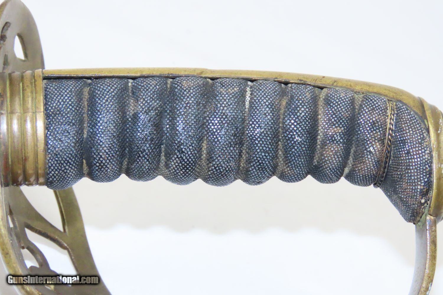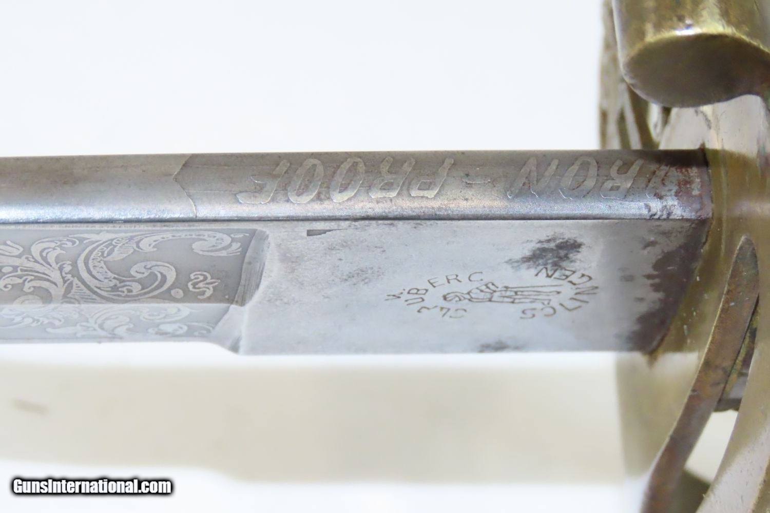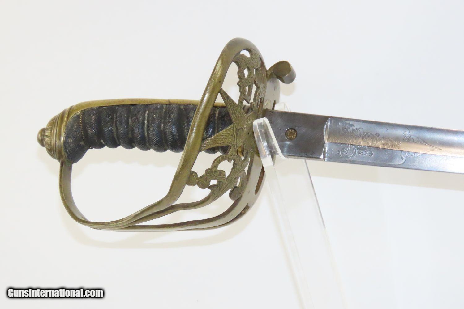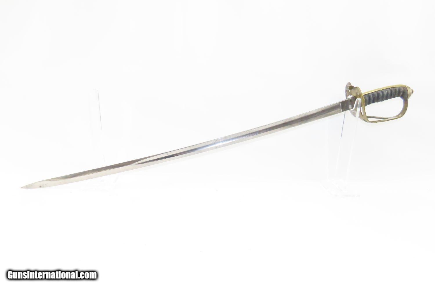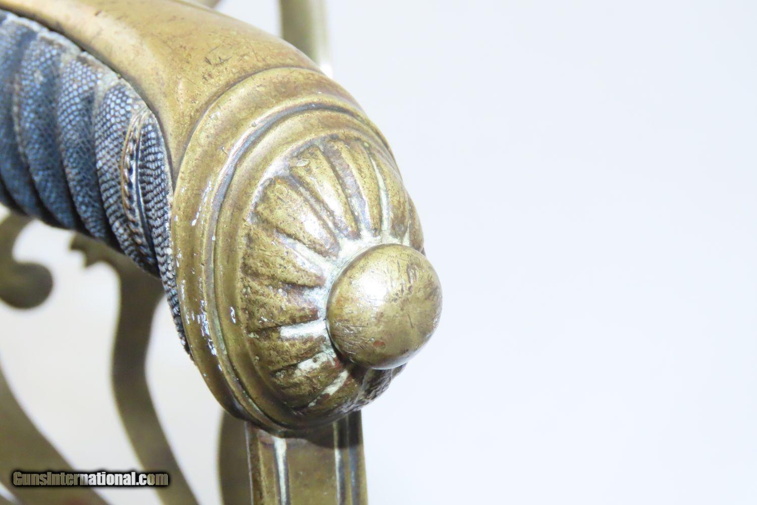 Description: PATRIOTIC US CIVIL WAR Saber by CLAUBERG of SOLINGEN w FEDERAL EAGLES c1861 Etched Private Purchase Officer’s Sword from Prussia Here we present an antique Patriotic Officer’s Saber by Clauberg, made circa 1861 in Solingen, Prussia. This blade is deeply etched with patriotic American symbolism on both sides. One panel is marked “U.S” while the other features a large federal eagle with spread wings and “E PLURIBUS UNUM” in a banner in its clutches. The hand guard likewise has this motif case into it for a particularly handsome appearance. This Latin motto is featured on the Great Seal of the United States and translates to “out of many, one”. This phrase was and remains important to this country which is united though made of many different states. It held a special significance during the American Civil War as this was a conflict centered around member states’ ability to leave the union. The overall length is 37-1/2 inches with the blade measuring 31 inches. The overall condition is very good. Bright. The hilt is solid, the hand guard has a small amount of movement. The handle’s rayskin grip is firm. The scabbard is in very good condition. A fabulous piece of history in fantastic condition! Own the original! This is a legitimate antique and not a reproduction. Overall condition as seen in photos. Very Fast. Very Safe. FREE SHIPPING WORLDWIDE. Delivered directly to your door by express mail! Guaranteed AUTHENTIC & Includes CERTIFICATE OF AUTHENTICITY. ancestryguns $1345 #20778 SOLD Antique: Yes |