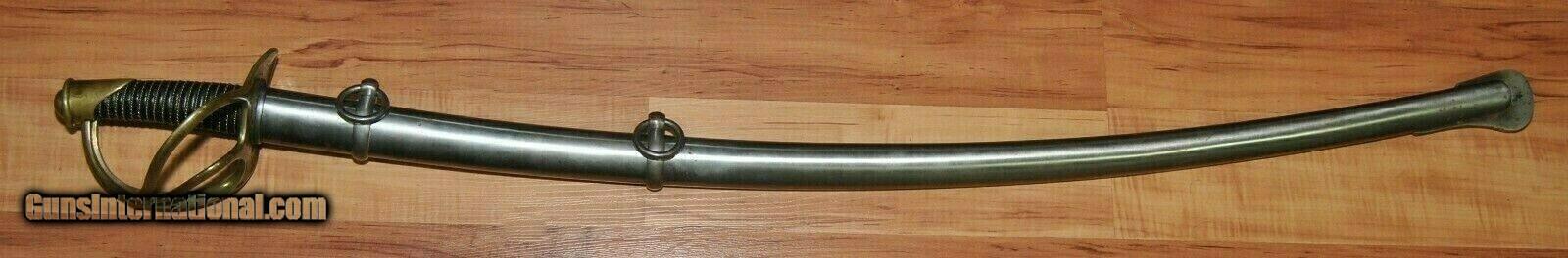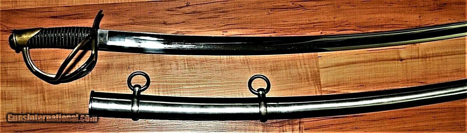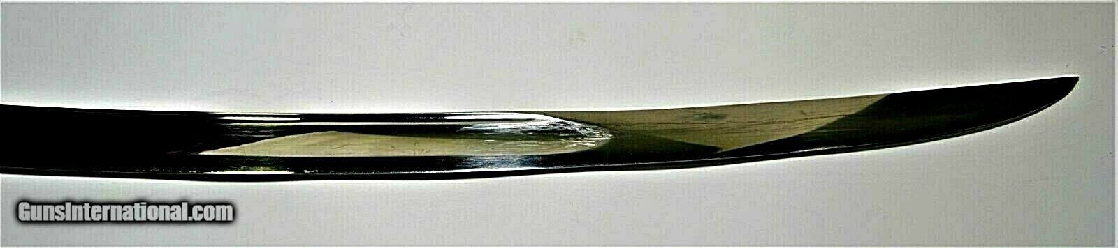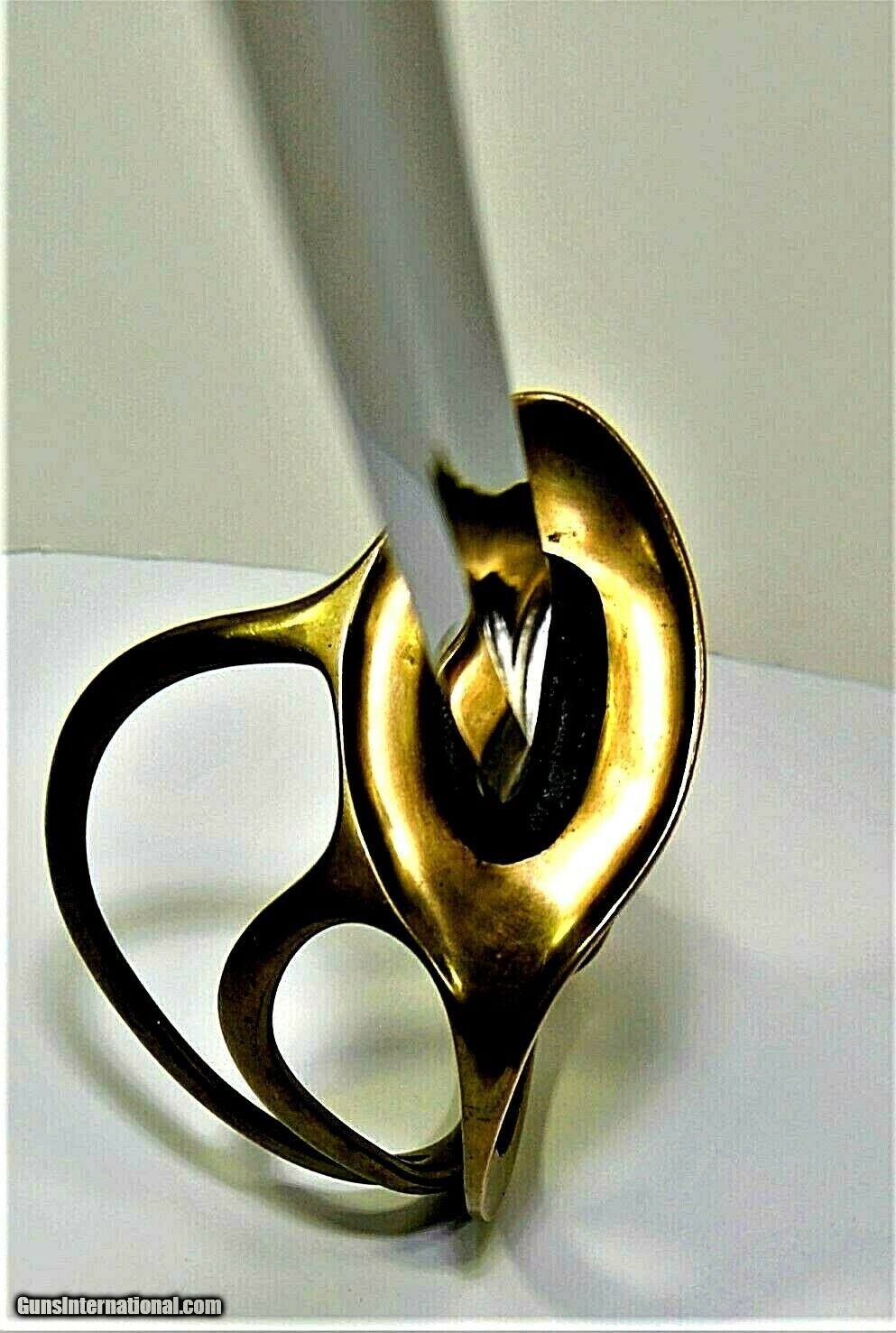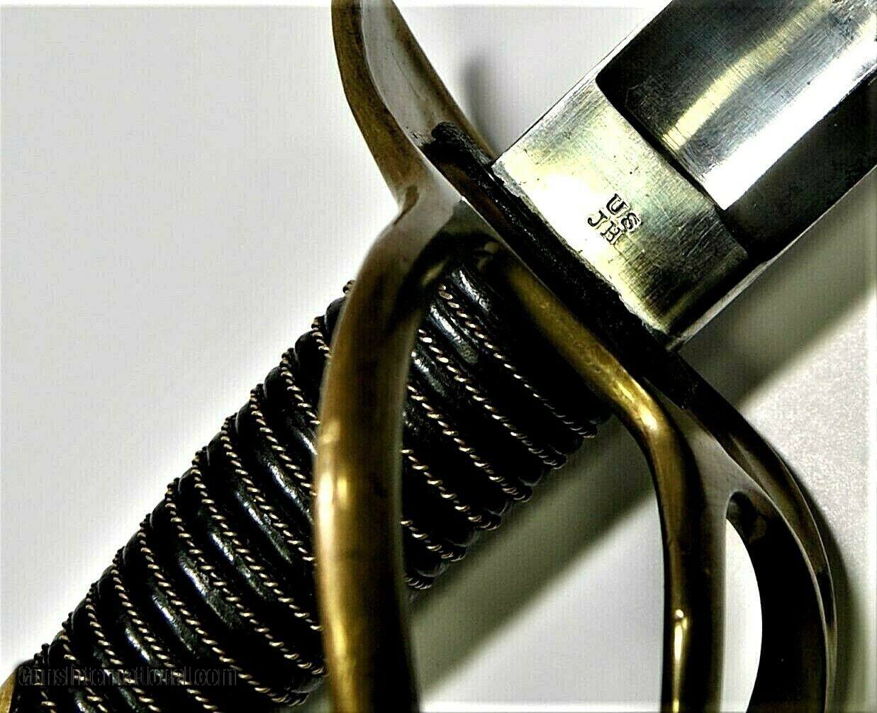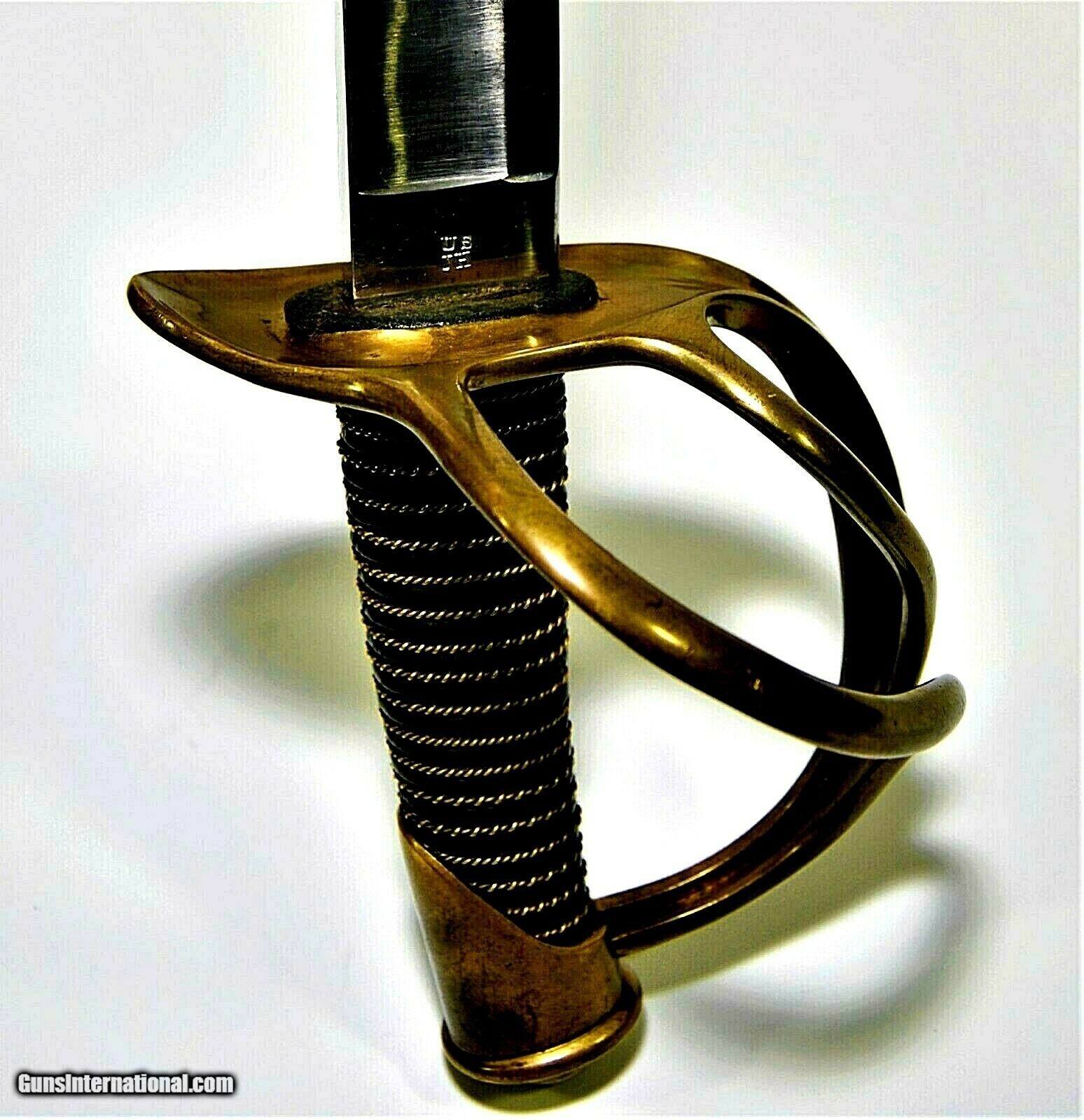 Description: USE FREE N EZ LAYAWAY PLAN - NEVER A FEE This stunner Presents in UN Used Condition 41 1/2'' overall length, 35 1/2'' curved single-edged blade with wide stopped and narrow partial unstopped fullers and a trailing point. The ricasso is crisply marked ''N.P. Ames / Cabotville / 1846'' on the reverse face and ''US / JH'' on the obverse. The blade exhibits a near-perfect mirror finish, appearing factory mint at a glance. The tiniest handling marks are revealed under close inspection. No real hints of expected scabbard wear; this blade is in positively stunning condition, without a doubt the best example this writer has seen in over 50 years. The brass has a beautiful pale burnished goldenrod patina. The grip is in mint condition with no discernible blemishes. The included steel scabbard is bright and unblemished, also exhibiting a pristine beautiful satin sheen. Truly an incredible example, this sword is superb and will be the center of almost any edged weapon collection. SOLD |
