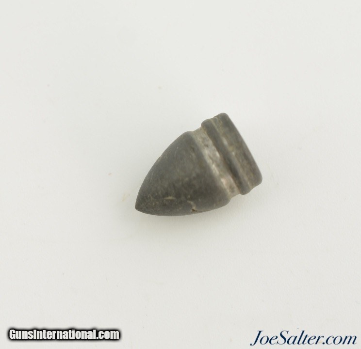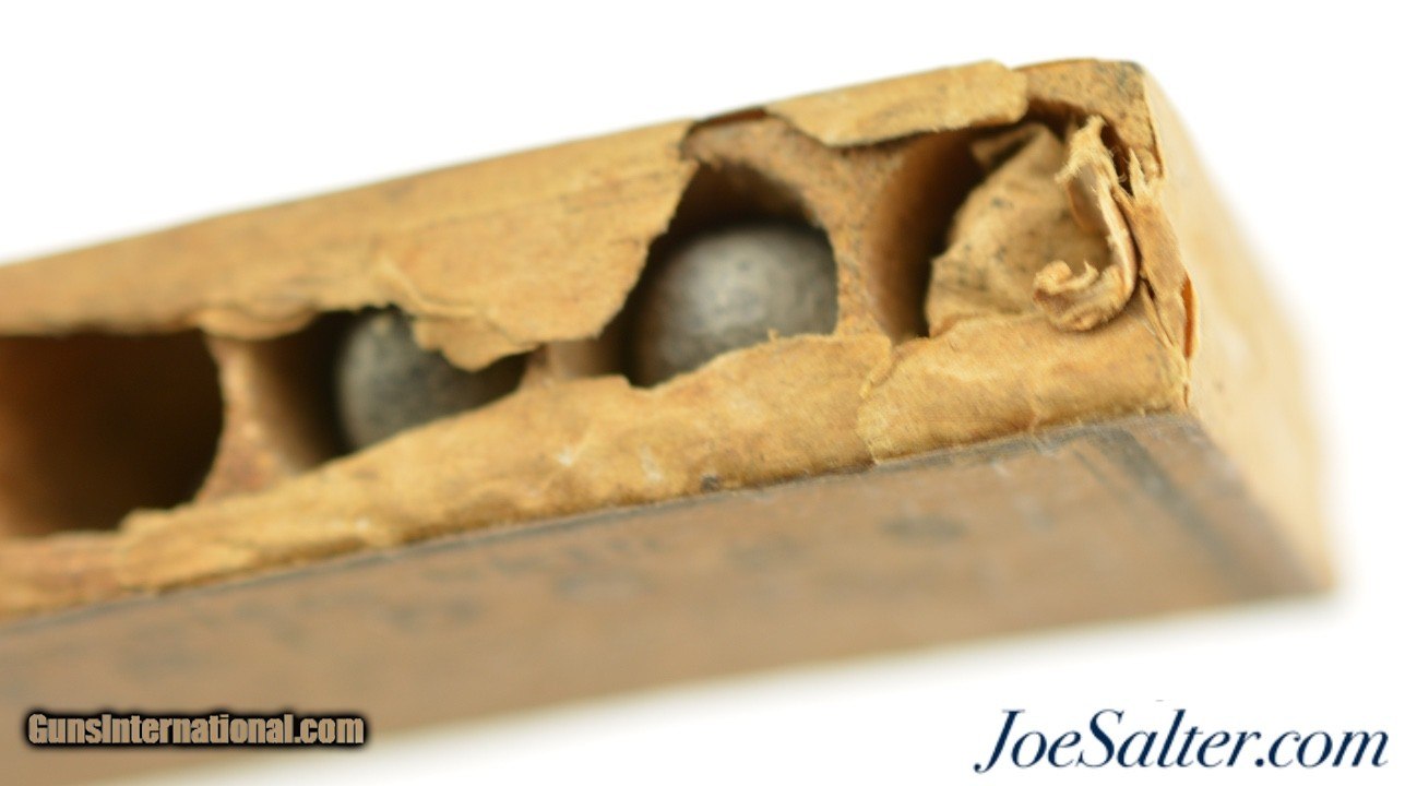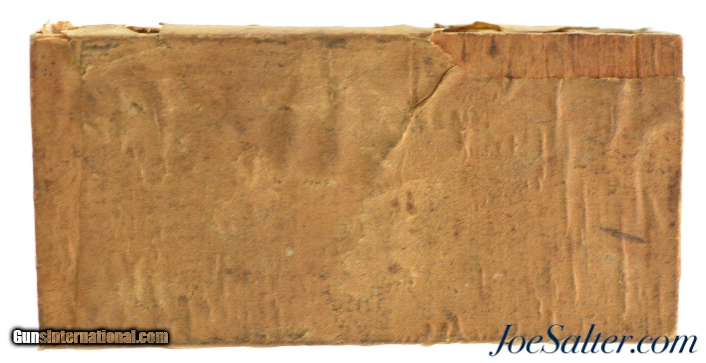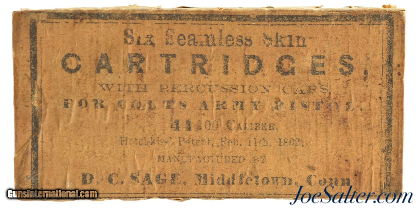 Description: This is a full packet, "Six Seamless Skin" cartridges, of .44 Caliber ammo "FOR COLT'S ARMY PISTOL" manufactured by D.C. Sage in Middletown, Connecticut who was in business from 1861-1866 using the Julius Hotchkiss (a principal in the business), No. 34,367 patent from February 11, 1862 for "Improvement in Skin Cartridges". The paper wrapped wood ammo packet is full with at least 4 of the skin cartridges being replaced by lead bullets with paper underneath and the original packet of percussion caps. It looks like the other 2 rounds could be original. The packet has about 90+% of the outer wrapper remaining with very good graphics on the front with an opening along the top allowing a look inside at the bullet tips and paper packet of percussion caps in the 7th hole. A great looking and rarely seen Civil War percussion packet specifically for the Colt Army revolver. Price: $295.00 Contact Seller |