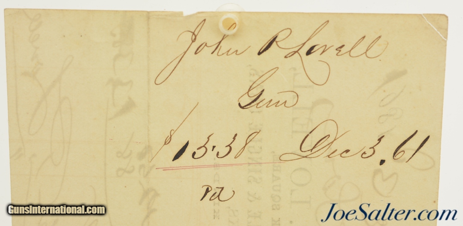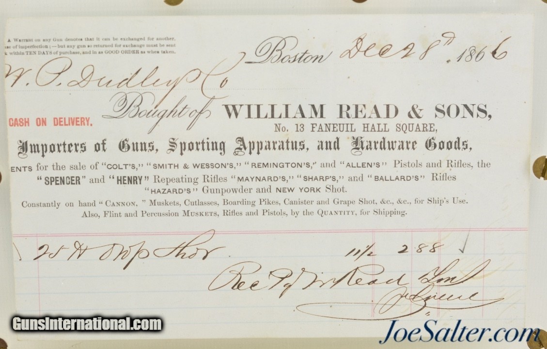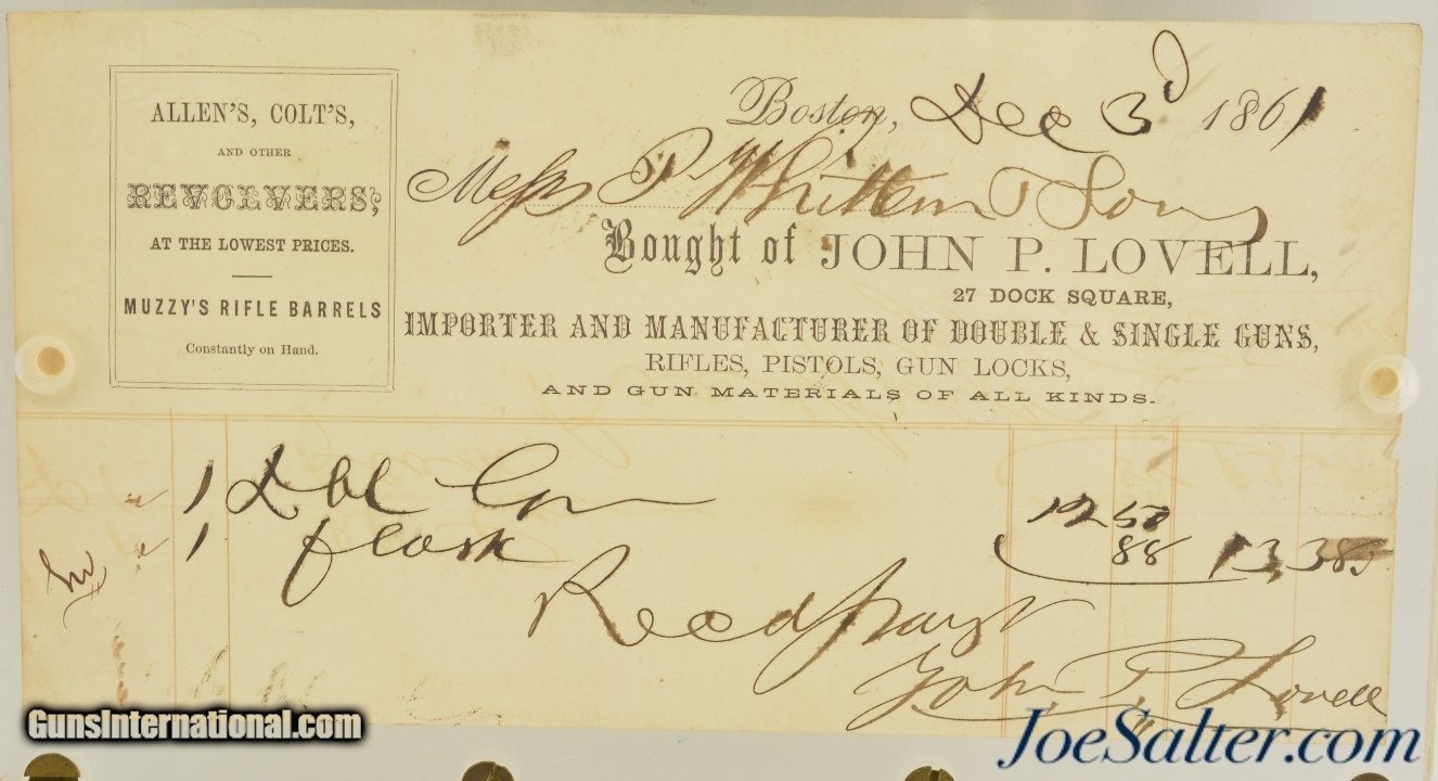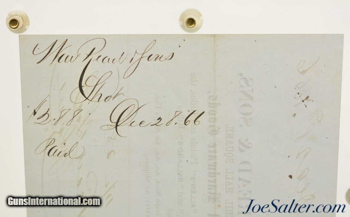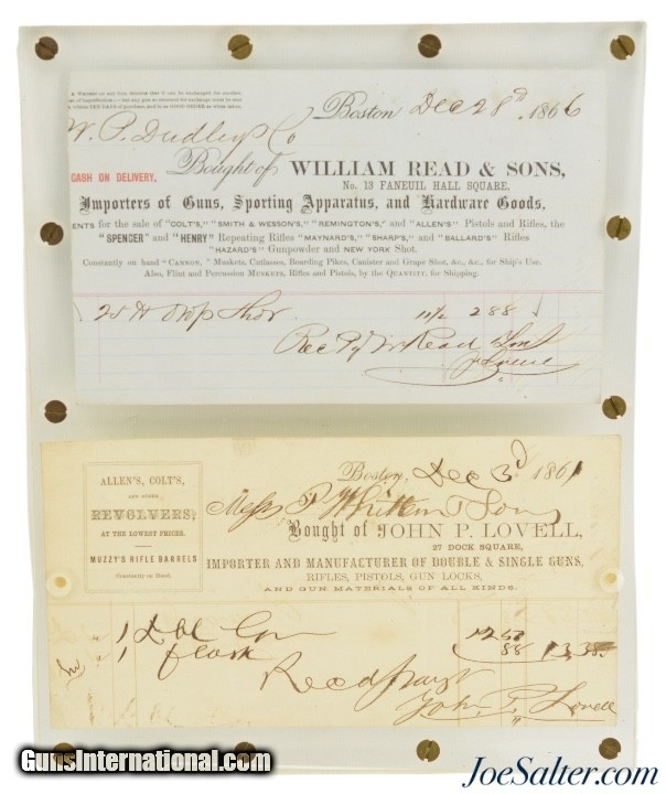 Description: This is a framed collection of two Civil War era receipts from well known gun and sporting goods companies. Included is a receipt dated Dec. 28th, 1866 from William Read & Sons at No. 13 Faneuil Hall Square, Boston with the known as "Importers of Guns, Sporting Apparatus, and Hardware Goods" with a list of gun makers available including Colt, Smith & Wesson, Remington, Allen, Spencer, Henry Maynard, Sharps and Ballard. The other receipt is dated Dec. 3rd, 1861 from John P. Lovell of 27 Dock Square, Boston and was "Importer and Manufacturer of Double & Single Guns, Rifles, Pistols, Gun Locks" listing specifically Allen and Colt revolvers. These two receipts date pre and post Civil War and speak to the rapid expansion of guns during that time. A neat historical assembly with well know Massachusetts gun seller receipts. Encased between two sheets of thick plastic the preserved receipts remain in excellent condition with crisp graphics showing old staining along the right side and along the top. A great item for display in any Civil War collection or to pair with your Allen & Wheelock, Colt or other named revolver or rifle. Price: $269.00 Contact Seller |