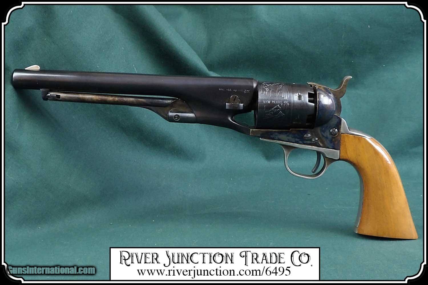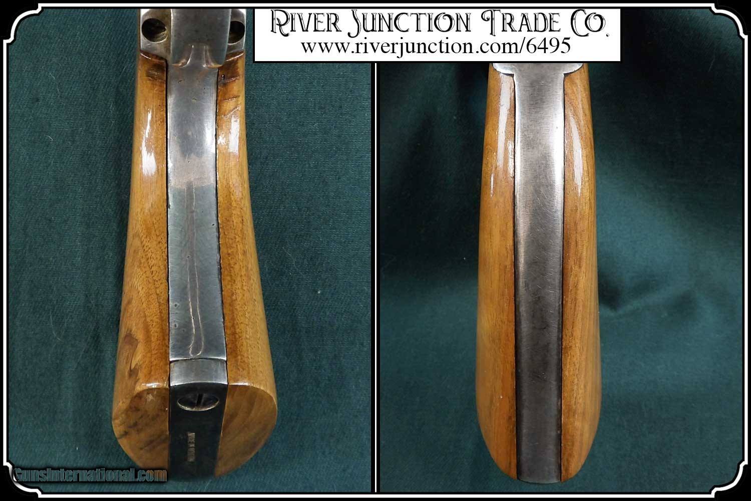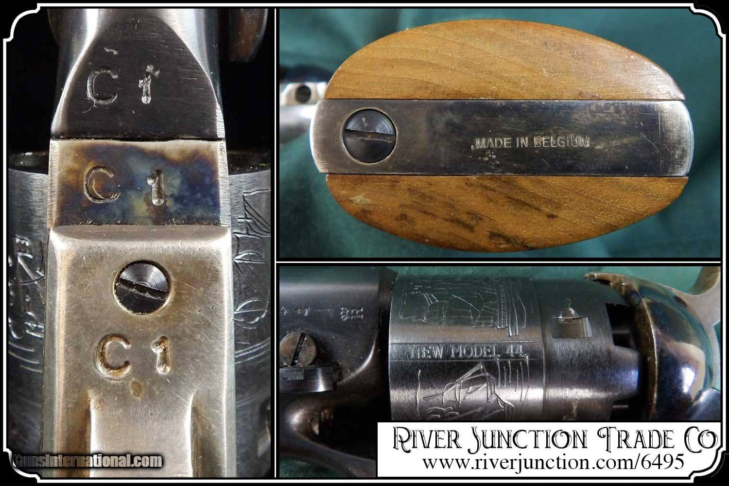 Description: Very RARE highly collectable Belgium made CIVILIAN model COLT serial number (C1) (C1) means it was the first civilian model produce in 1958. Collectors consider this a direct-line descendant from the original Civil War era .44 caliber, 1860 Colt. They feel these are more authentic in that this was the 1st production of the 1860 Colt Army since the originals used in the Civil War. In 1853 Samuel Colt traveled overseas and licensed Belgian gun manufacturers to produce his revolvers. Then one hundred years later, these companies regrouped and began producing this six shooter with modern steel. Others have copied and followed since then including the so called 2nd and 3rd generation percussion 1860 Army. The new pistols were marketed as 1960 New Model Army and were stamped Made in Belgium. At that time the upcoming centennial of the American Civil War, and no safe usable arm was available for reenactors, that all pointed to an obvious need. There to answer that need were two important ingredients, original Colt equipment waiting silently in Belgium for nearly a century and a young man by the name of William B. Edwards. Edwards was one of the principals of Centennial Arms Corp. of Chicago. Edwards realized there was a ready market for a second issue of the Colt Army. Edwards entrusted Fabriques de Armes Unies de Li_ge in Belgium with the production of the 1860 dubbed, the1960 NEW MODEL ARMY. This 1960 NMA is mechanically perfect, the finish is MINT. The bore is mint UNFIRED. The action positive and locks up tight. This gun is serial number (C1). The (C) stands for CIVILIAN MODEL. The back strap and trigger guard are SILVER PLATED and show only very light tarnish, I will leave that for you to polish if you like. The the frame, hammer, and loading leaver are color case hardened. I believe this gun has never been fired. It shows marks such as, made in Belgium on the butt, and on the top of the barrel “1960 NEW MODEL ARMY”. Payment: Item, can be ordered on line with a credit card or paypal on our sight. Just Google (riverjunction) and type in the River Junction Trade Co. item number (6495) in the search box. Before you checkout you will see shipping cost and total. OR If you prefer: Pay by cash, postal money order, cashiers check, personal & business checks. We wait for checks to clear. We always answer questions and entertain offers. Have questions? Call me 563-880-4588. Jim SOLD |