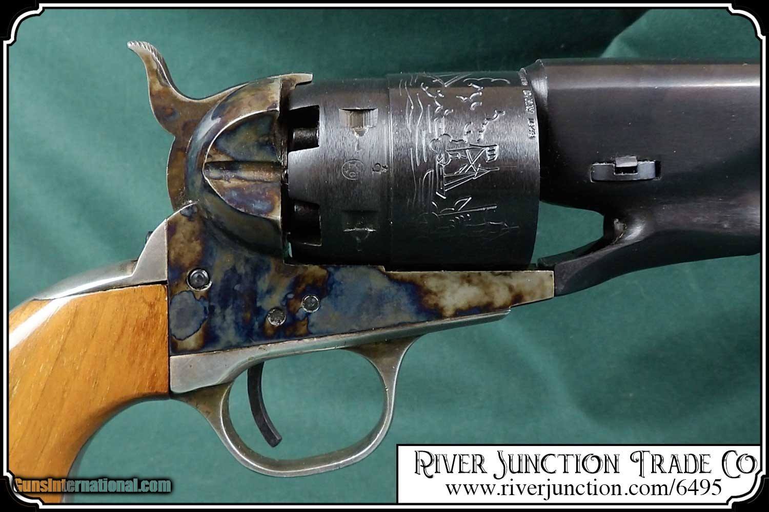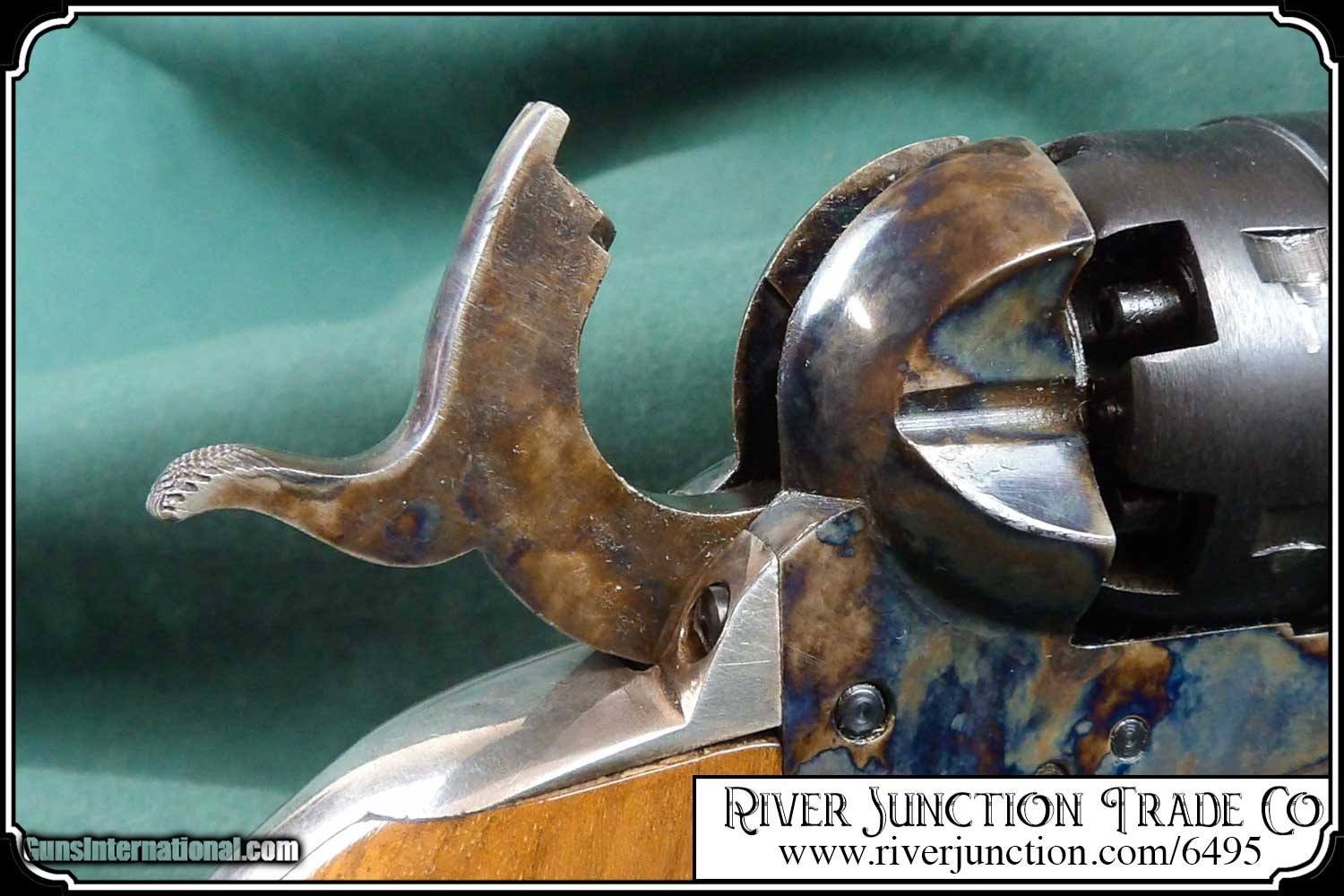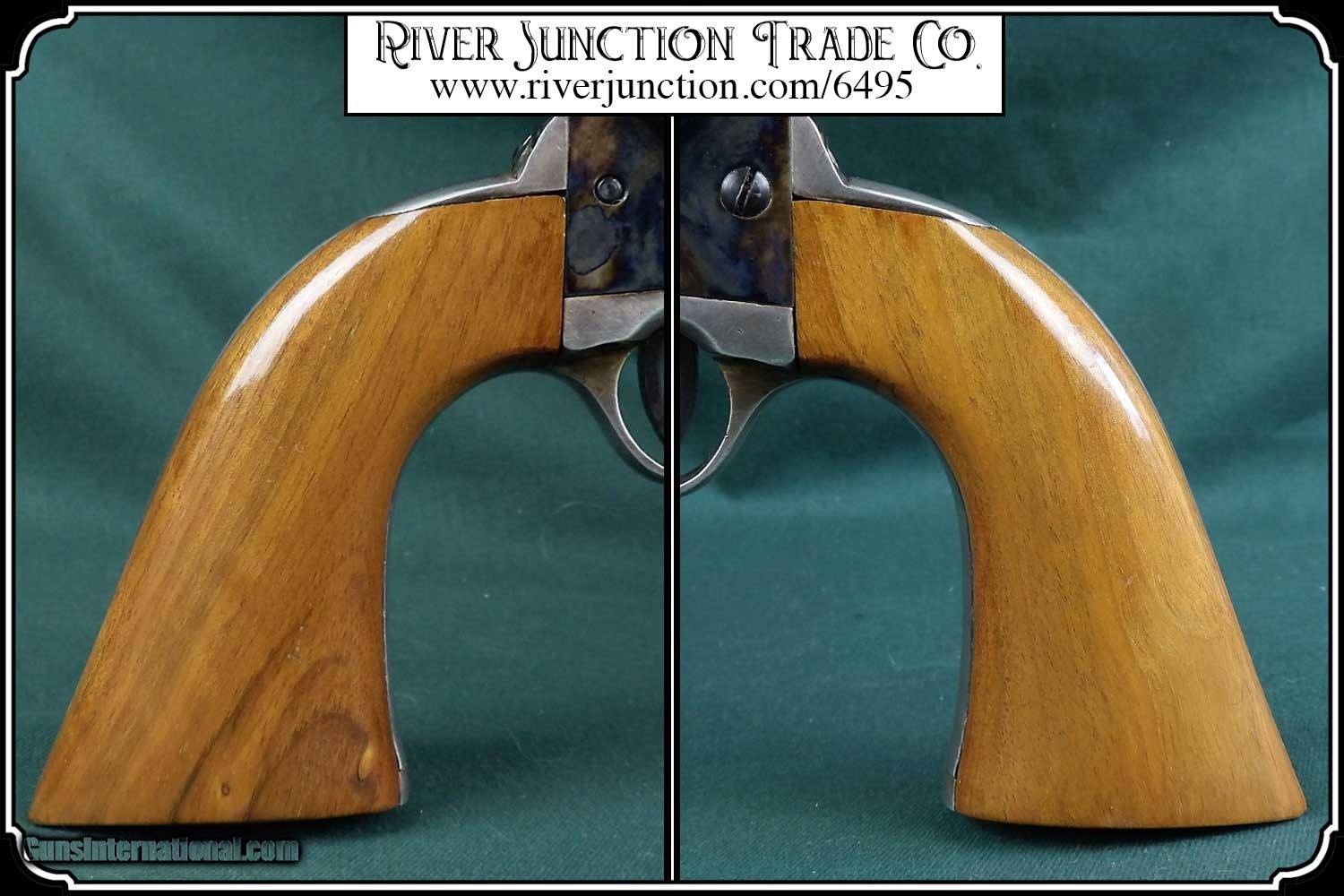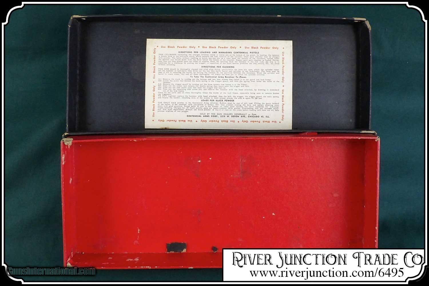 Description: Very RARE highly collectable Belgium made CIVILIAN model COLT serial number (C1) (C1) means it was the first civilian model produce in 1958. Collectors consider this a direct-line descendant from the original Civil War era .44 caliber, 1860 Colt. They feel these are more authentic in that this was the 1st production of the 1860 Colt Army since the originals used in the Civil War. In 1853 Samuel Colt traveled overseas and licensed Belgian gun manufacturers to produce his revolvers. Then one hundred years later, these companies regrouped and began producing this six shooter with modern steel. Others have copied and followed since then including the so called 2nd and 3rd generation percussion 1860 Army. The new pistols were marketed as 1960 New Model Army and were stamped Made in Belgium. At that time the upcoming centennial of the American Civil War, and no safe usable arm was available for reenactors, that all pointed to an obvious need. There to answer that need were two important ingredients, original Colt equipment waiting silently in Belgium for nearly a century and a young man by the name of William B. Edwards. Edwards was one of the principals of Centennial Arms Corp. of Chicago. Edwards realized there was a ready market for a second issue of the Colt Army. Edwards entrusted Fabriques de Armes Unies de Li_ge in Belgium with the production of the 1860 dubbed, the1960 NEW MODEL ARMY. This 1960 NMA is mechanically perfect, the finish is MINT. The bore is mint UNFIRED. The action positive and locks up tight. This gun is serial number (C1). The (C) stands for CIVILIAN MODEL. The back strap and trigger guard are SILVER PLATED and show only very light tarnish, I will leave that for you to polish if you like. The the frame, hammer, and loading leaver are color case hardened. I believe this gun has never been fired. It shows marks such as, made in Belgium on the butt, and on the top of the barrel “1960 NEW MODEL ARMY”. Payment: Item, can be ordered on line with a credit card or paypal on our sight. Just Google (riverjunction) and type in the River Junction Trade Co. item number (6495) in the search box. Before you checkout you will see shipping cost and total. OR If you prefer: Pay by cash, postal money order, cashiers check, personal & business checks. We wait for checks to clear. We always answer questions and entertain offers. Have questions? Call me 563-880-4588. Jim SOLD |