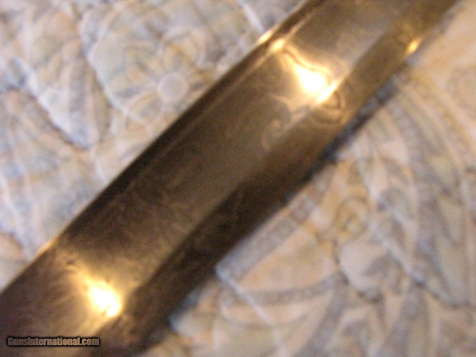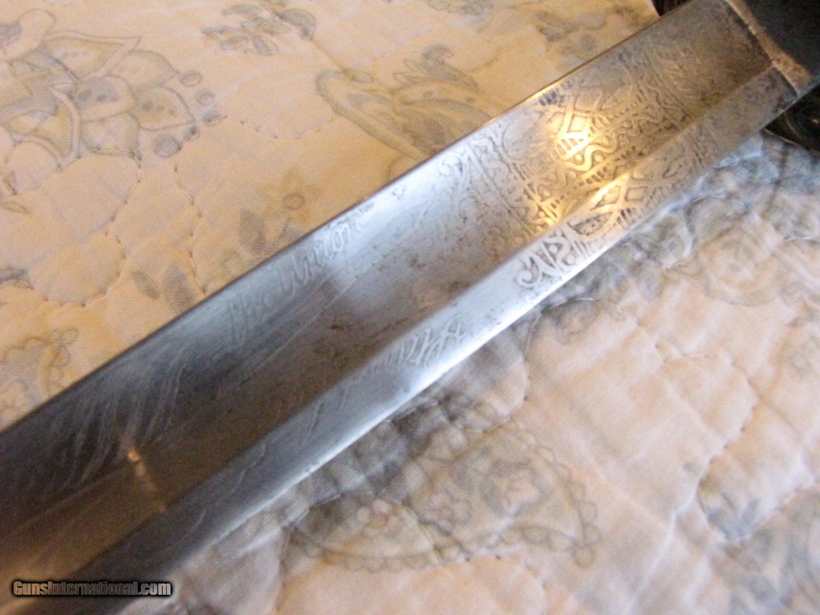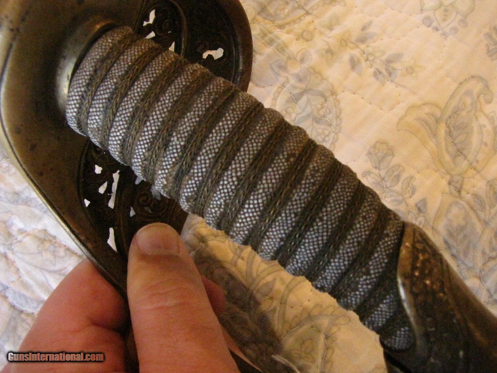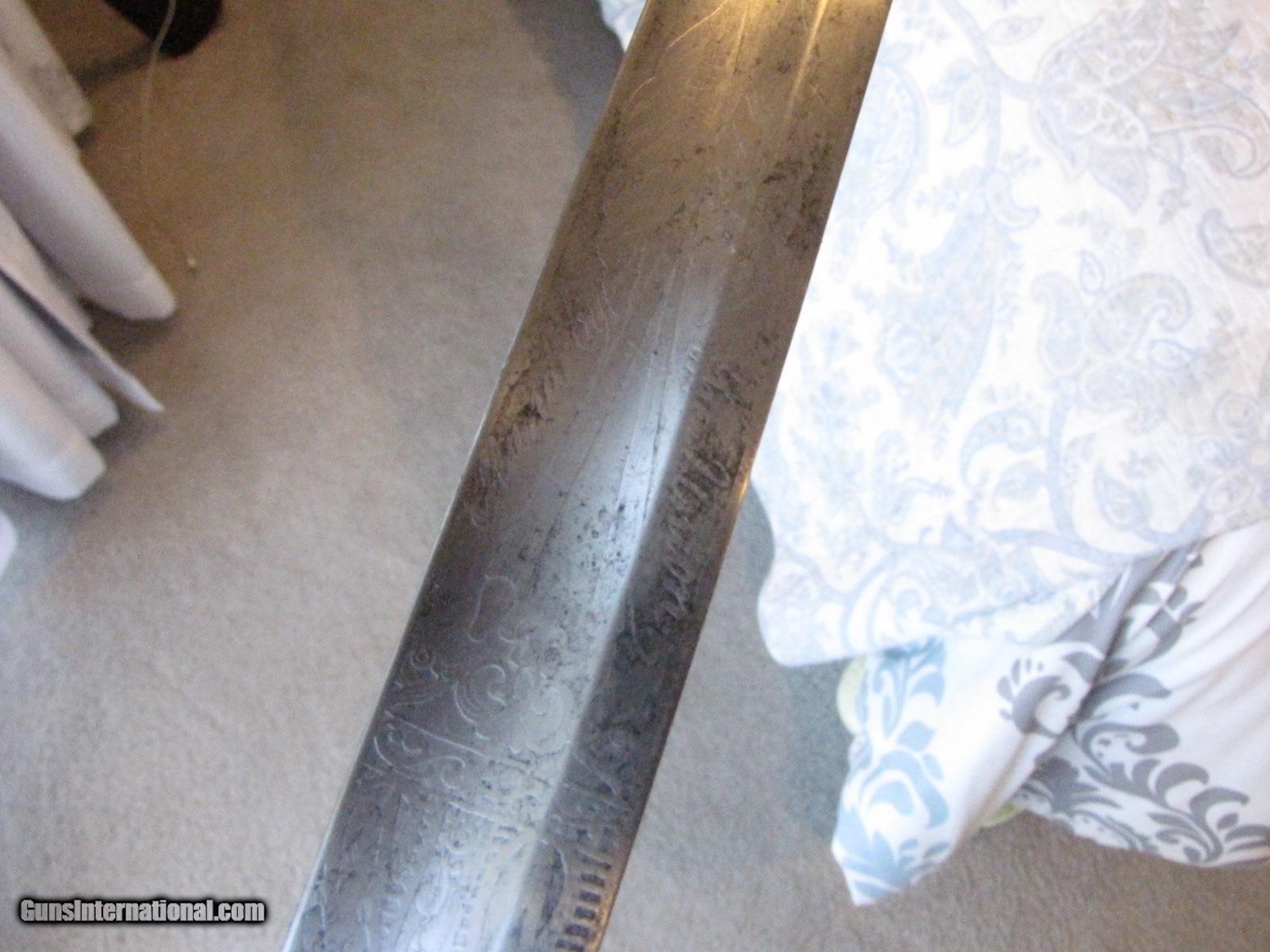 Description: This is one of the most collected names in Civil War, the quality nearly unmatched, using Solingen blades ornately acid etched with patriotic mottos '' STAND BY THE UINON'' on this one with flags ,the hat of liberty on both sides, and one side with the UNITED STATES EAGLE. The company used only the highest quality parts, the quality of the shark skin on the handle and the silver wire wrap is unmatched and in above good condition still. The scabbard has a beautiful brown patina, and the two ornate copper hangers have cantos leaves on both. The scabbard has some dents on the drag that effect nothing. This sword was collected in the 1960's so an early piece in good condition, hard to find now a-days. call 859-533-5445 SOLD |