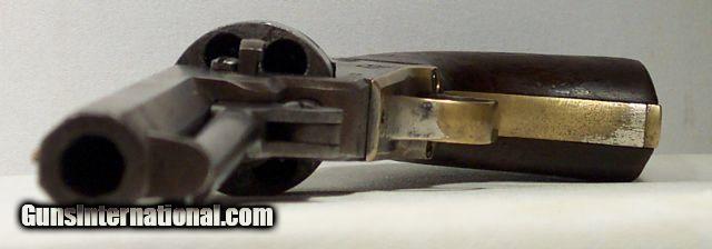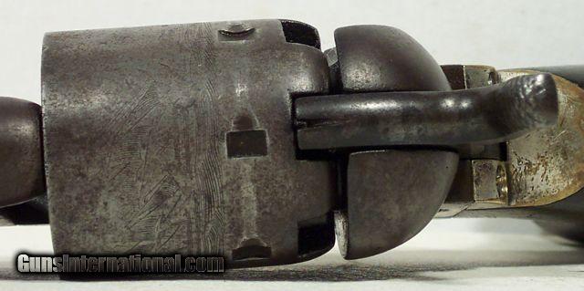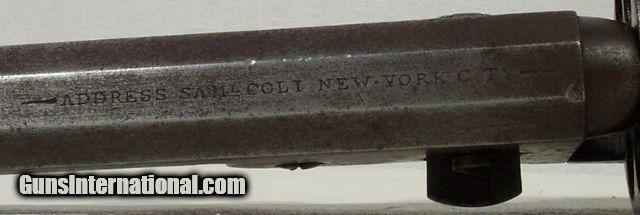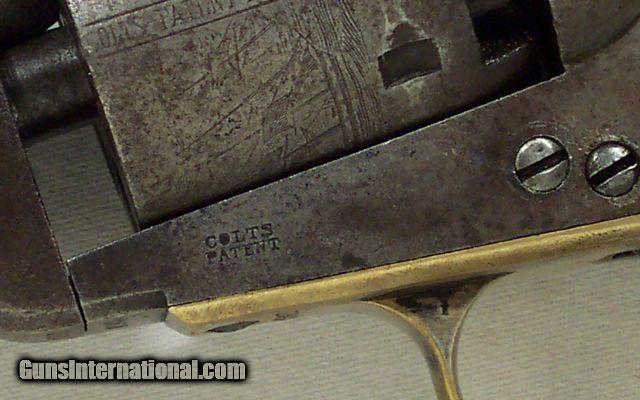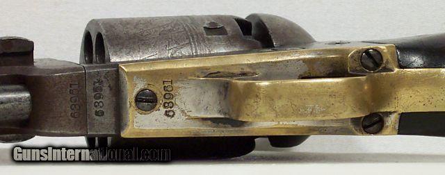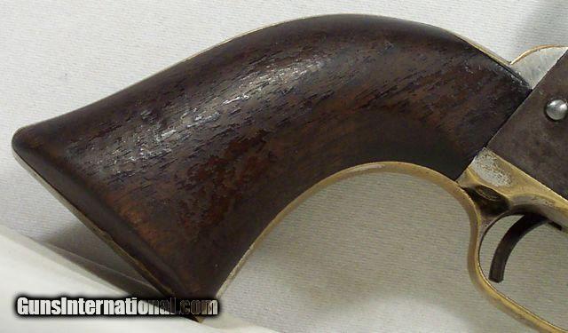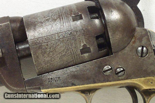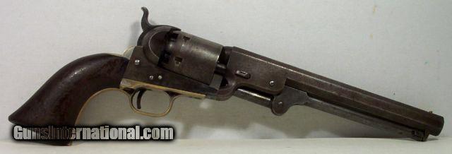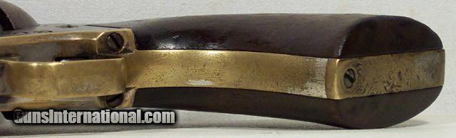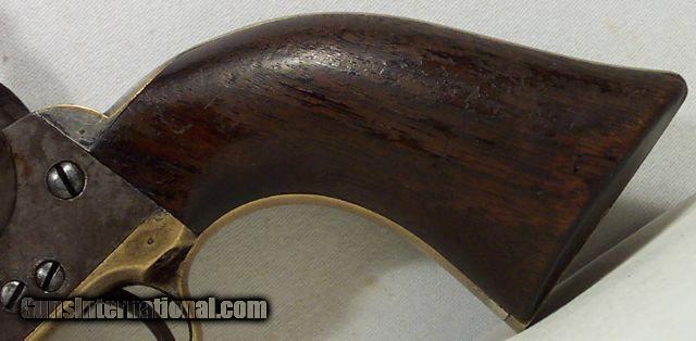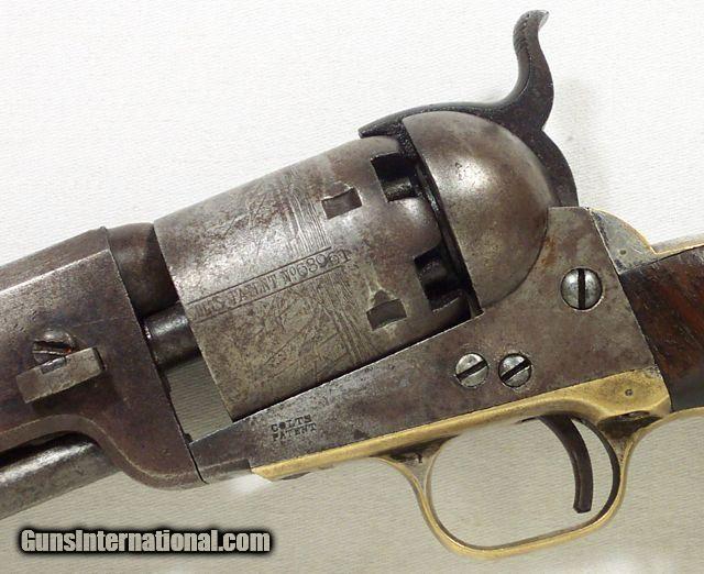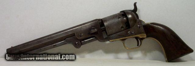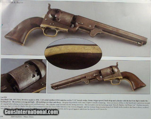 Description: FROM MY PERSONAL COLLECTION!!! Colt Model 1851 Navy; SN63961; .36 cal. percussion six-shot revolver made 1856; all numbers match with ‘6391’ inside loading lever, on wedge, an inside grip channel; all markings clear and sharp; good cylinder scene; traces of original blue on bbl.; some original silver remains on trigger guard and back strap; PERFECT tight action and excellent strong bore; authentic period inscription on back strap, ‘John R. Baylor, 2nd Texas Cav.’; Col. John R. Baylor was placed in command of the 2nd Texas Rifles known as the ‘Arizona Brigade’ and the Western Texas frontier Fort Worth in the north to the Nueces River, south of San Antonio; his orders were to guard the U.S. Army Posts that ran along the frontier an to guard against raids from the Apache and the Comanche; he was a famous Indian fighter; in 1861, Baylor helped organize the 2nd Texas Mounted Rifles and served in the Confederate Army in many battles; much colorful history is available on Baylor, who was described in Tim Kart’s Civil War Tales as ‘The Indian Hating Texan’; antique, no FFL/C&R required for shipping; All items shipped fully insured Priority Mail- -Hand guns $30 --Long guns $45-- Spurs $30-- Knives, Swords & Sabers $30—Grips $20; return policy: three days inspection from the date the item is received; full refund of shipping both ways ONLY IF THE ITEM IS MISREPRESENTED. Note: International sales only as laws permit. Will ship C&R eligible items to C&R license. Antiques shipped without license to anyone EXCEPT New Jersey and City of New York where a FFL is required. SOLD |