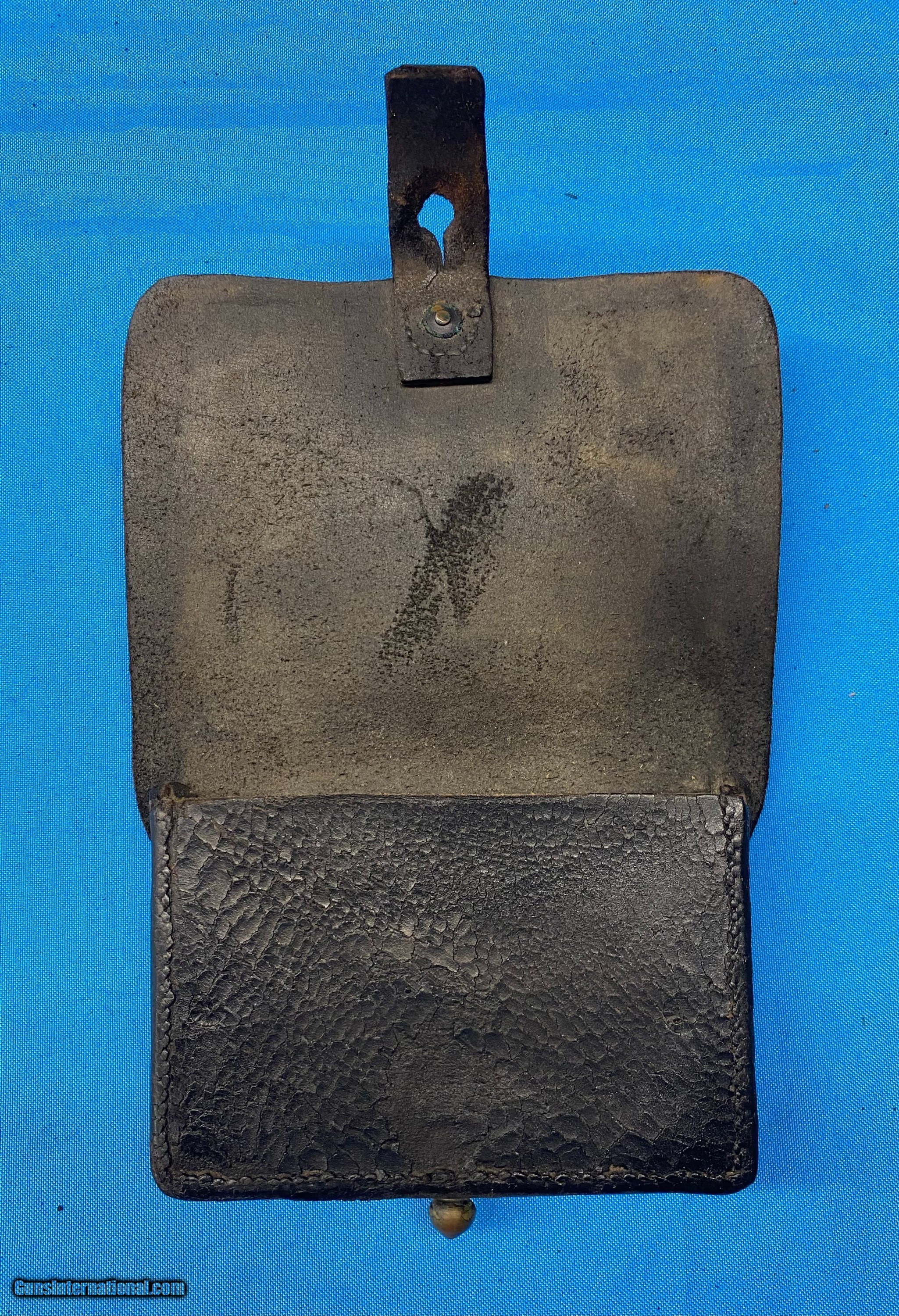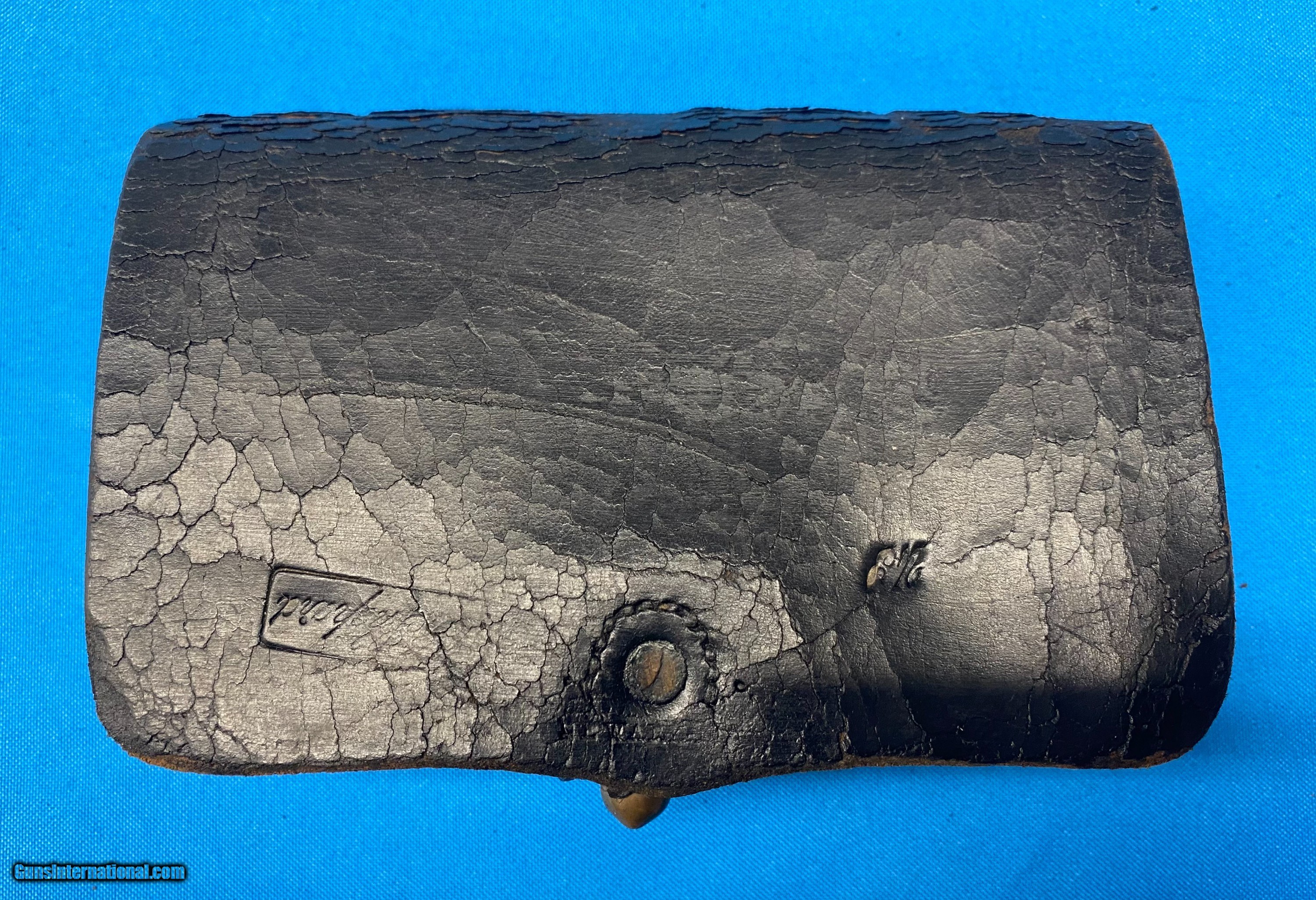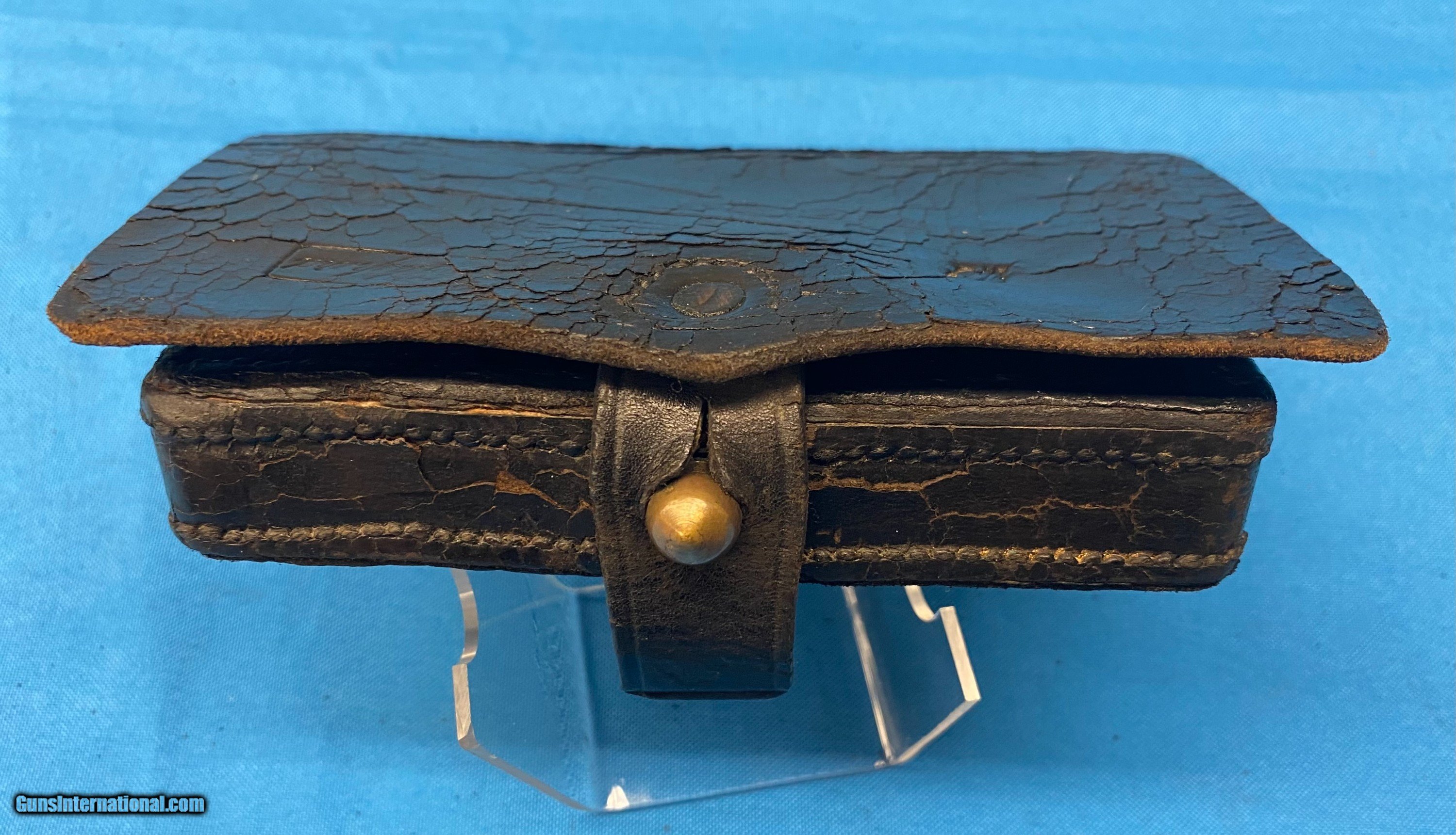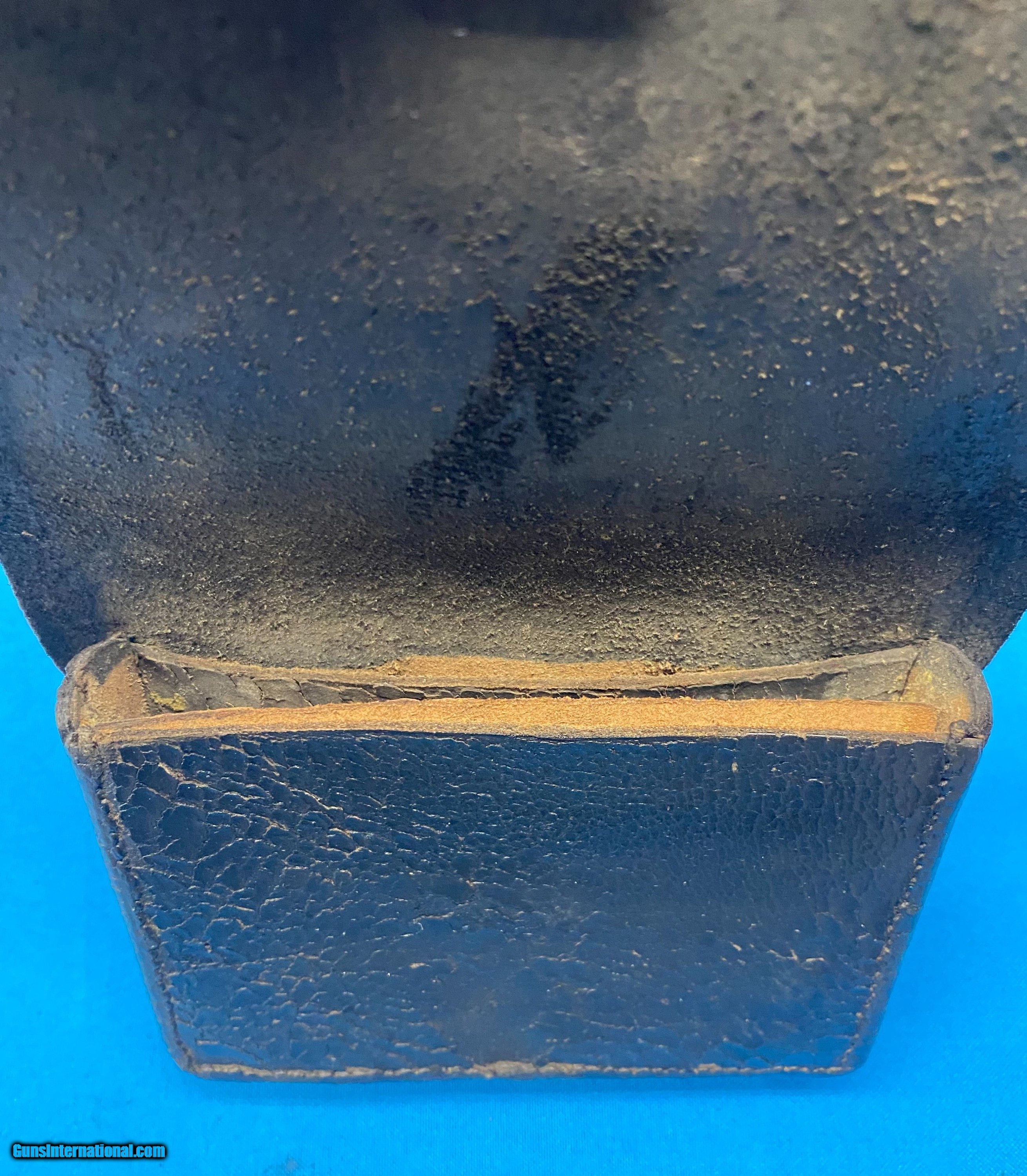 Description: This is an original U.S. Civil War Colt Model 1851 Navy Cartridge Pack Box. The box is in nice condition and has maker marks and Inspection marks on the front cover. The two belt loops on the back are intact and in nice condition and the latched strap is also present. The box measures 5” wide x 4” high x1” deep. Please message me with any questions. SOLD |
