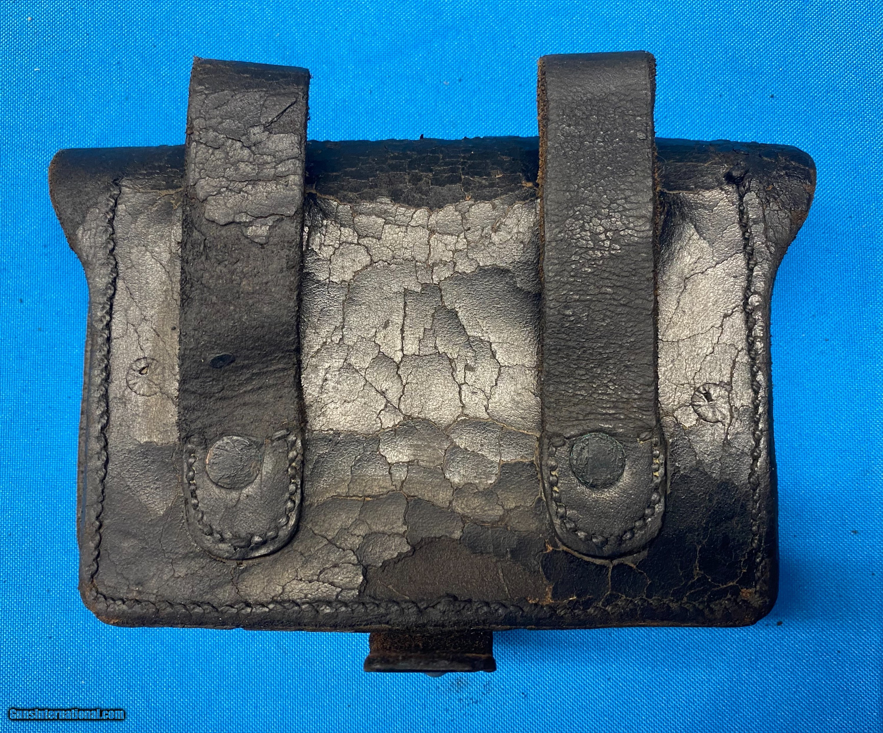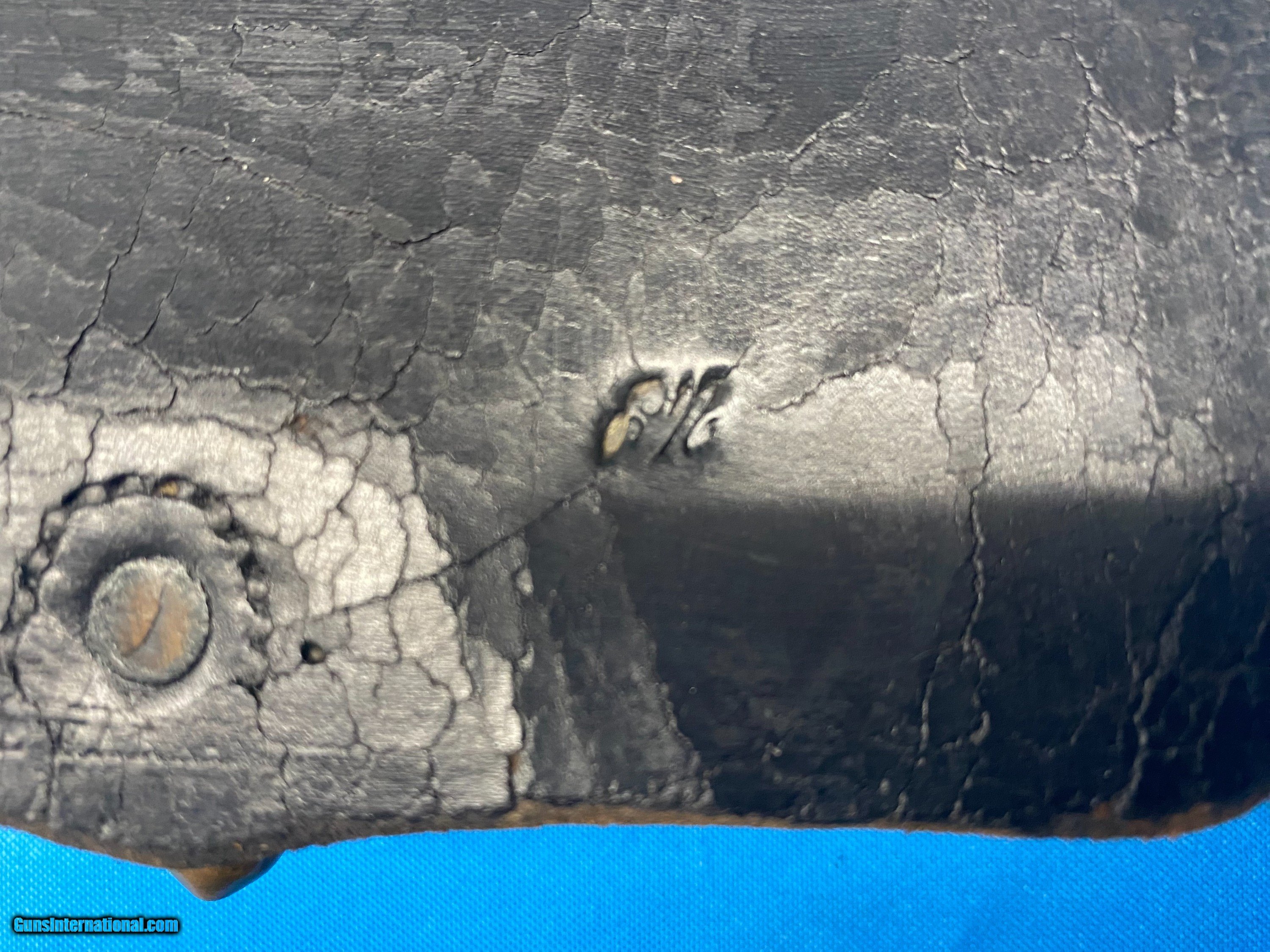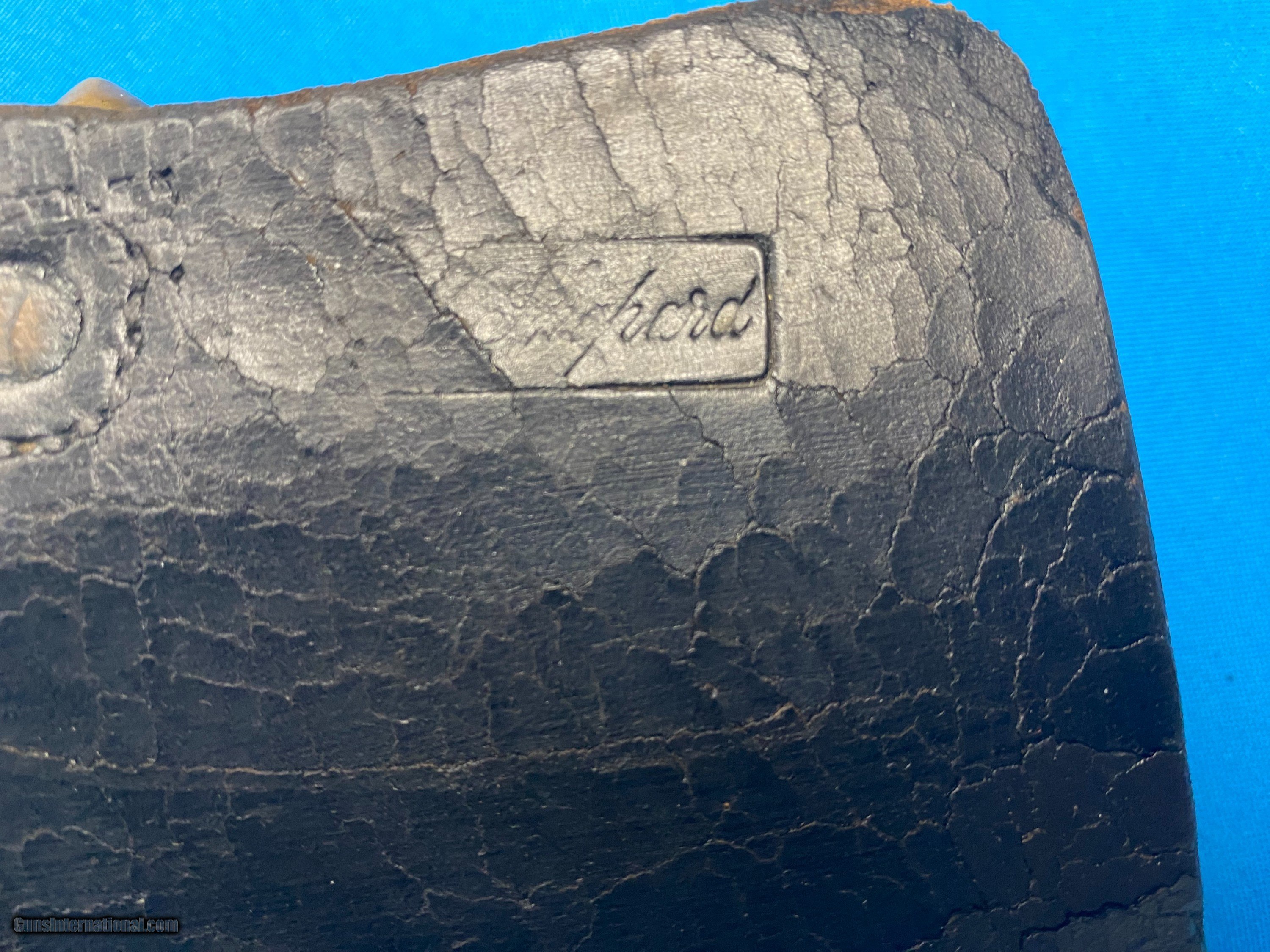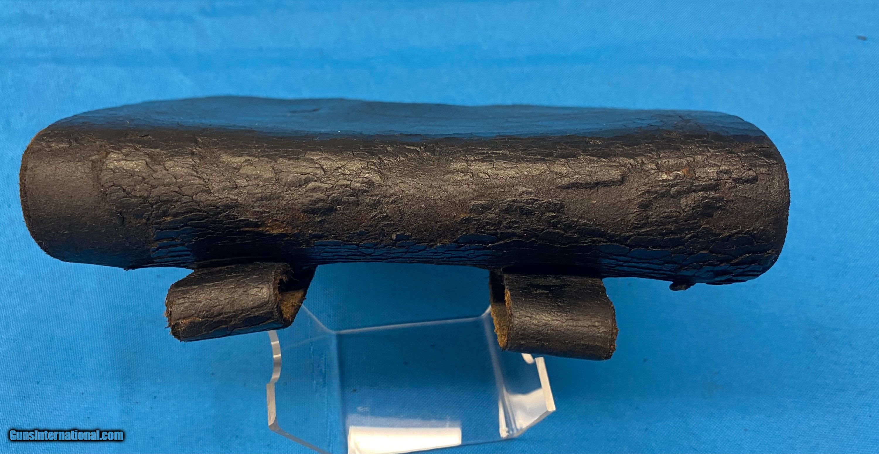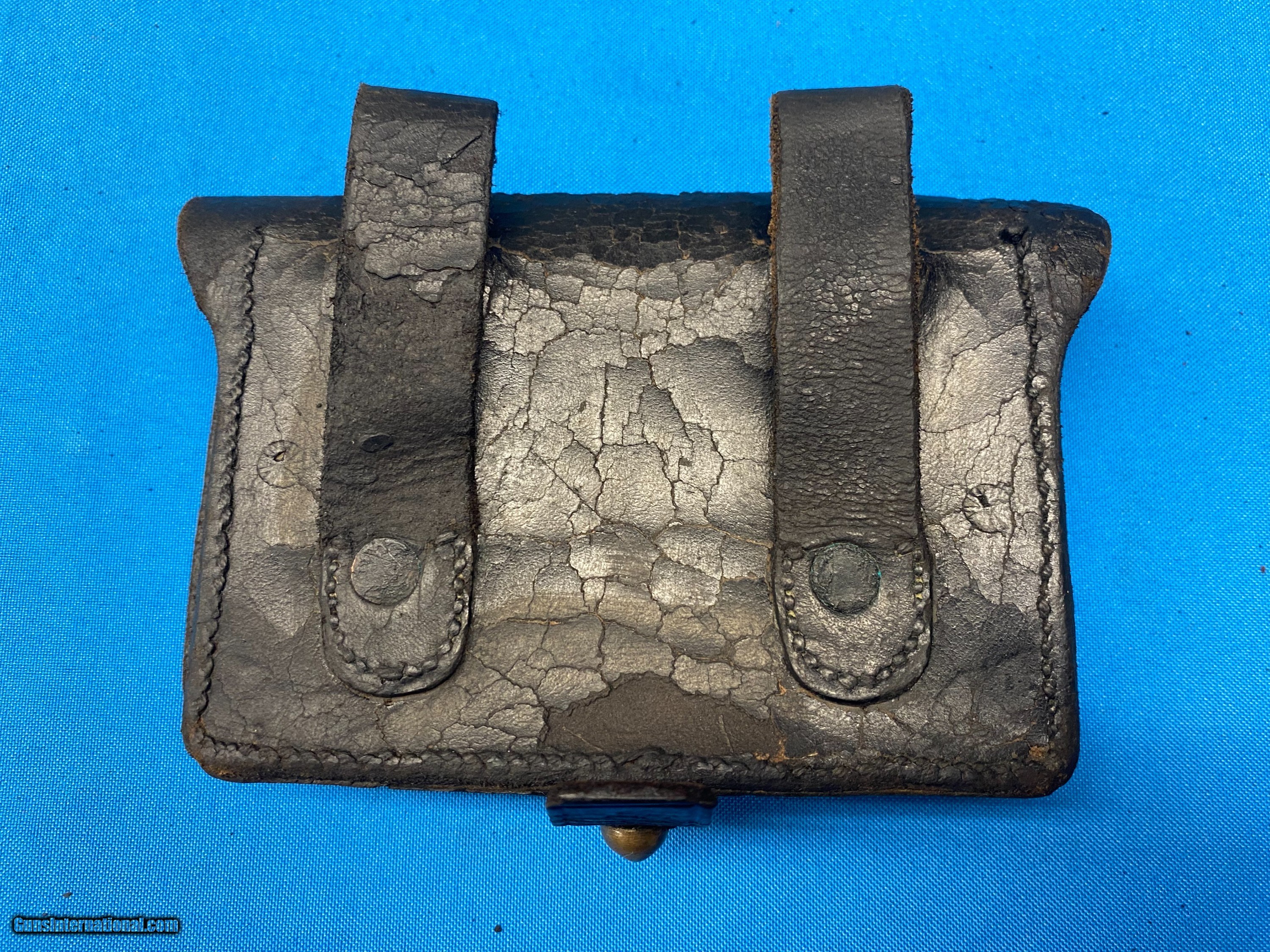 Description: This is an original U.S. Civil War Colt Model 1851 Navy Cartridge Pack Box. The box is in nice condition and has maker marks and Inspection marks on the front cover. The two belt loops on the back are intact and in nice condition and the latched strap is also present. The box measures 5” wide x 4” high x1” deep. Please message me with any questions. SOLD |