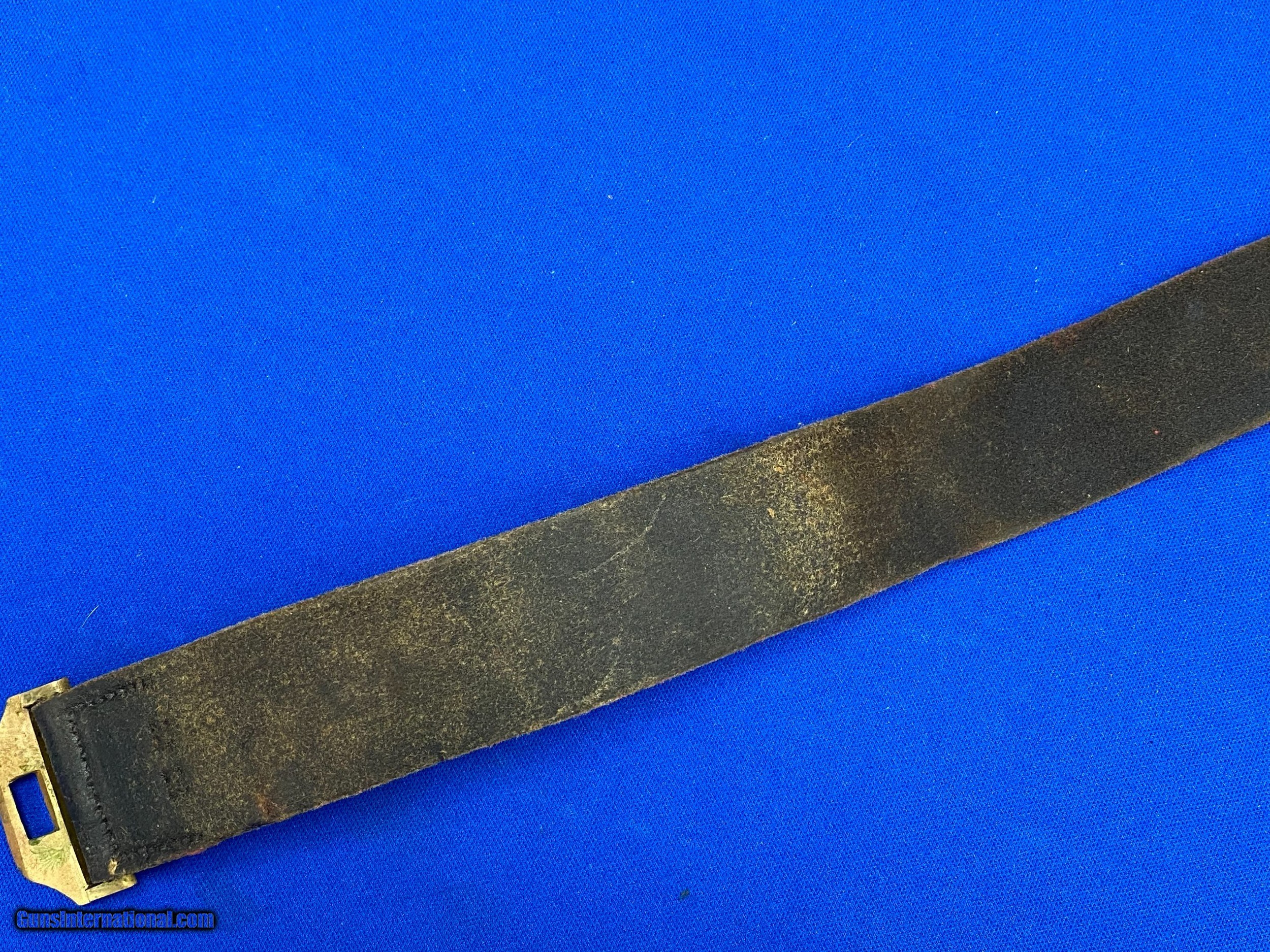 Description: This is an original U.S. Civil War Model 1851 regulation NCO waist belt and eagle and wreath buckle. The belt and buckle are in very nice untouched condition. The black buff leather belt is in nice condition with a fixed brass hasp on one end that is stamped 546 and other end is attached to the buckle. The brass Eagle Buckle with silver wreath is in very nice condition with a nice even patina and is stamped on the back 191. The belt and buckle measure 36-1/4” long x 1-3/4” wide. Please e-mail me with any questions. SOLD |