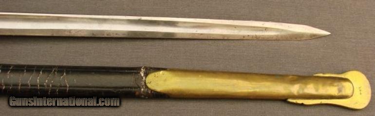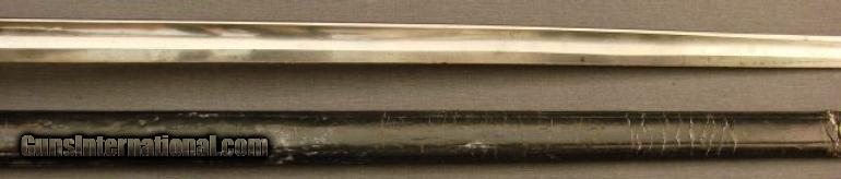 Description: This sword measures 34 3/4" overall with a 28 1/4" straight, single-edged blade having long single fullers. The steel has a lightly freckled bright patina with a few very minor nicks along the edge as well as clear "US/JH/1864" and Ames Mfg. Co. scroll trademark stamps on both sides of the ricasso. The cast brass hilt has a mild yellow-ochre patina with a clear "JH" inspector mark on the knucklebow. The sword is housed in its original scabbard which has moderately dented brass throat and chape and heavily crazed black leather that has become weak just above the chape. This is a very good plus example of a war-dated sword and is in very good condition overall. SOLD Manufacturer: U.S. Model: 1840 |