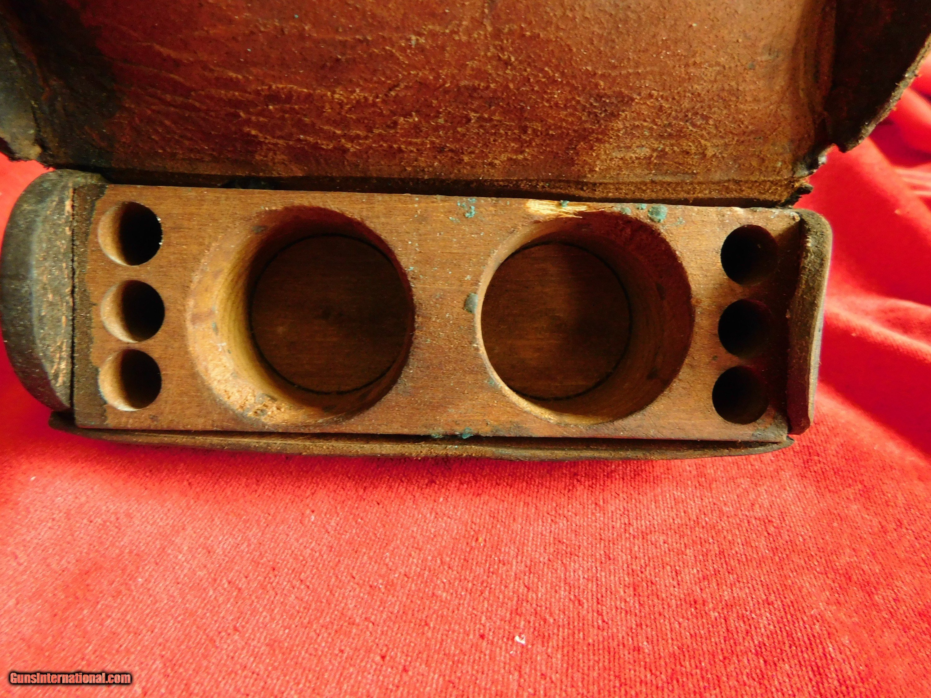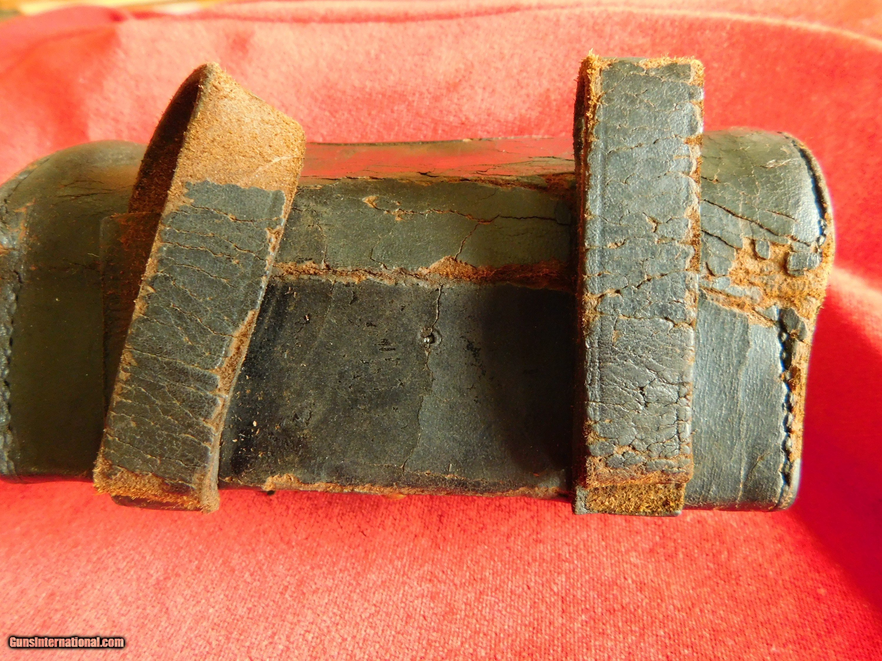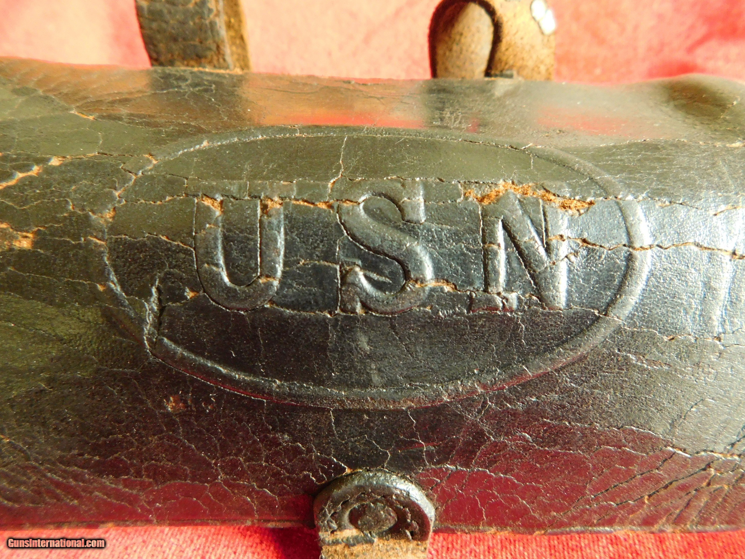 Description: This is a Model 1889 US Navy cartridge box for the Colt Model 1889/95 revolver, caliber .38 Colt. Overall good condition, except as noted, and everything is present. The leather is supple and exhibits surface cracks on the tab, belt loops, and one side of the cover (shown). There is some loss of the black finish. The wooden block inside held two “new cartridge packs” and six individual cartridges. The “new cartridge pack” consisted of a central wood plug and a brass foil collar that held the .38 cartridges. Once loaded, the plug and fold were discarded. The cover is boldly embossed “USN” in an oval, and the closing tab has a nicely patinaed brass snap that attaches to the bottom of the box. The two side ears are stitched to the flap and remain intact. Two loops attach the box to the user’s belt. Overall, it is a nice example of late 19th century Navy gear. Shipping $10. PayPal or money order. SOLD |