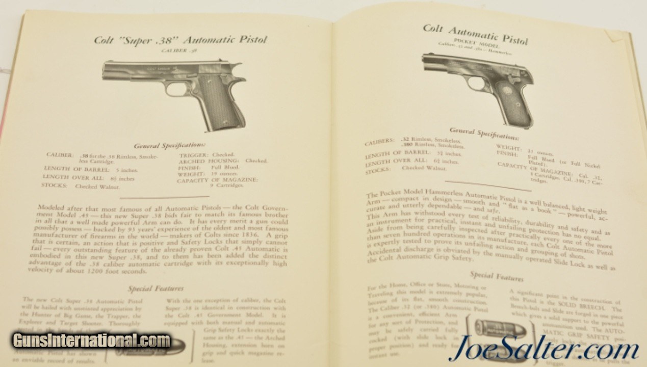Description: This is an original 1929 Colt Fire Arms catalog in excellent condition. Measures 10" x 7½". All 40 pages are tight, intact in the stapled binding, very clean with no rips, tears or writing. There is an even amount of age soiling present on the edges. Original January 1929 price list is included in the catalog. No credit card fees. Please see pictures for further details.; Price: $95.00 Contact Seller |