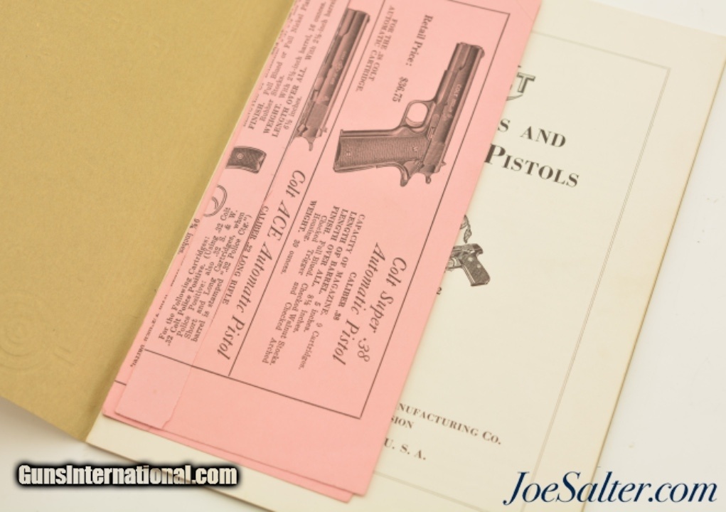 Description: This is an original January 1st edition 1932 Colt Fire Arms catalog in excellent condition. Measures 10" x 7??". All 40 pages are tight, intact in the stapled binding, very clean with no rips, tears or writing. There is almost no age soiling present on the edges. Original January 1932 price list is included in the catalog, incomplete and fragile. This catalog comes with a special bonus, the original mailing envelope from Colt to Monmouth ME. No credit card fees. Please see pictures for further details. SOLD |