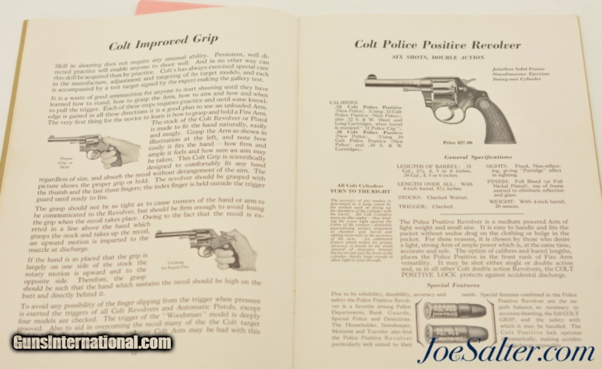 Description: This is an original January 1st edition 1932 Colt Fire Arms catalog in excellent condition. Measures 10" x 7??". All 40 pages are tight, intact in the stapled binding, very clean with no rips, tears or writing. There is almost no age soiling present on the edges. Original January 1932 price list is included in the catalog, incomplete and fragile. This catalog comes with a special bonus, the original mailing envelope from Colt to Monmouth ME. No credit card fees. Please see pictures for further details. SOLD |