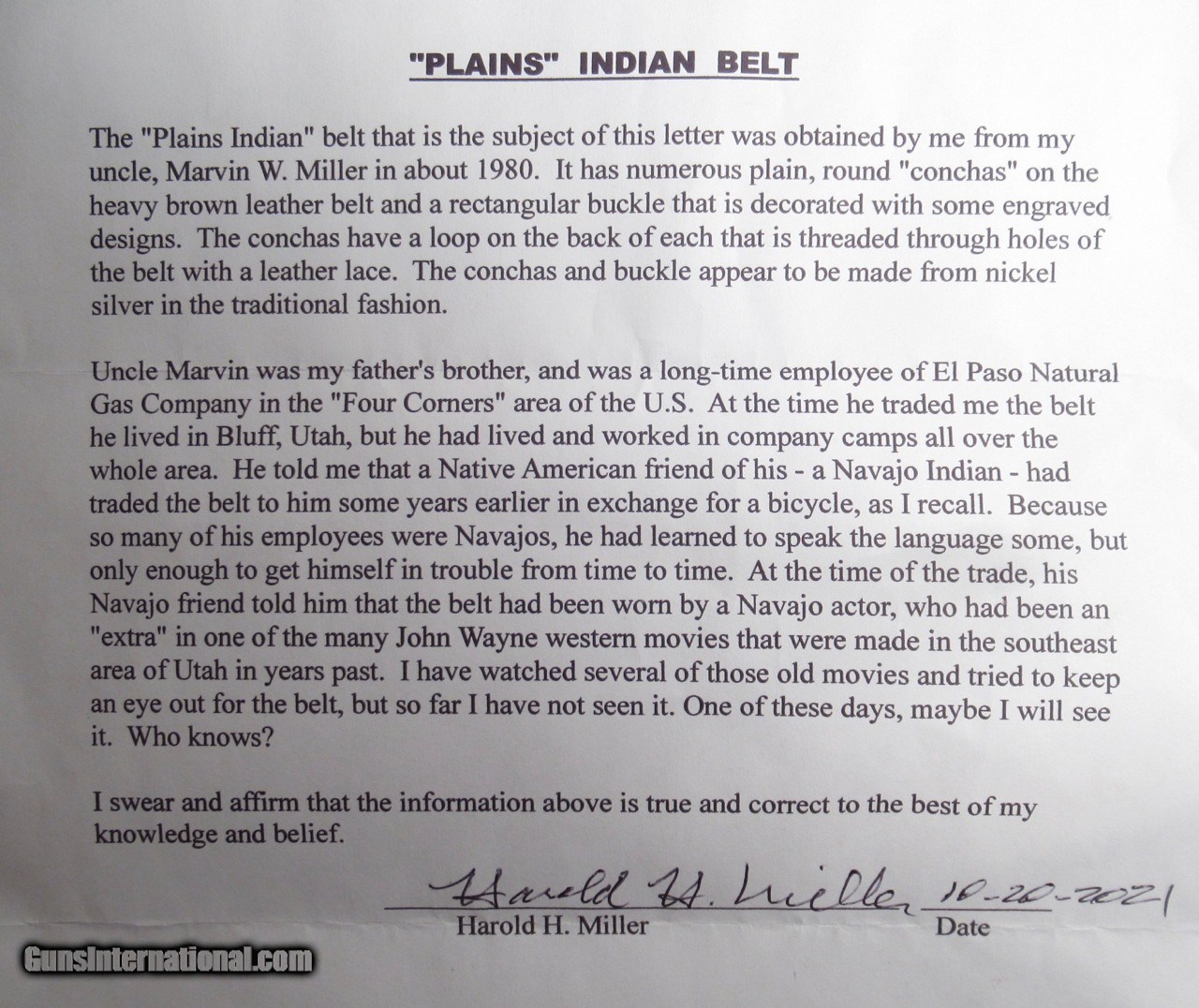 Description: The “Plains Indian” Belt was obtained in the 1980’s from a Navajo Indian in a Trade for a Bicycle; The Belt is Claimed to Have Been Worn by an “Extra” During the Making of a John Wayne Western Film; Brown Letter Belt Measures Approx. 44” and each Concha has a loop on the back that is threaded through holes of the belt with leather lace; See All Photos for Condition; No Texts; Call (254)541-5765 or Email Only; PERSONAL PROPERTY of Harold Wieser; Price: $775 + $45 S&H Via USPS PRIORITY MAIL; Payment Address: Harold Wieser - 1466 U.S. Hwy 77 - Rosebud, TX 76570; SEND PAYMENTS VIA USPS PRIORITY MAIL; BEWARE of SCAMS!!! – DO NOT SEND MONEY or CORRESPONDENTS ELECTRONICALLY UNLESS YOU HAVE SPOKEN to HAROLD WIESER FIRST! 254-541-5765 SOLD |