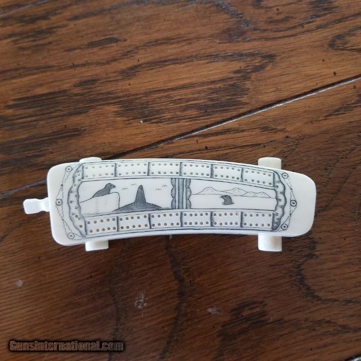 Description: 20th Century Alaskan walrus tusk ivory cribbage board w// carved seals , signed Joe Ignatius, length 5”. Nice work. Excellent condition . SOLD |