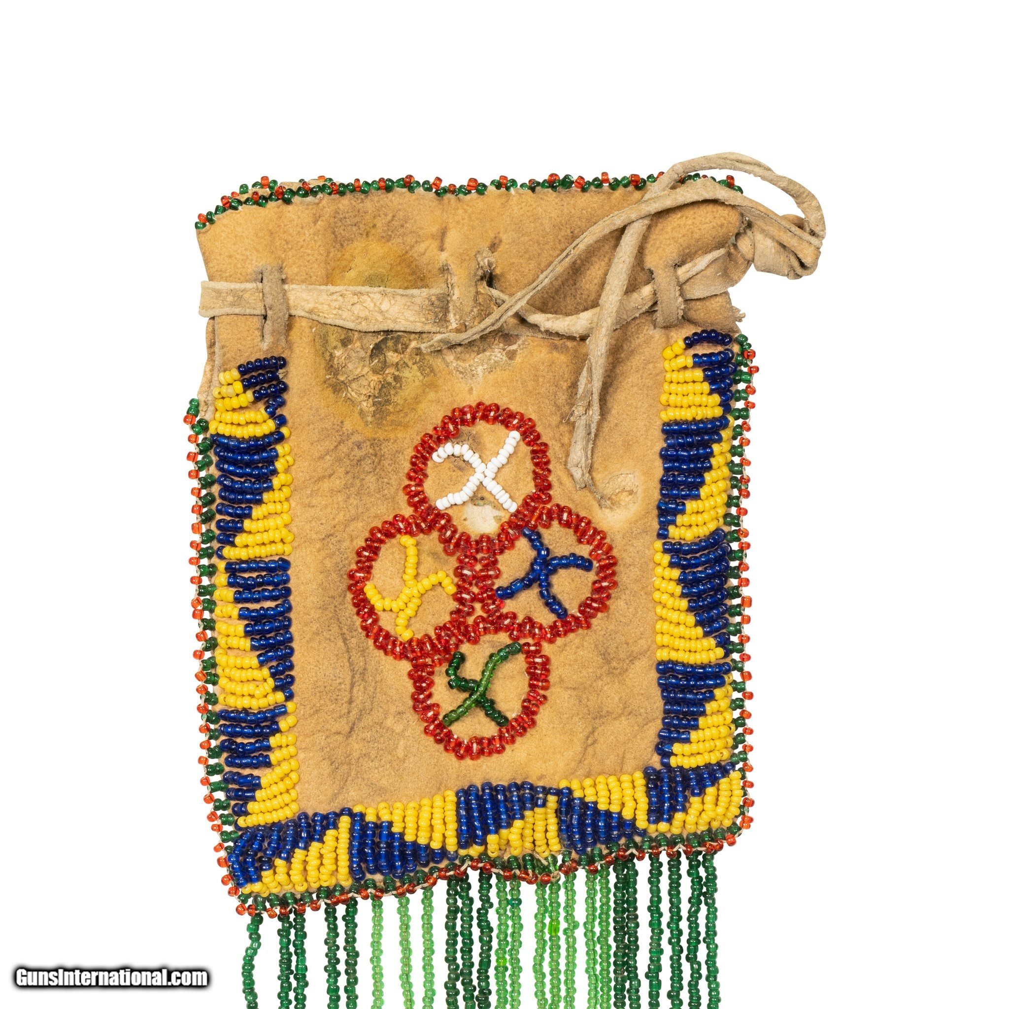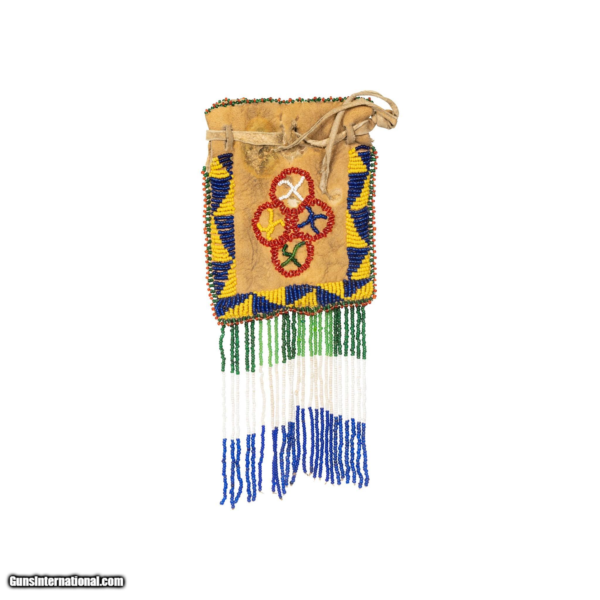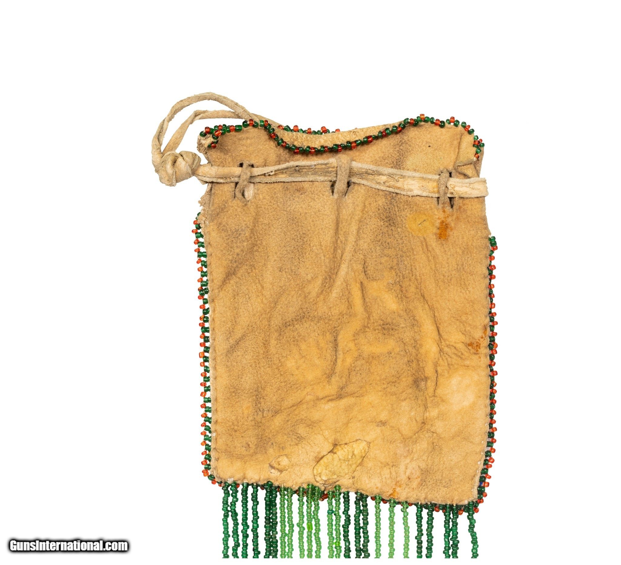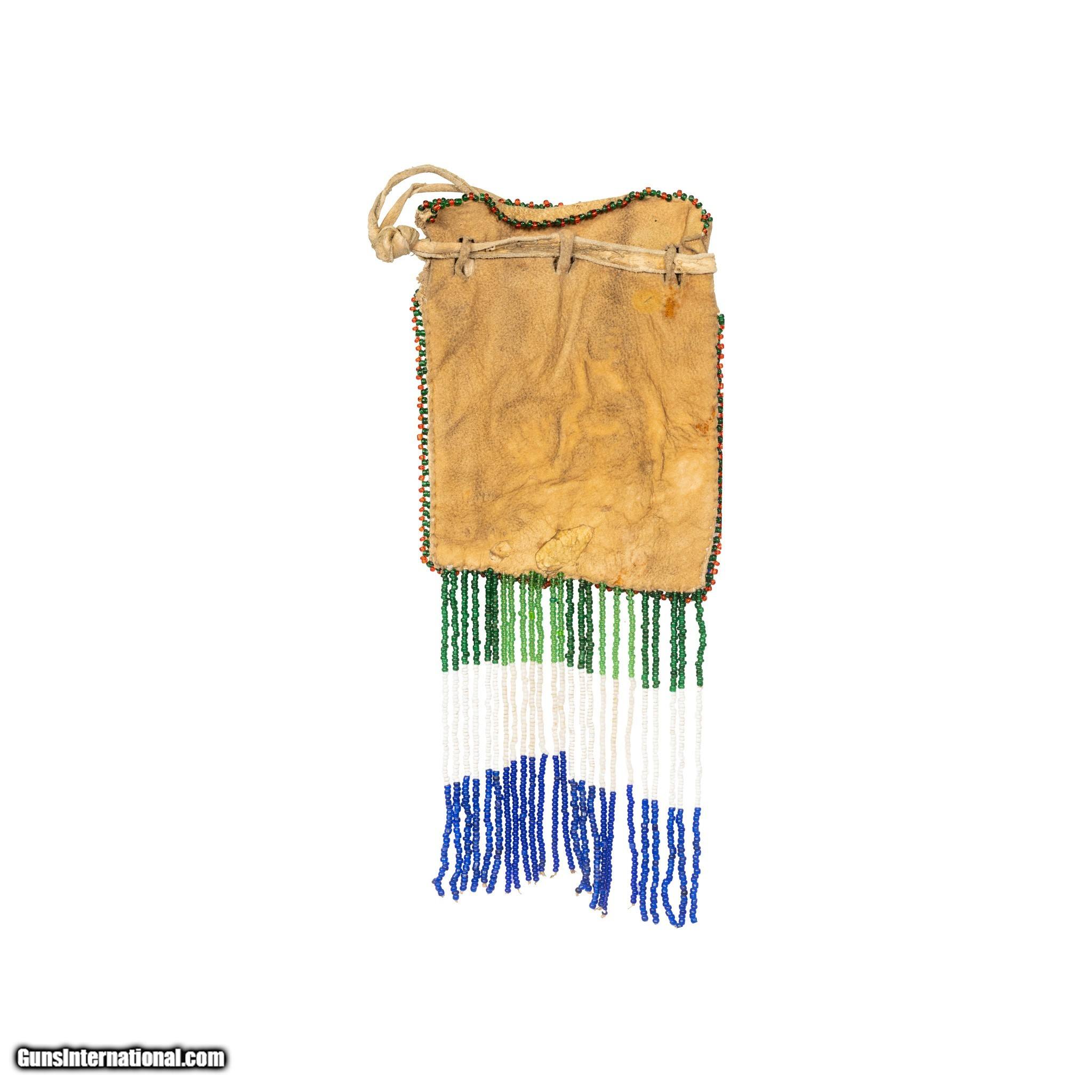 Description: Apache belt pouch of brain tanned antelope hide with beaded front, edges and drops. 4" x 5" Plus 4" Drops. Last quarter 19th Century. SOLD |