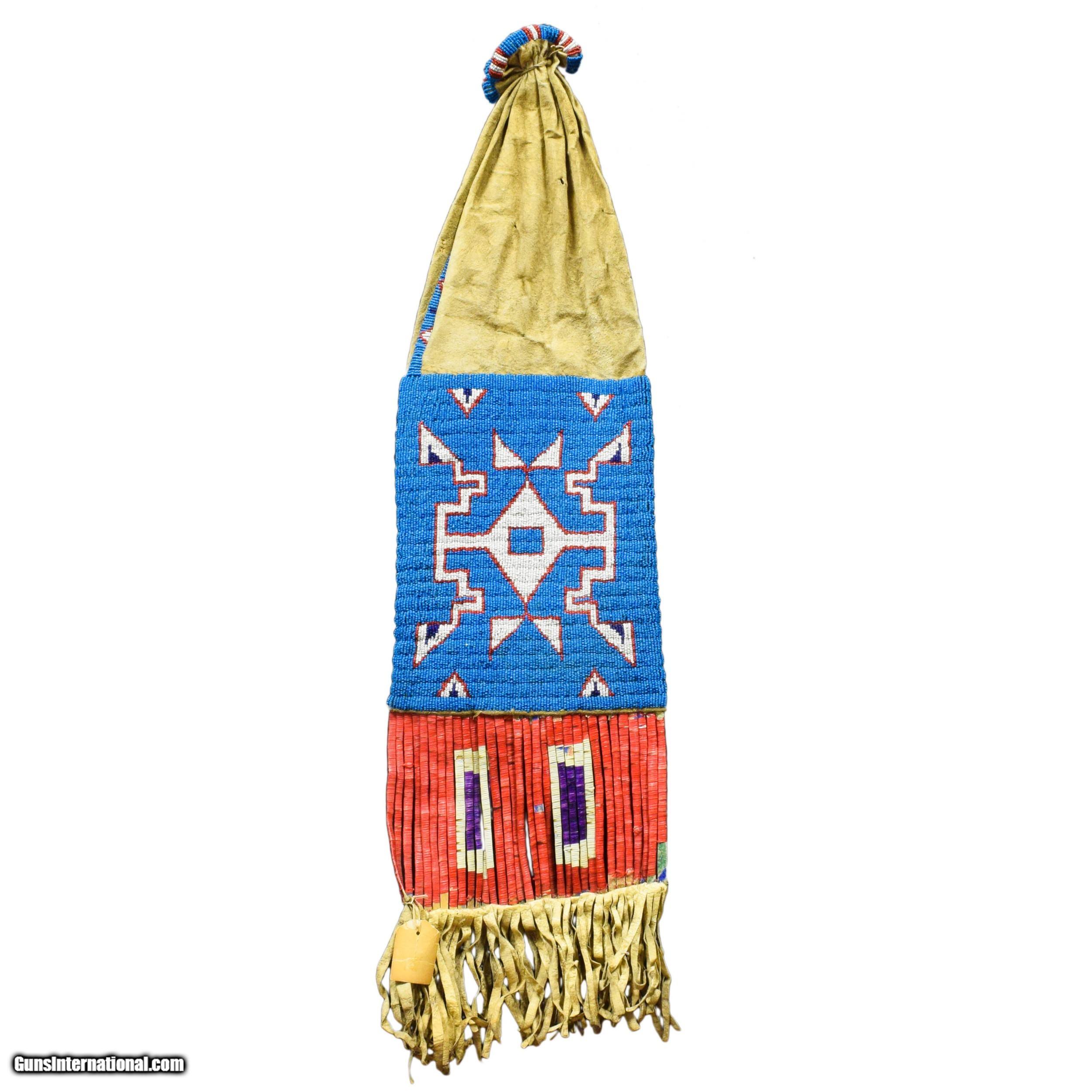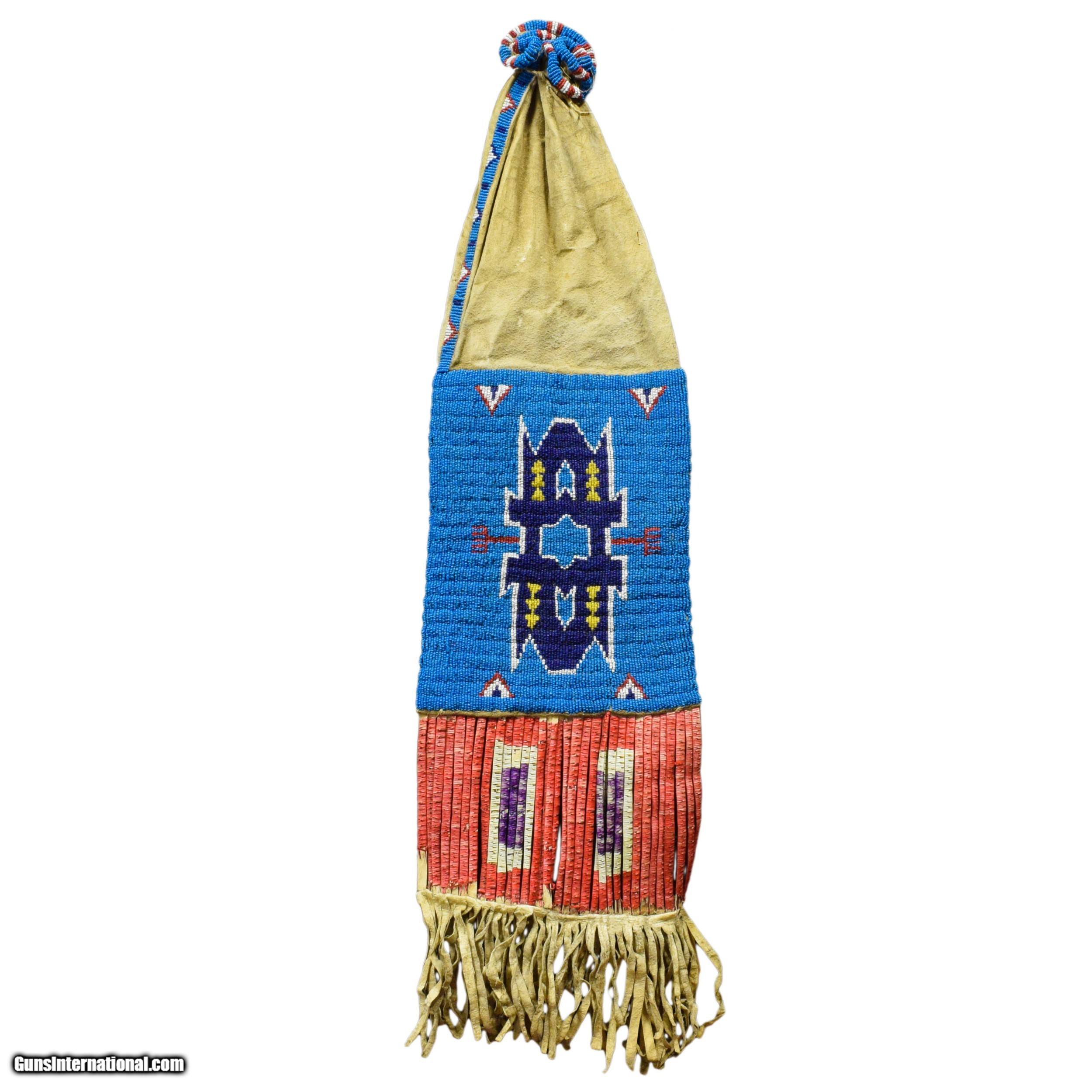 Description: Arapaho Large Panel, tobacco bag with old collection tag "tobacco bag" white seal #450. Brain tanned buffalo calf. All original, remains soft and supple. Sinew sewn. bag 22", bead panel 11"x9", quilling 6", fringe 4", overall 32". Last quarter 20th cenutry. SOLD |