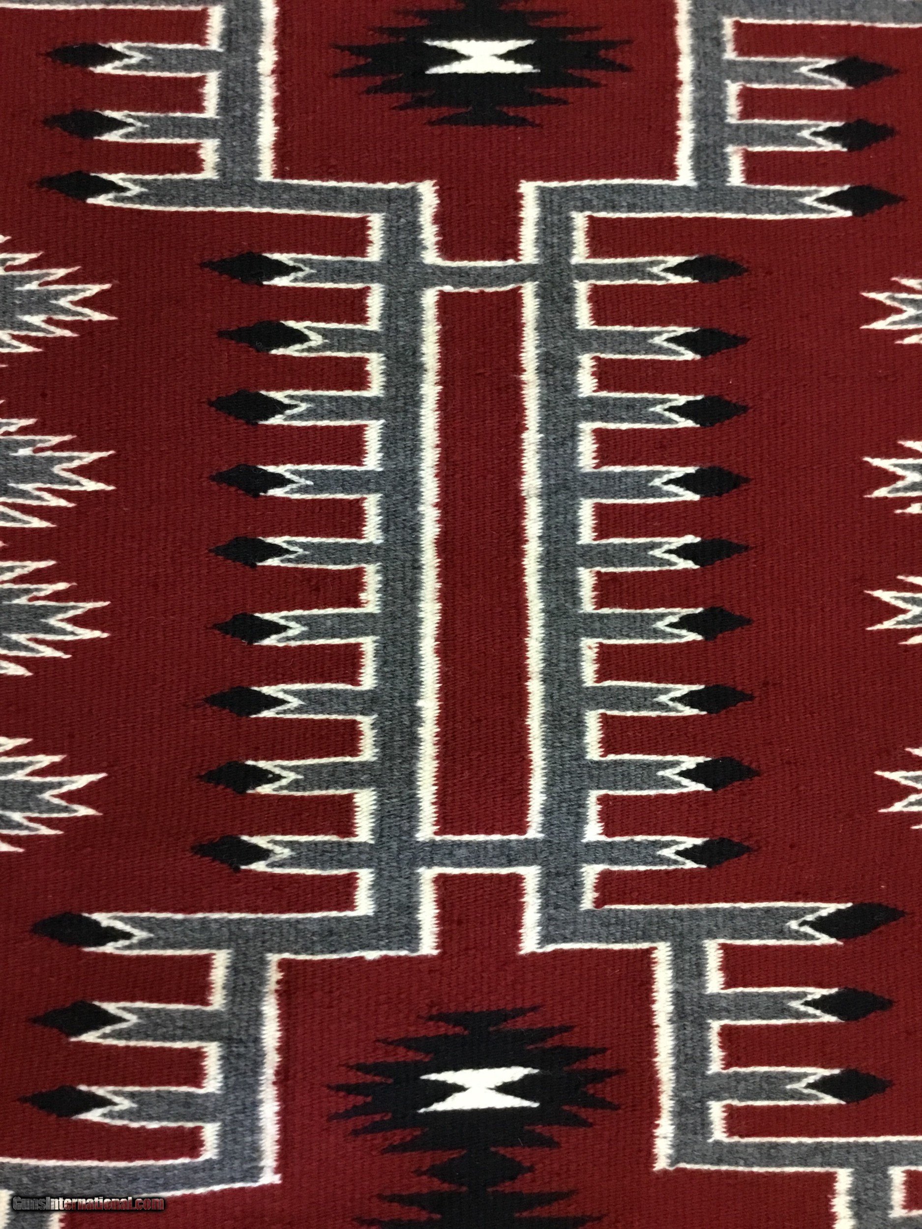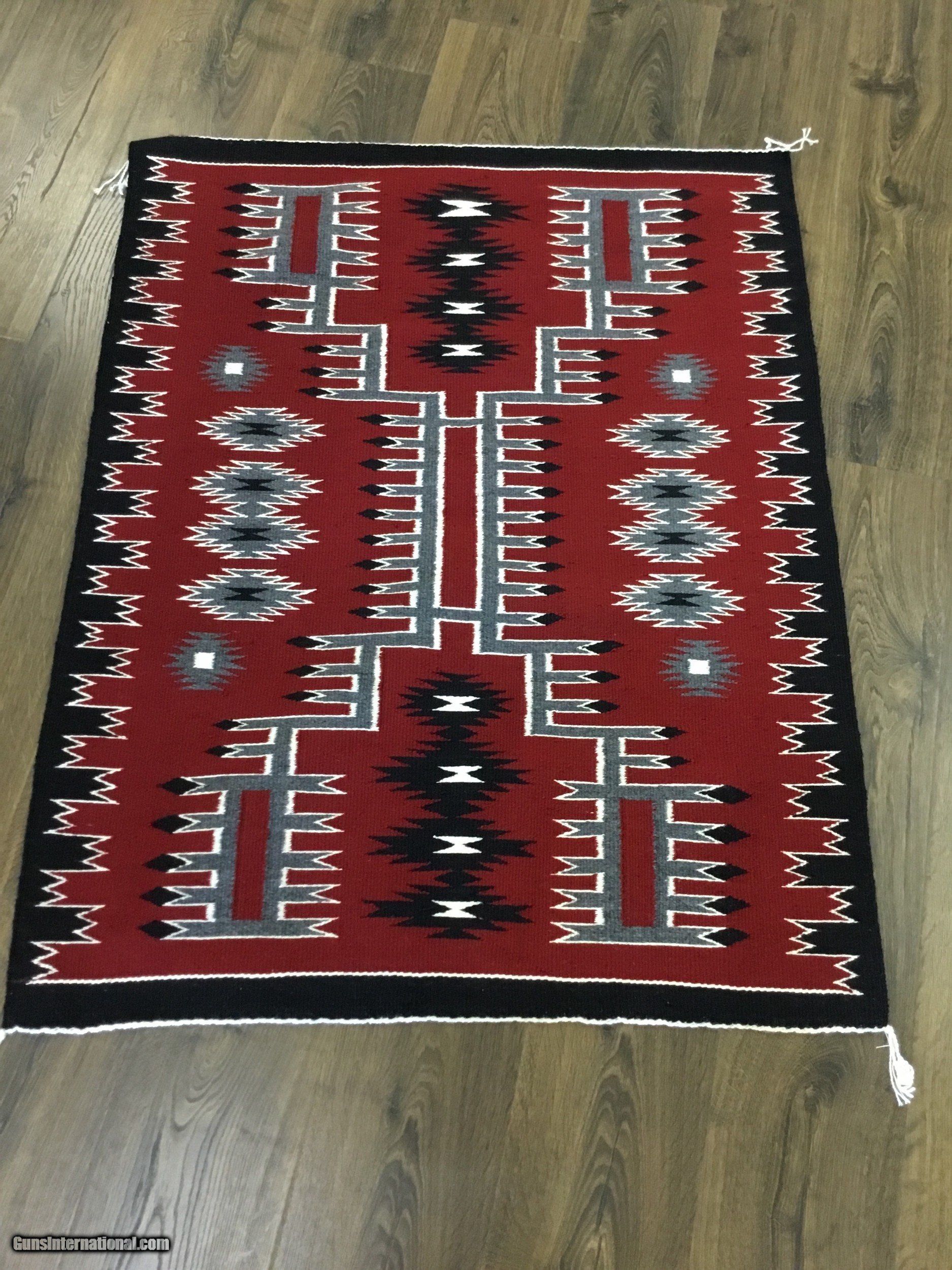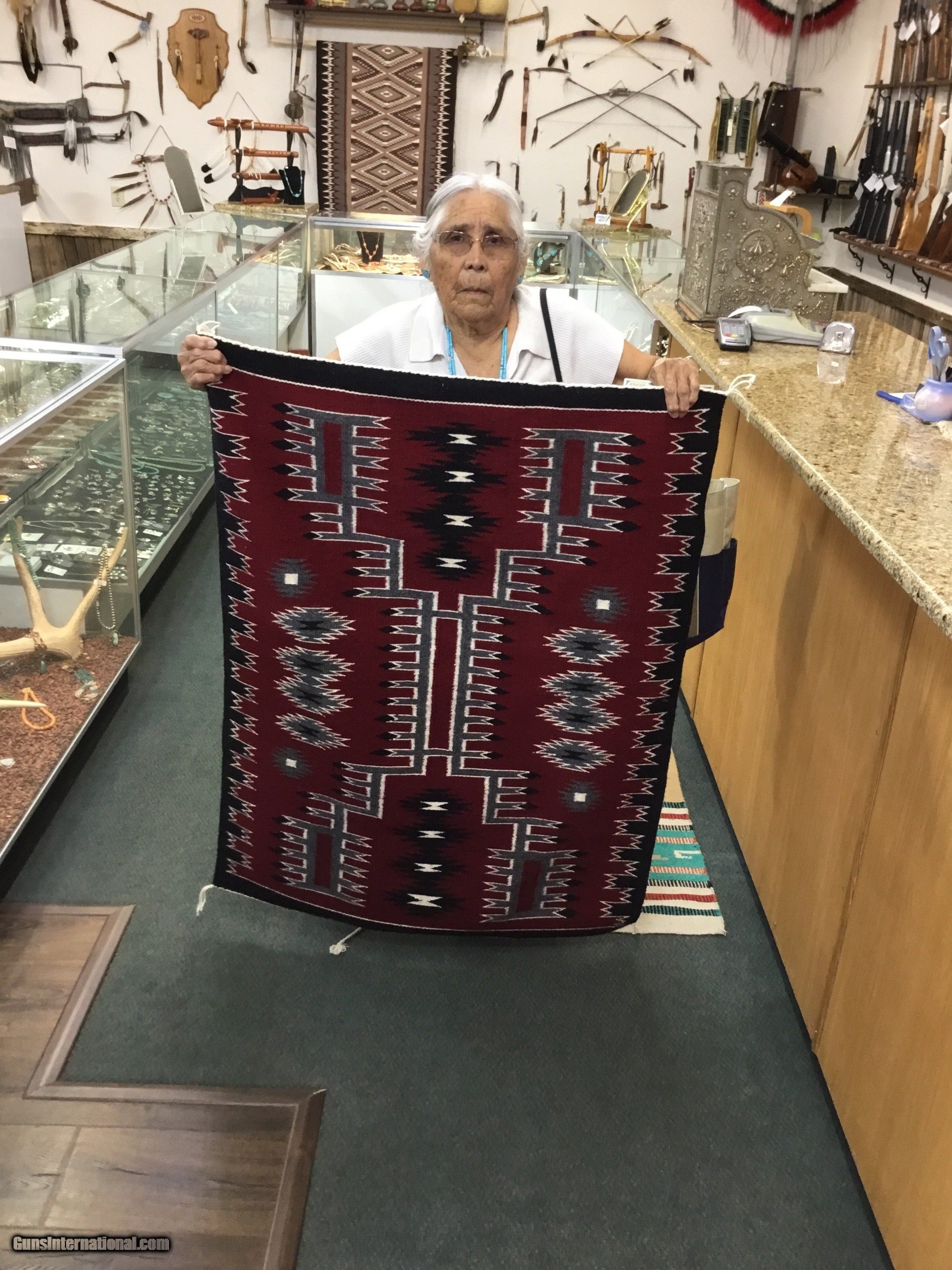 Description: This stunning Navajo Rugs was woven by Cecelia Dee of Montezuma Creek, Utah, (pictured) master weaver. Cecelia has done a Storm Pattern with Traditional Ganado colors. One beautiful rug, very intricate, near perfect. Rug measures about 44” x 35” This one won’t be available long, it is just stunning. free shipping , no credit card fees SOLD
