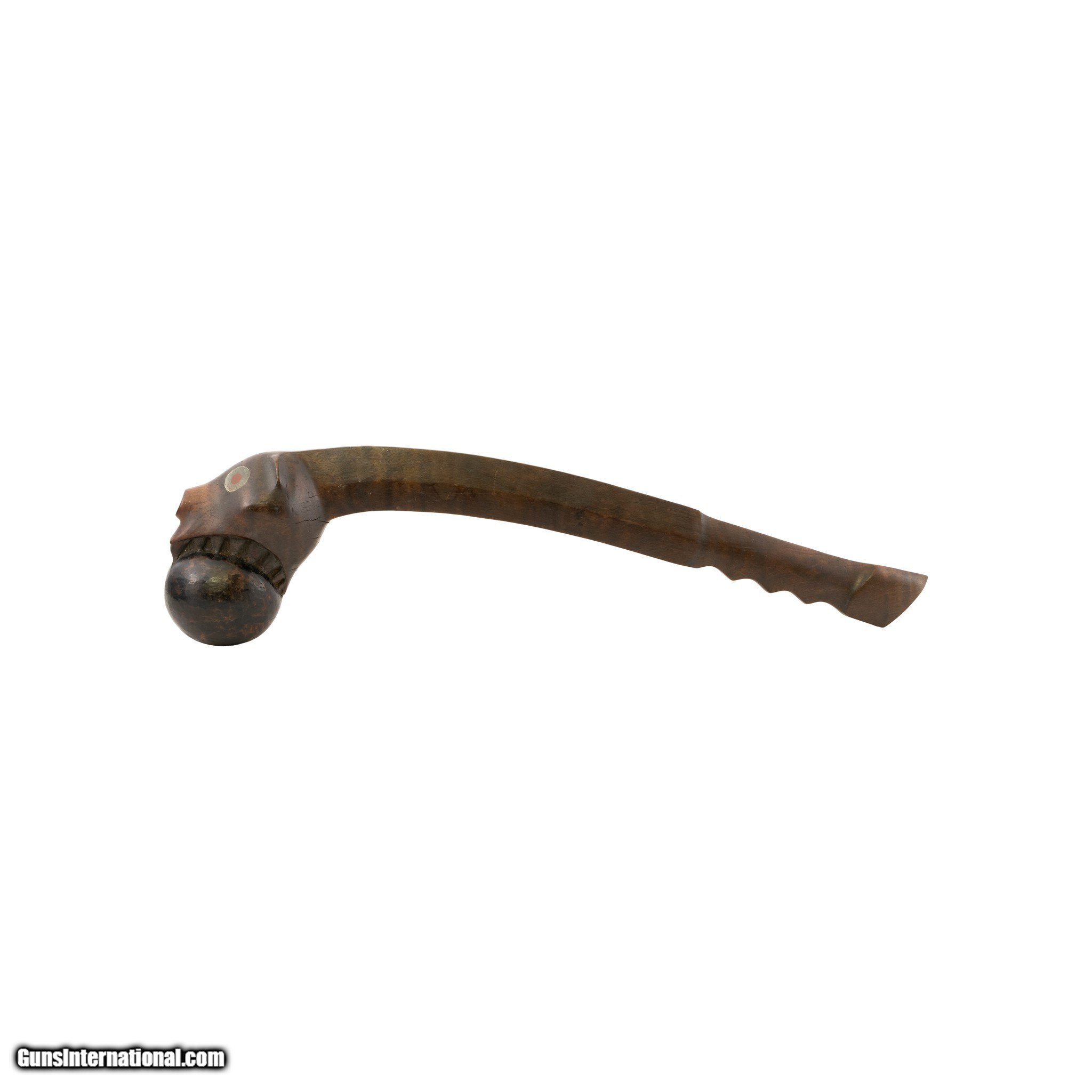 Description: Southeastern ball headed club of tiger maple with open jaw panther holding ball in pony leg style. 19"L, Head 5". 19th century. SOLD |