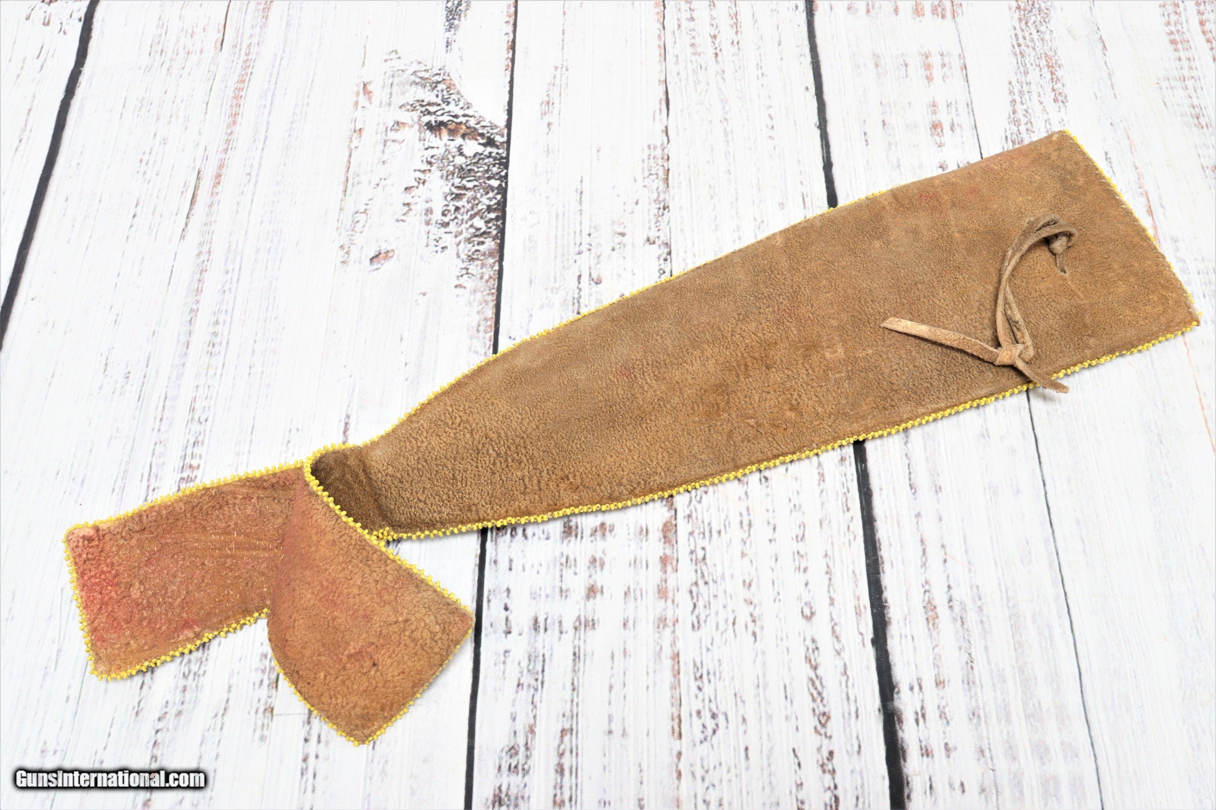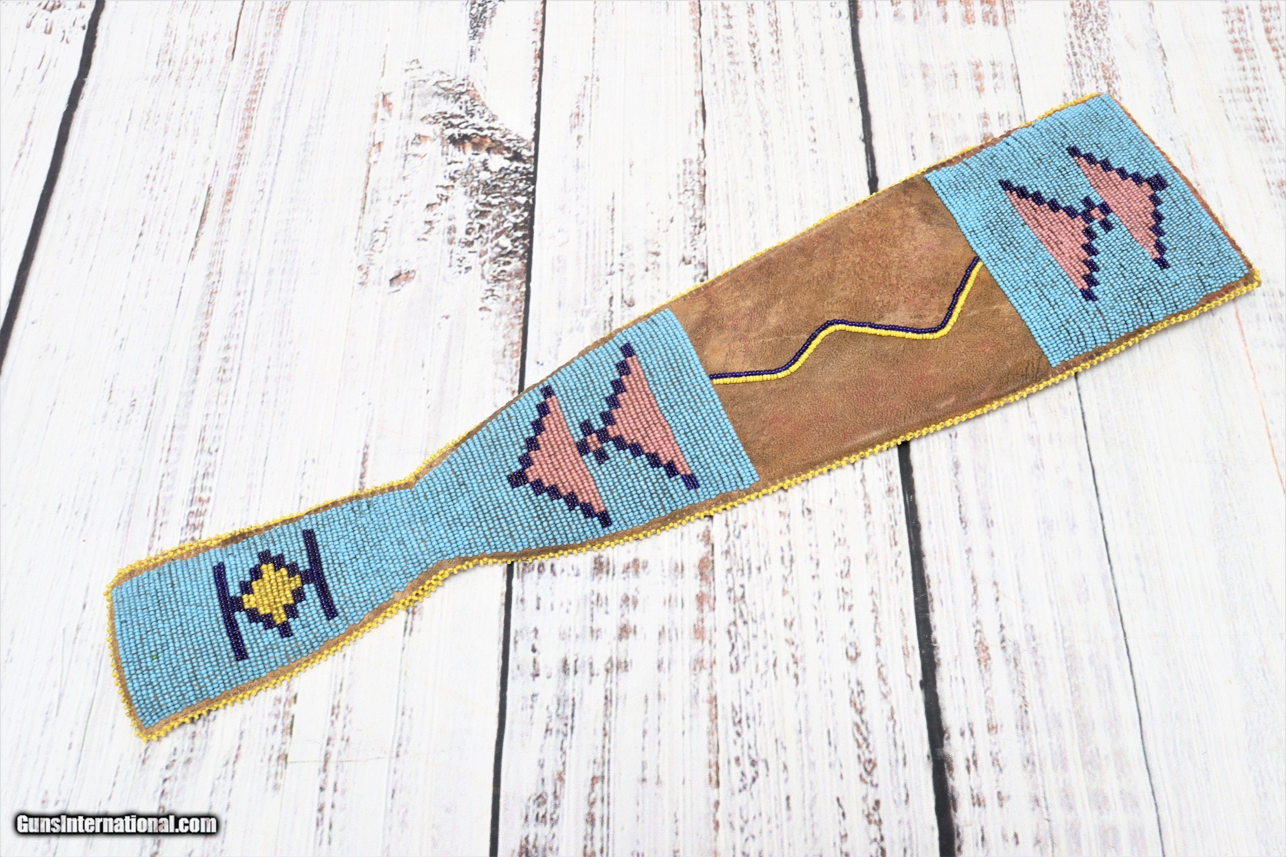 Description: Native American Blackfeet Indian style beaded dag knife sheath with tab drop. Featuring bold colors of blue, pink, and yellow with triangular designs at top and bottom of center panel. Center panel is blank aside from double lane lightning bolt running down center. Original purchaser had authenticated, but we are unsure. May or not be Native American made. Old beads, but contemporary, decorative piece that would display nicely in a handmade indigenous beadwork collection or as decor in a Southwestern style home. Size: 18"L x 4 3/4"W Family Owned & Operated Cisco’s Gallery deals in the rare, exceptional, and one-of-a-kind pieces that define the history of America and the Old West. Our pieces range from American Indian to Cowboy Western and include original items of everyday life, commerce, art, and warfare that tamed America’s frontier. Our 14,000 square foot gallery opened in 1996 in beautiful Coeur d’Alene, Idaho. Personal Service Cisco’s operates on old fashioned values – honesty and integrity, and all of our items are backed by our money back guarantee. We appreciate the opportunity to earn your business. Whether you desire assistance with a jewelry purchase, choosing a gift, identification, or even selling – we hope to be your trusted source. SOLD |