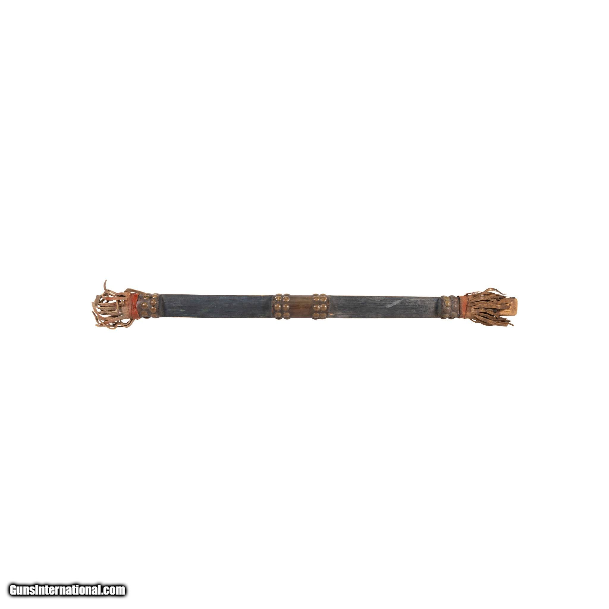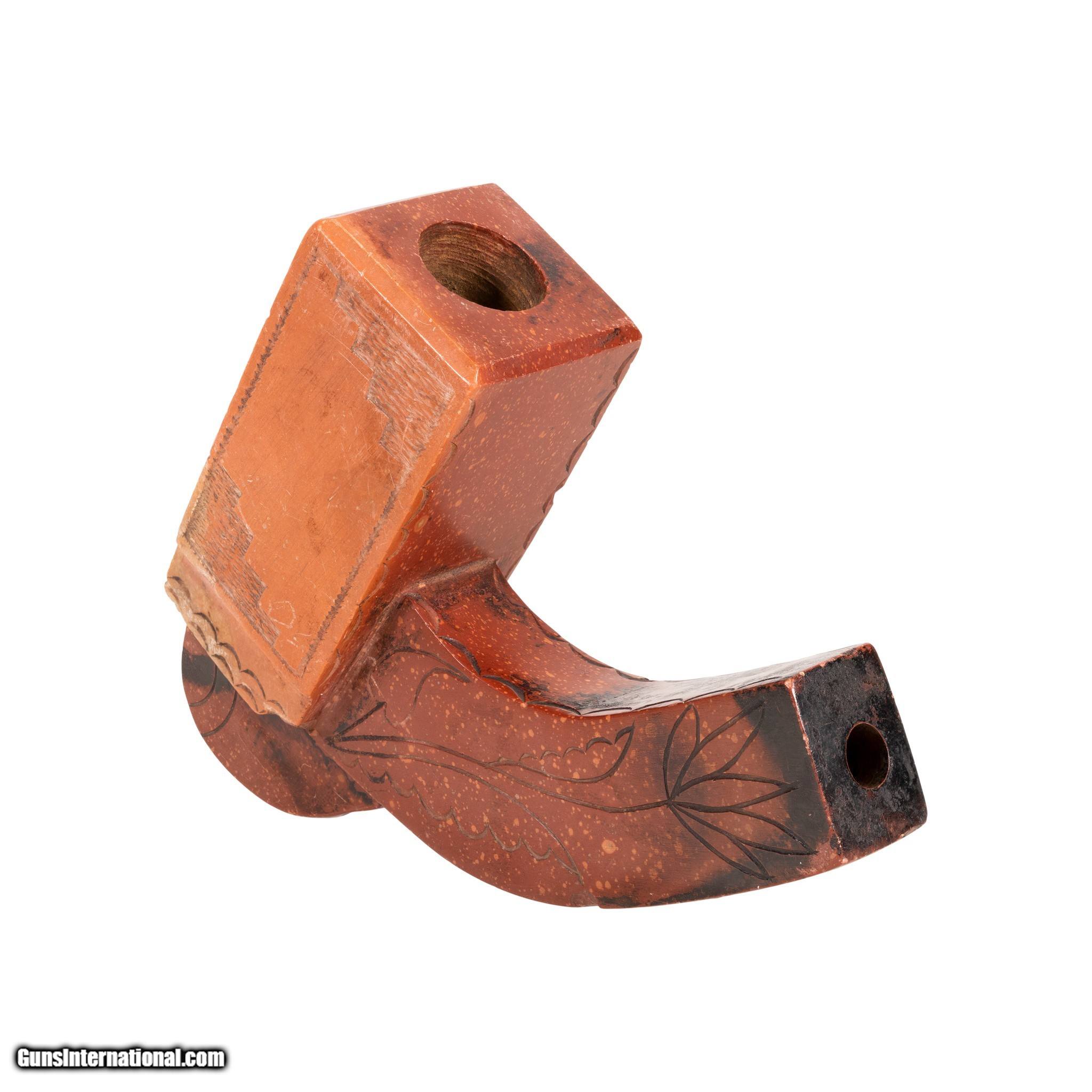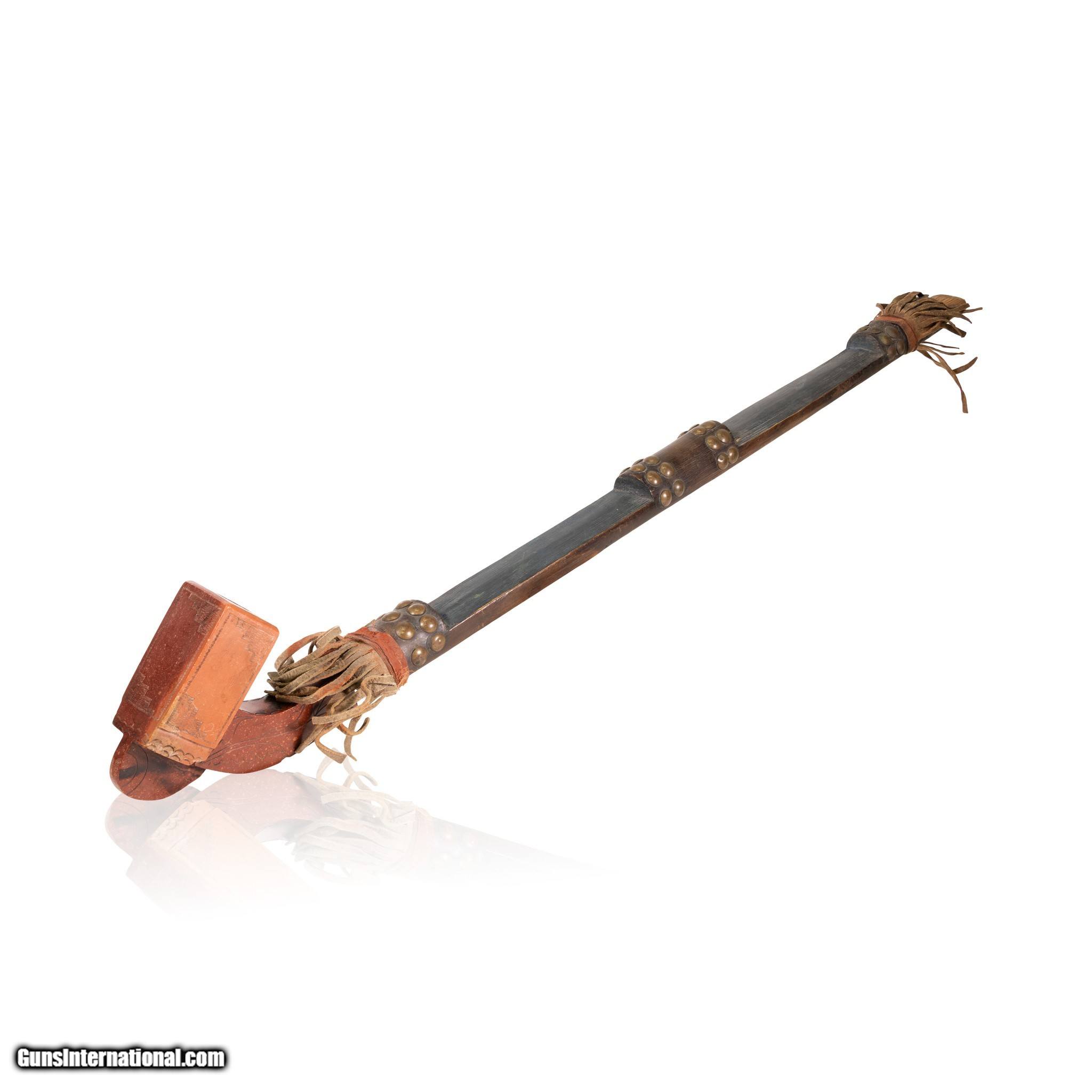 Description: Crow elbow pipe with stylized and etched catlinite bowl, tacked and painted stem, brain tanned red ochre covered fringe both ends. A smoked piece. Ex. Treasure Island Museum, St. Ignas, Michigan. Collection No. 00732. Bowl 4" Overall 26 SOLD |