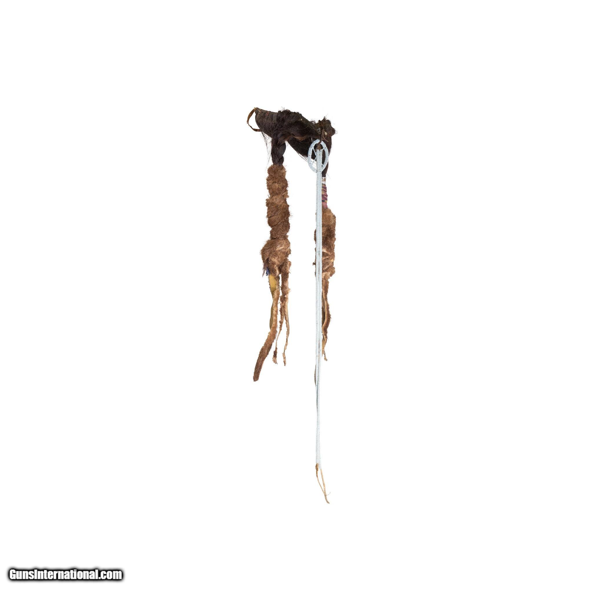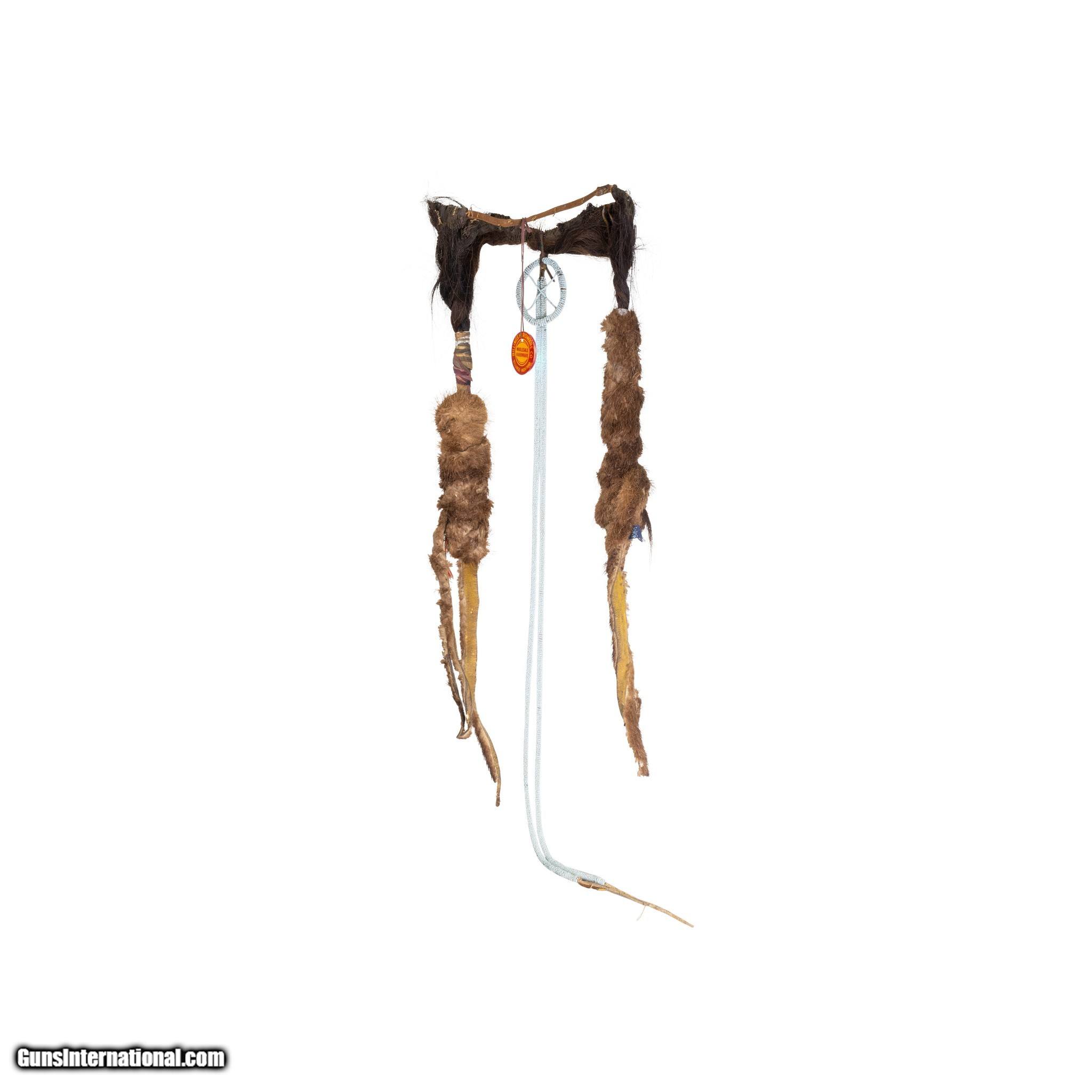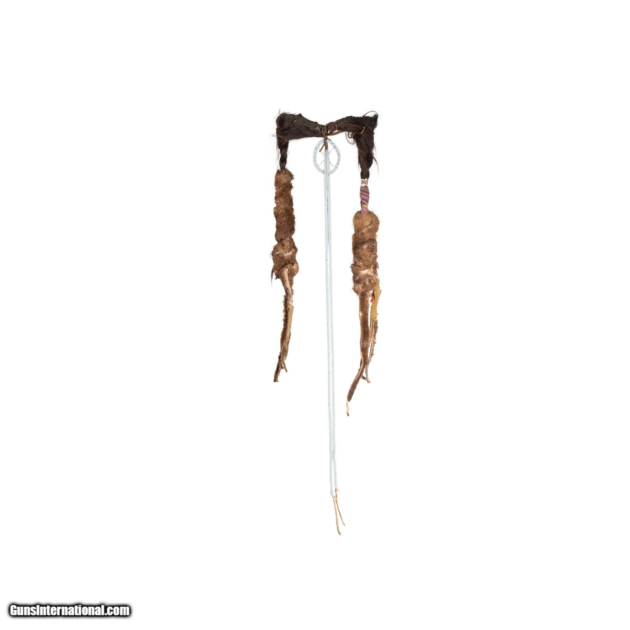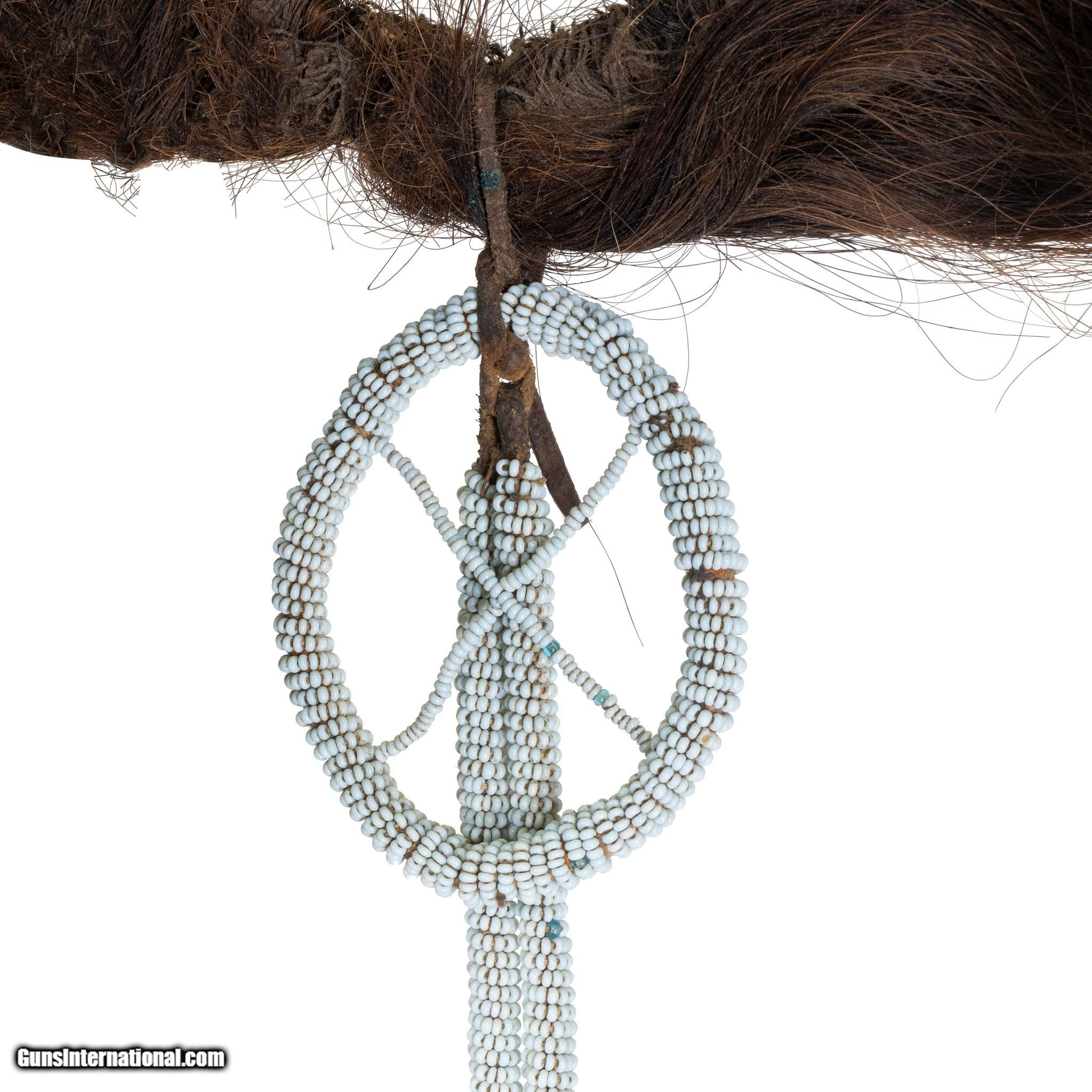Description: Crow hair piece sold at the Billings Hardware Store for $15. Human hair, yellow ochred, otter and finely beaded drop. Many of the brave's braids were cut when moved to the reservation. This was a warriors head piece to return stature. A used piece. 22"L x 9"W Drops 30". 19th cenutry. SOLD |