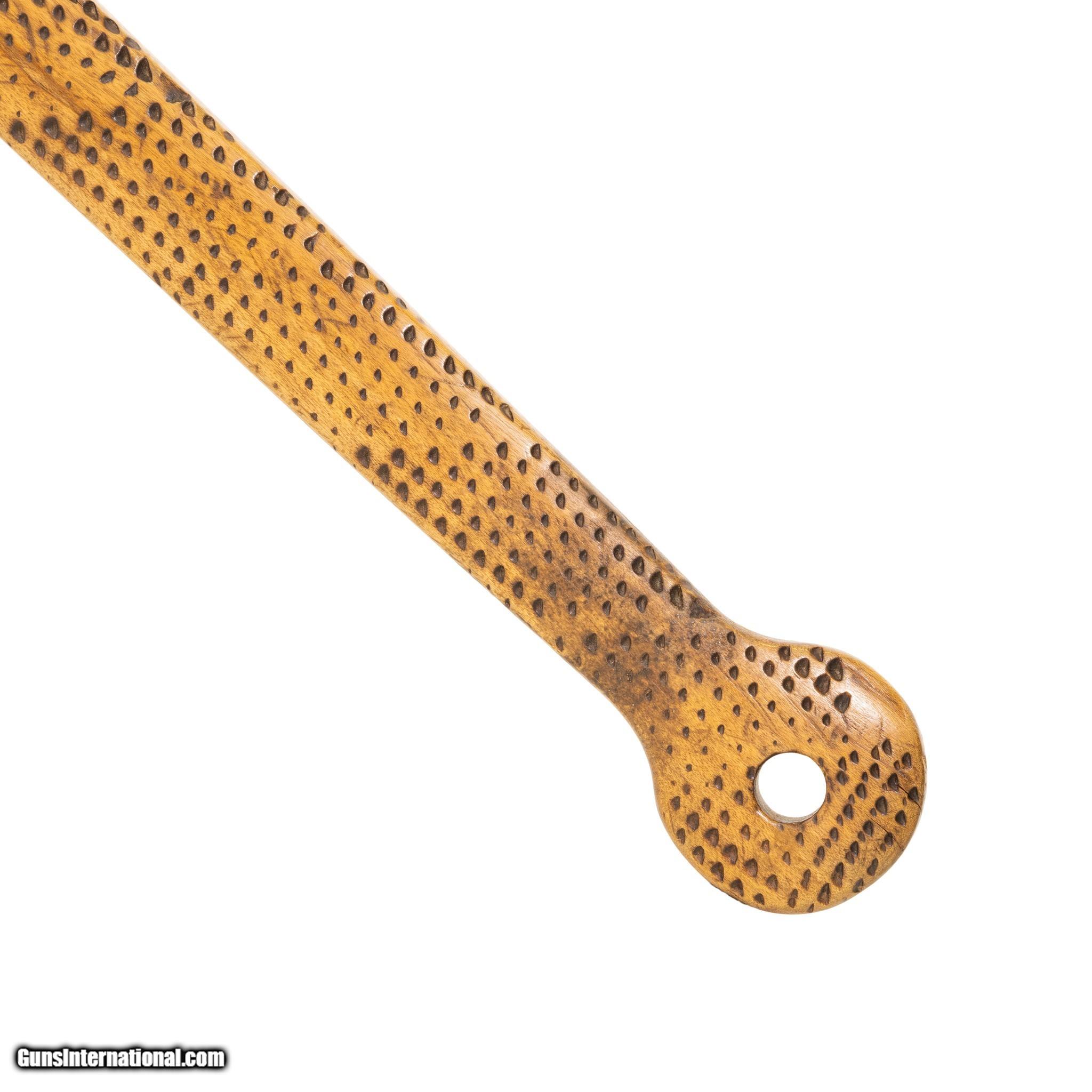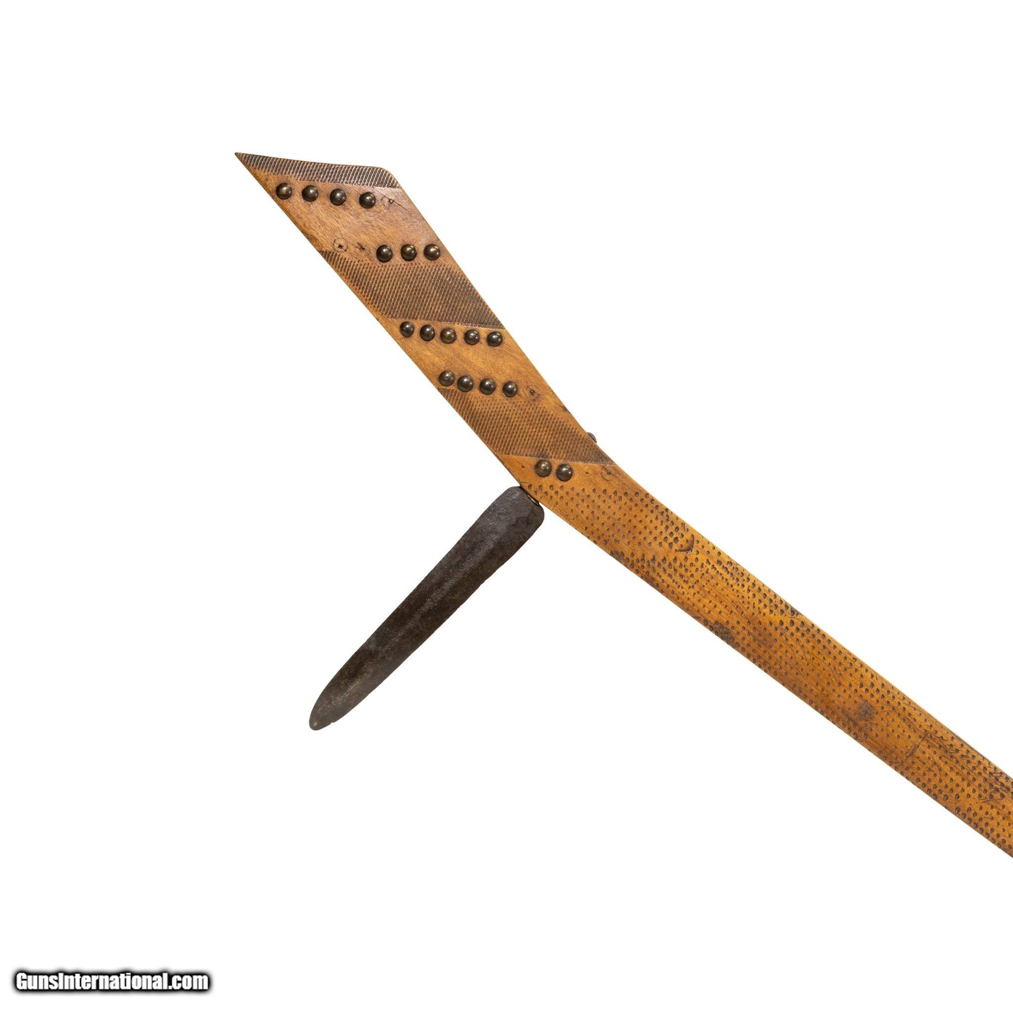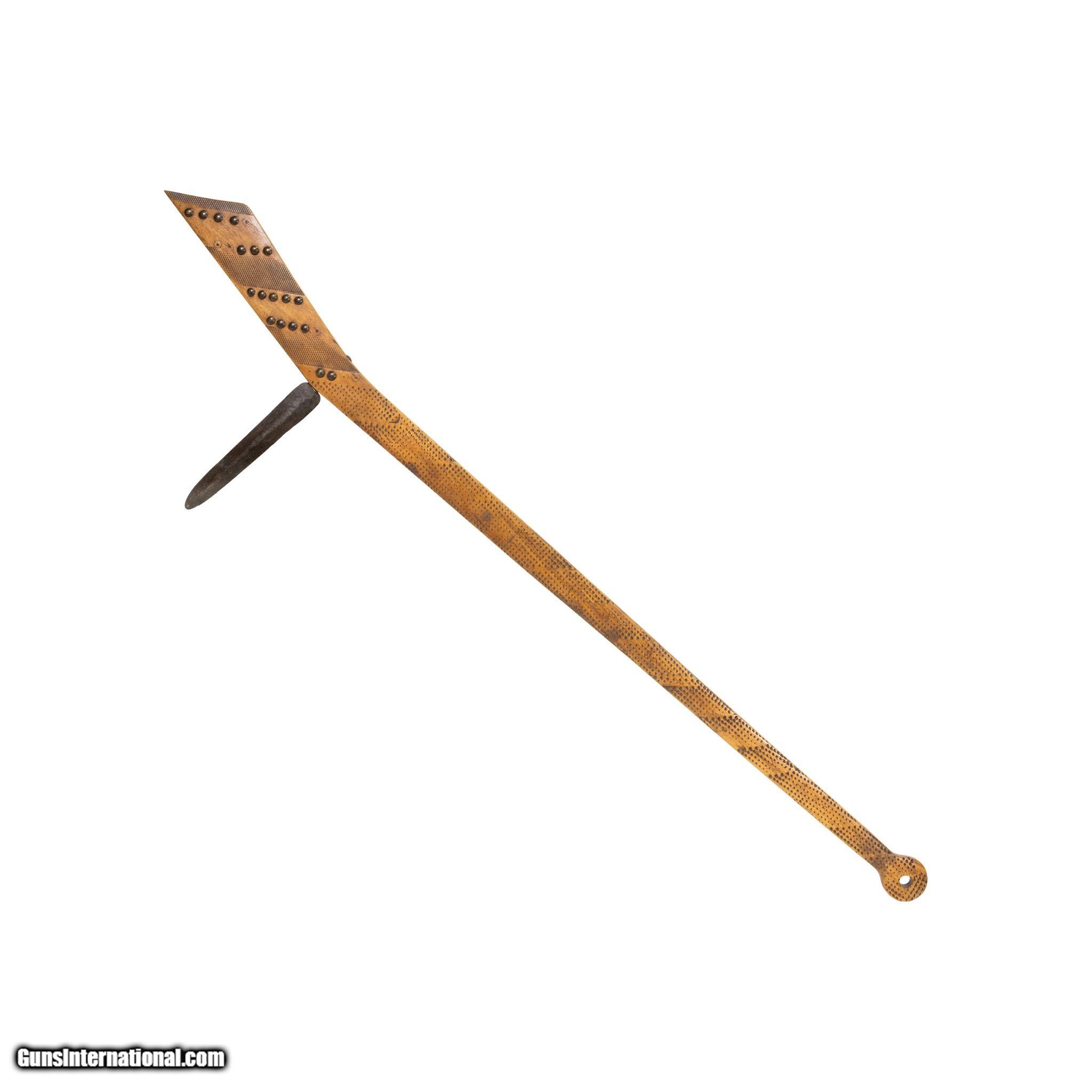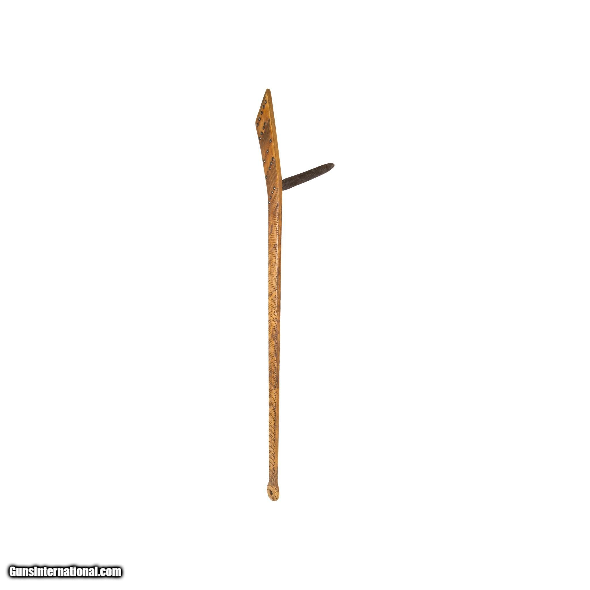 Description: Mid 19th Century gun stock club with 8" blade honed down from a file. File burnt with tack decorations. Originated in Iowa. Ex. Sorbie. Museum quality, long length. Mid 19th century. 44"L; Blade 8 SOLD |