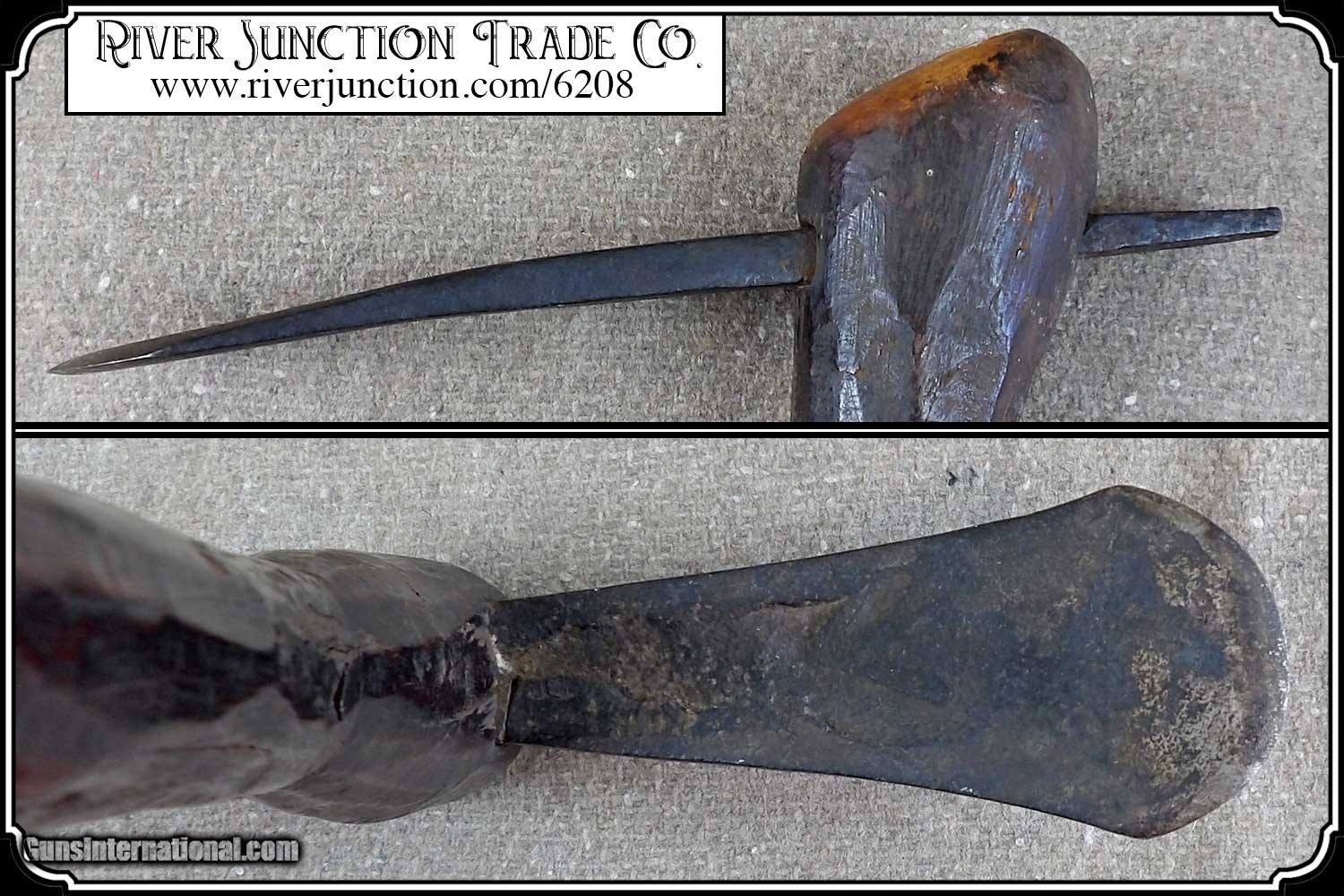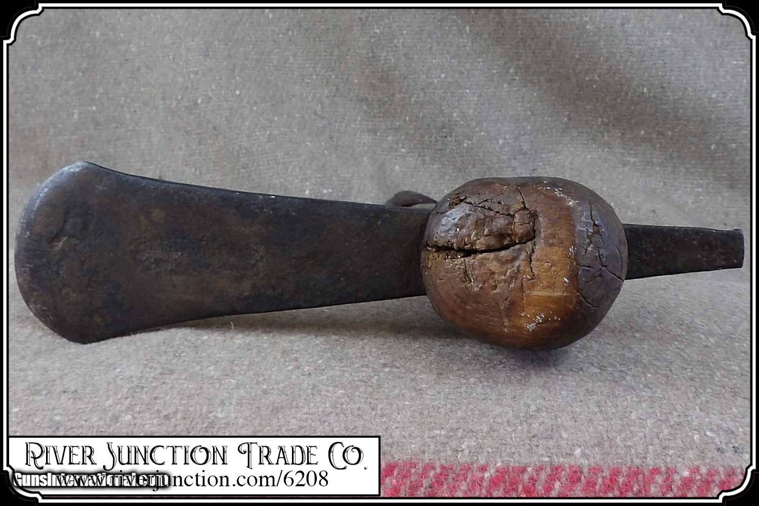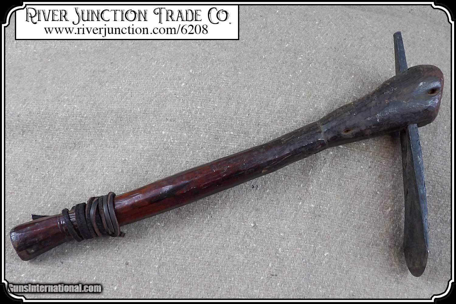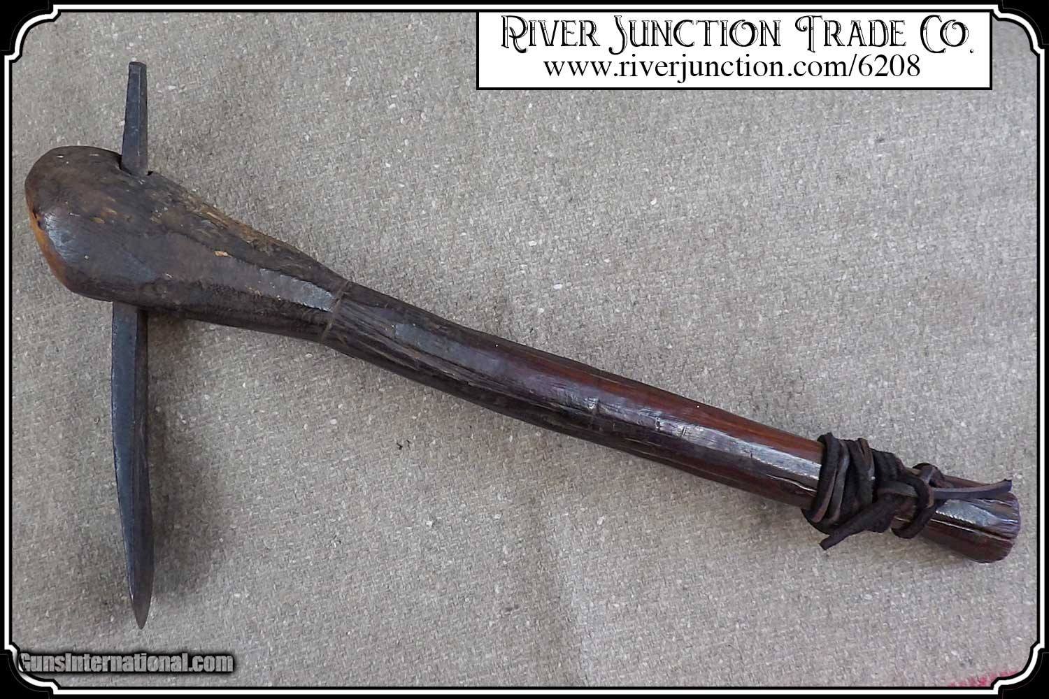 Description: Handmade Primitive Adze: This is an amazing primitive hatchet or carvers adze, handcrafted of all natural materials. Has a wooden handle made of fire hardened wood, that is strong and dense. The blade is made of sharp and solid hand forged carbon steel. A fantastic piece. Perfect for use in building a dugout canoe and would also double as a deadly primitive weapon. Well crafted. Great patina. .View from the front shows a crack on head, but not all the way through. When you look at the top you can see where the tool was struck with something to add force for a good bite. Payment: Item, can be ordered on line with a credit card or paypal on our sight. Just Google (riverjunction) and type in the River Junction Trade Co. item number (6208) in the search box. Before you checkout you will see shipping cost and total. OR If you prefer: Pay by cash, postal money order, cashiers check, personal & business checks. We wait for checks to clear. We always answer questions and entertain offers. Have questions? Call me 563-880-4588. Jim SOLD |