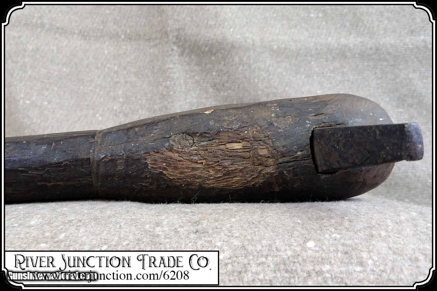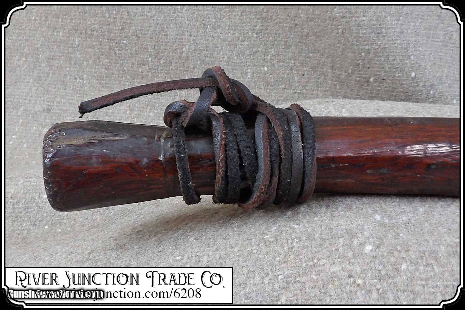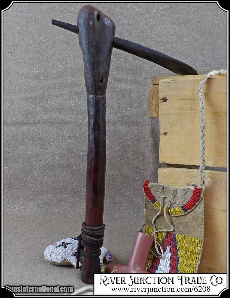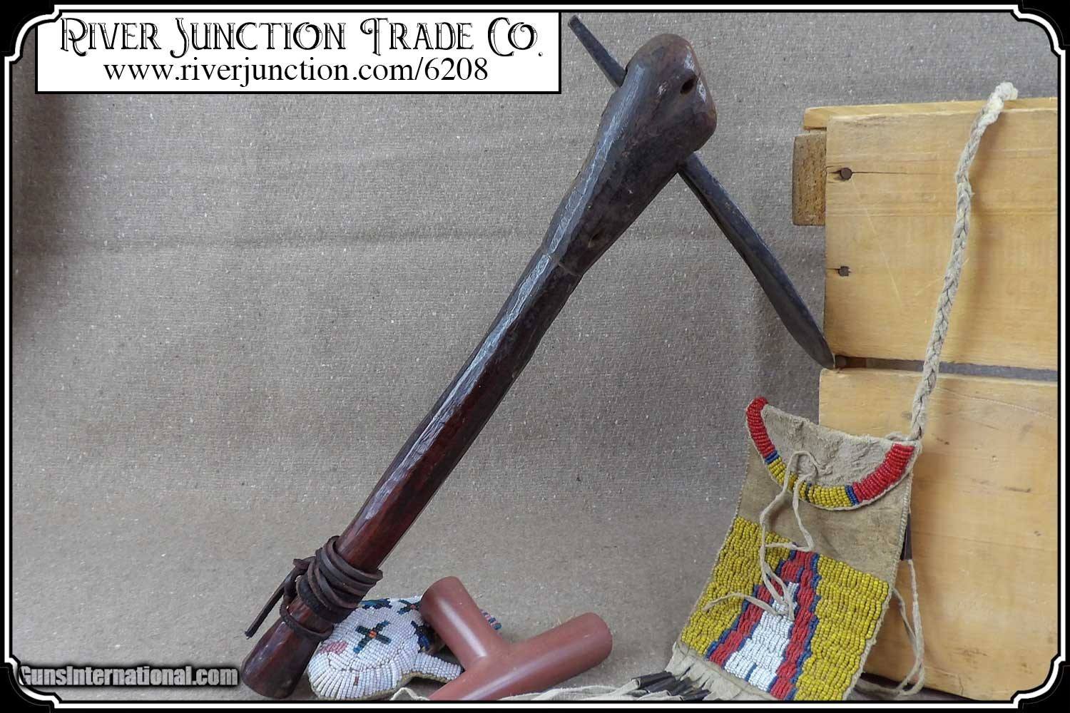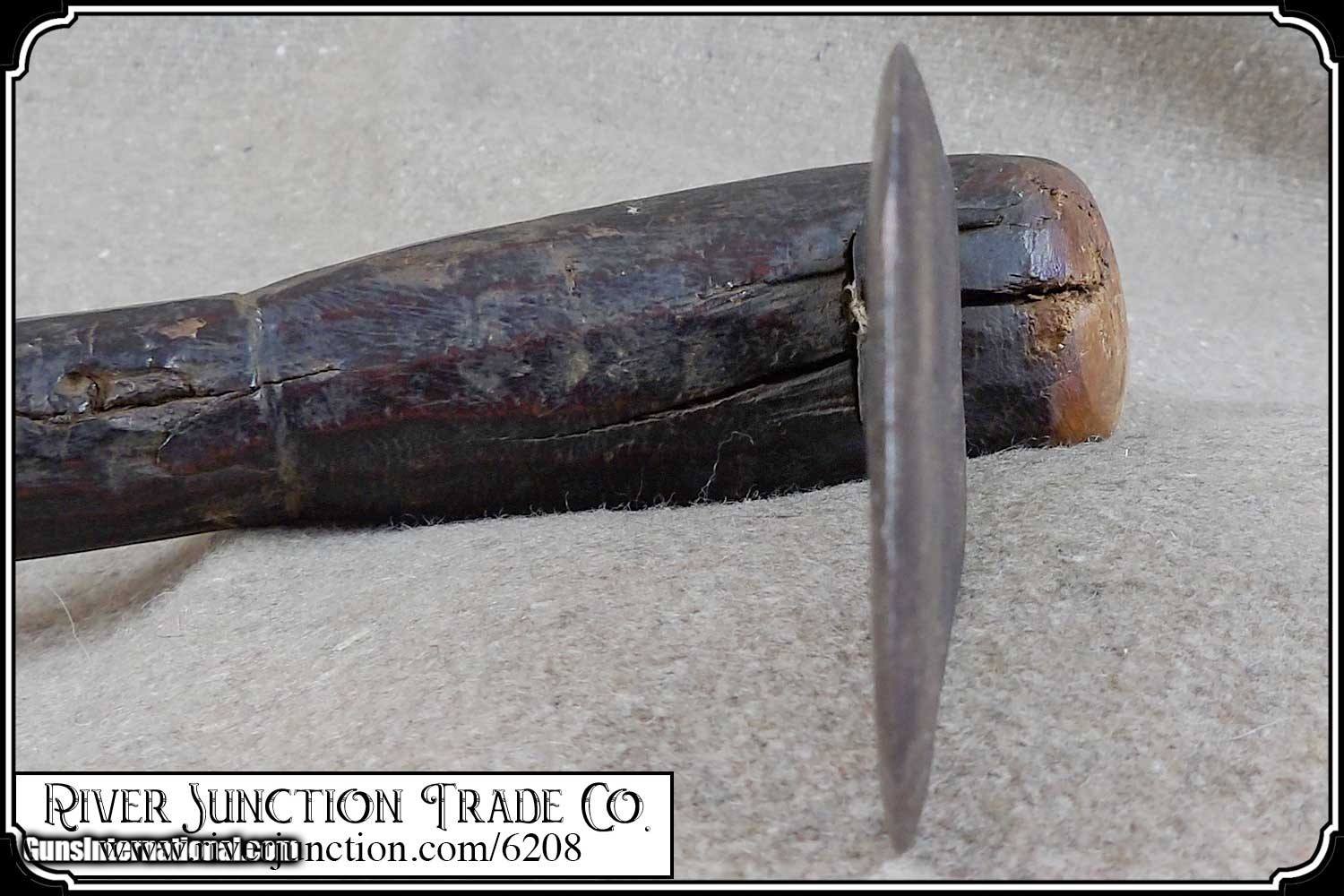Description: Handmade Primitive Adze: This is an amazing primitive hatchet or carvers adze, handcrafted of all natural materials. Has a wooden handle made of fire hardened wood, that is strong and dense. The blade is made of sharp and solid hand forged carbon steel. A fantastic piece. Perfect for use in building a dugout canoe and would also double as a deadly primitive weapon. Well crafted. Great patina. .View from the front shows a crack on head, but not all the way through. When you look at the top you can see where the tool was struck with something to add force for a good bite. Payment: Item, can be ordered on line with a credit card or paypal on our sight. Just Google (riverjunction) and type in the River Junction Trade Co. item number (6208) in the search box. Before you checkout you will see shipping cost and total. OR If you prefer: Pay by cash, postal money order, cashiers check, personal & business checks. We wait for checks to clear. We always answer questions and entertain offers. Have questions? Call me 563-880-4588. Jim SOLD |