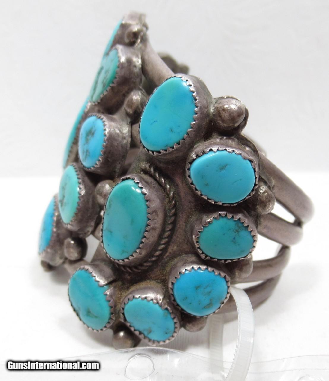 HUGE ORIGINAL NAVAJO OLD PAWN BRACELET FROM NEW MEXICO from COLLECTING TEXAS – SILVER BRACELET with 25 TURQUOISE STONES