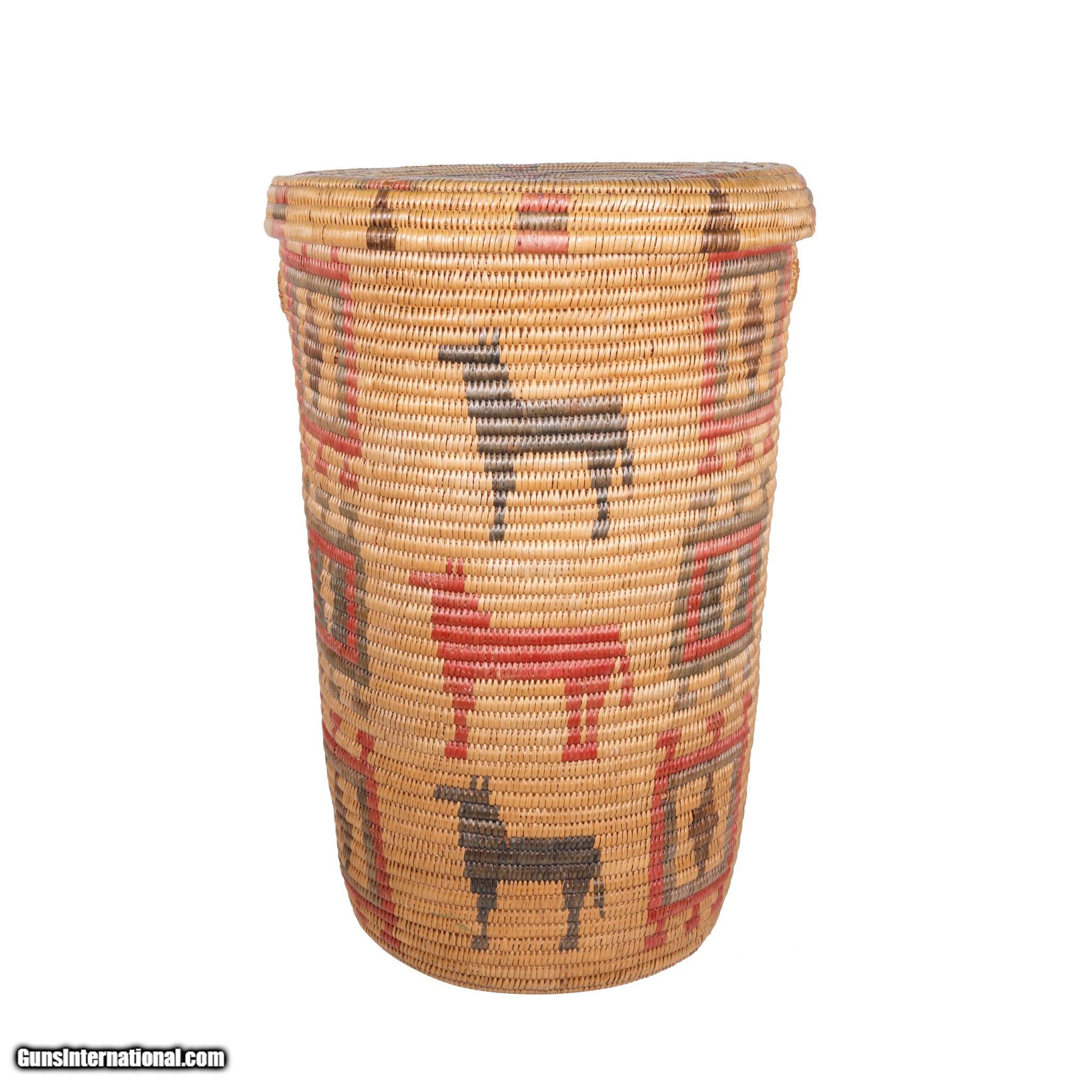 Description: Jicarilla Apache lidded waste basket with handle cutout, quadrupeds (we think dogs), and geometric designs. Acquired by Charles Graves, Indian agent in the 1920s. New Mexico. Slightly faded on outside but not distracting. 14” D x 21” H SOLD |