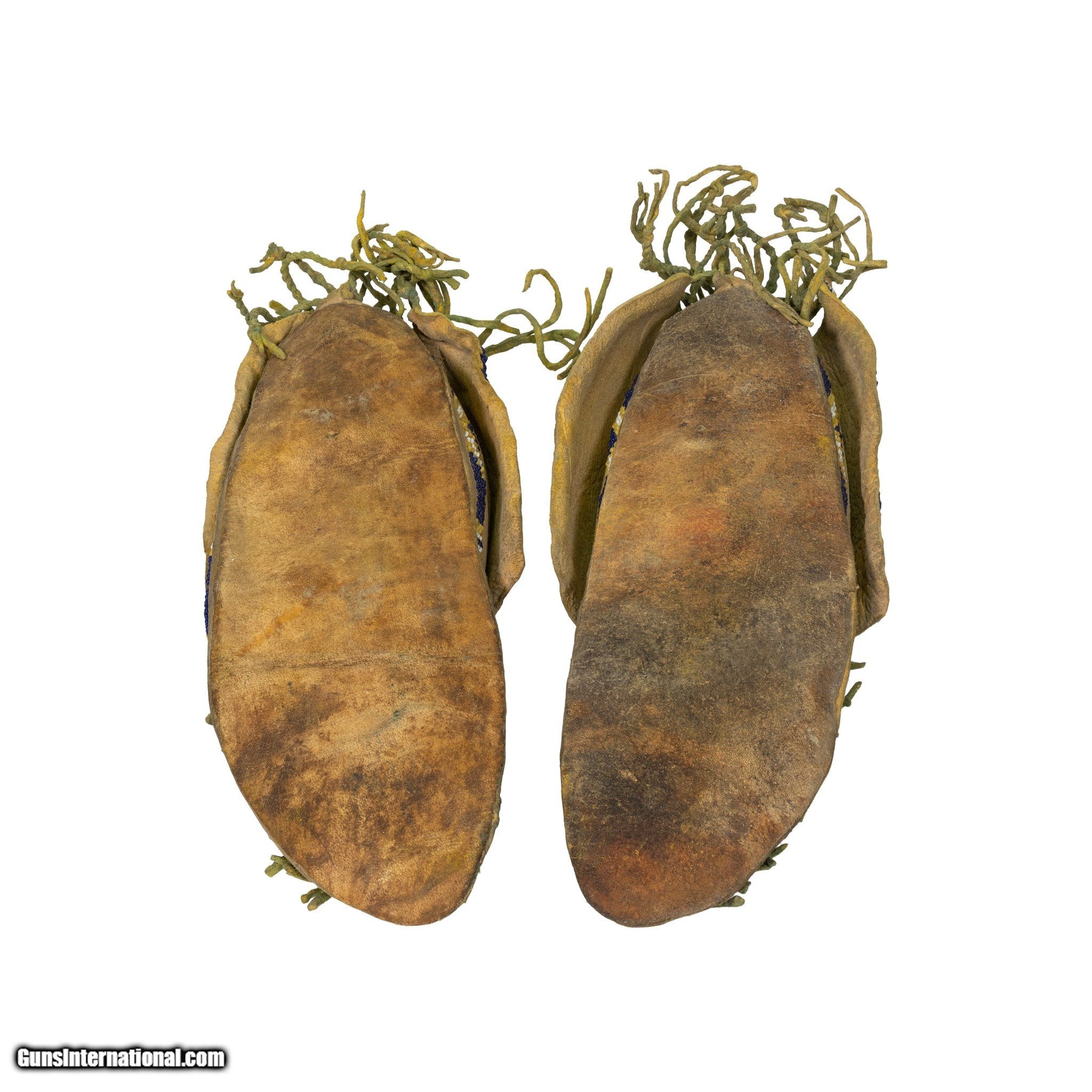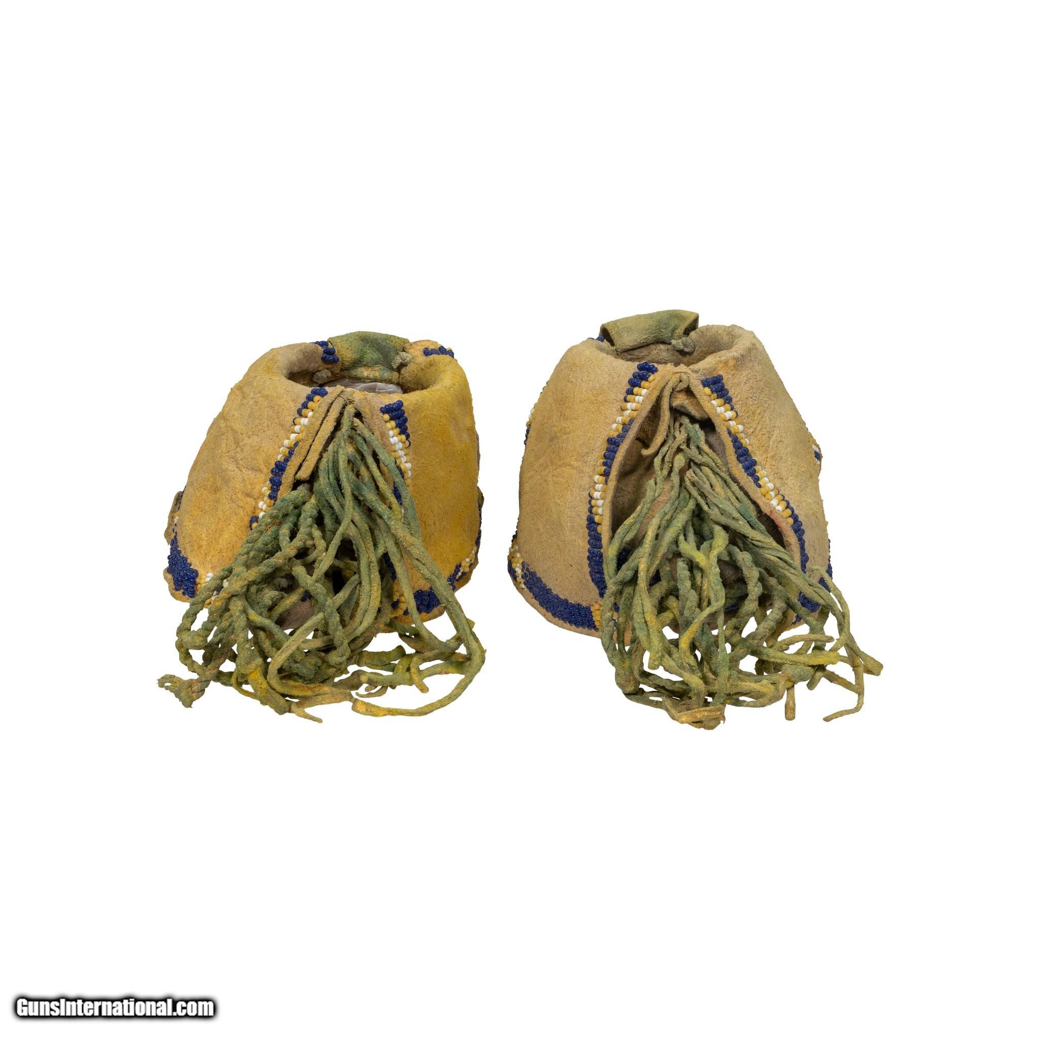 Description: Kiowa moccasins with green twisted fringe trailers and yellow ochre. Almost unused condition. 9 1/2" x 3 1/4" x 3"H. Circa 1880 SOLD |