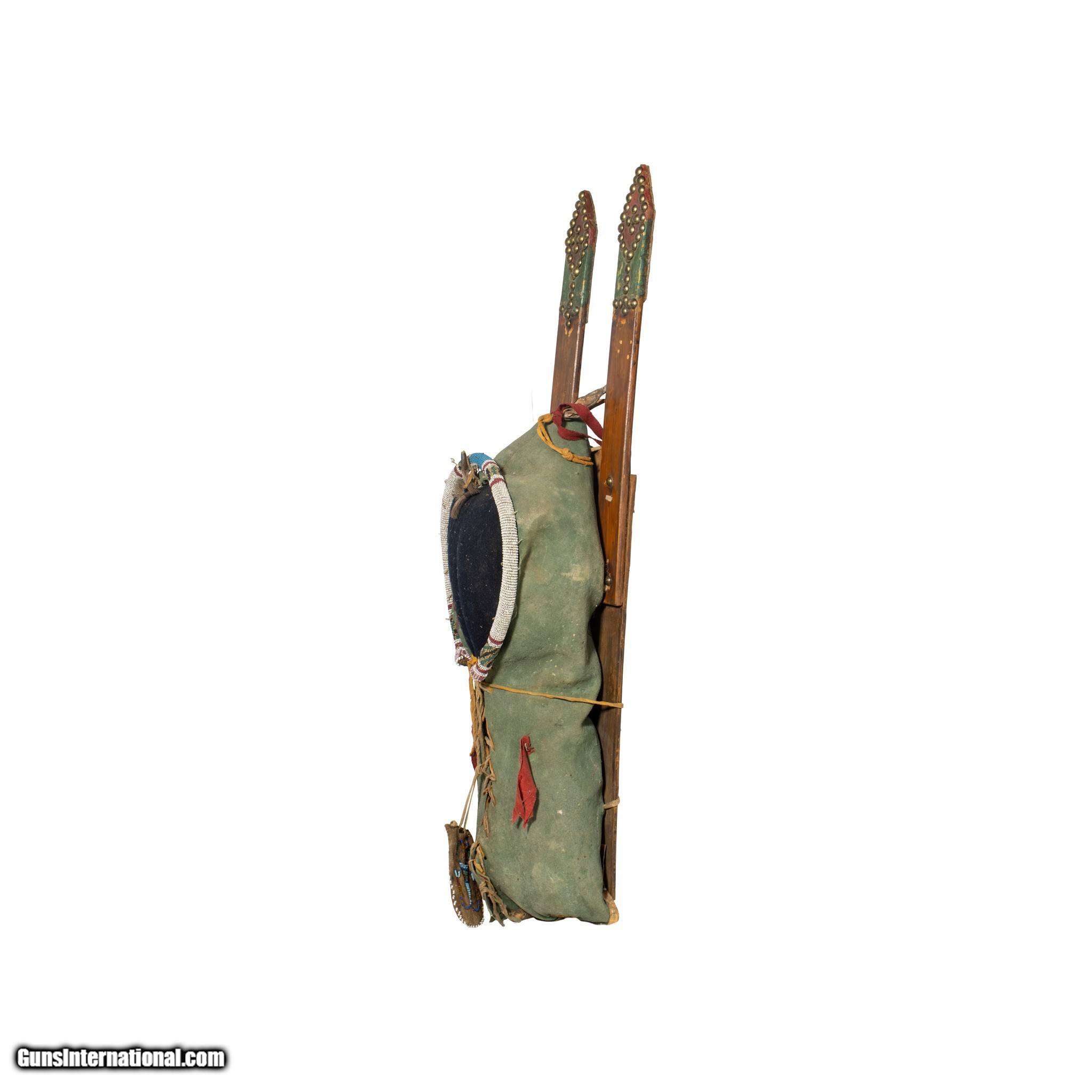 Description: Kiowa style cradle with 19th Century beaded pouch. Came out of a collection in the Netherlands. Cradle 21", overall with slats 30" x 8"W x 6"D. Decorative display piece. SOLD |