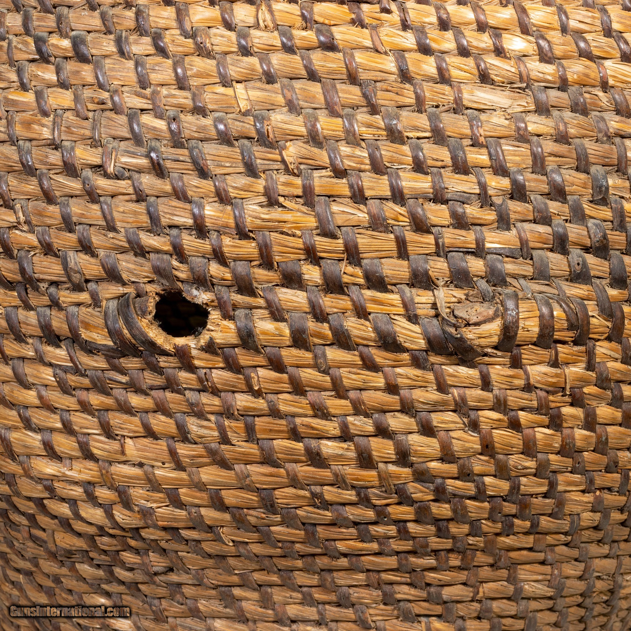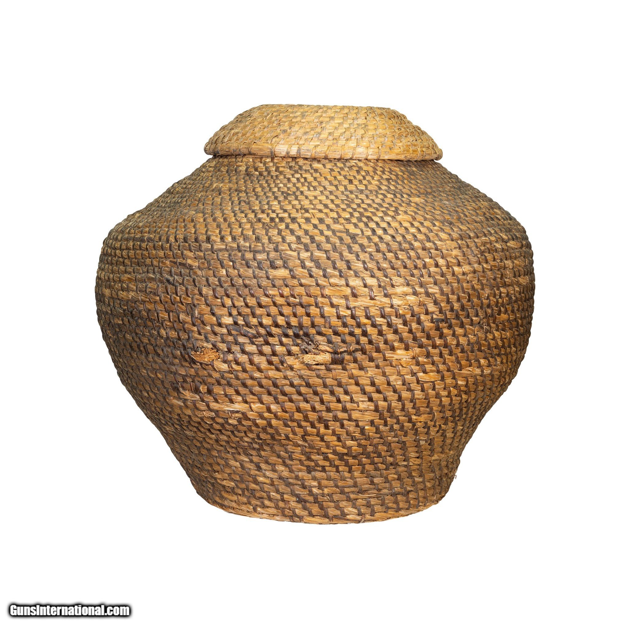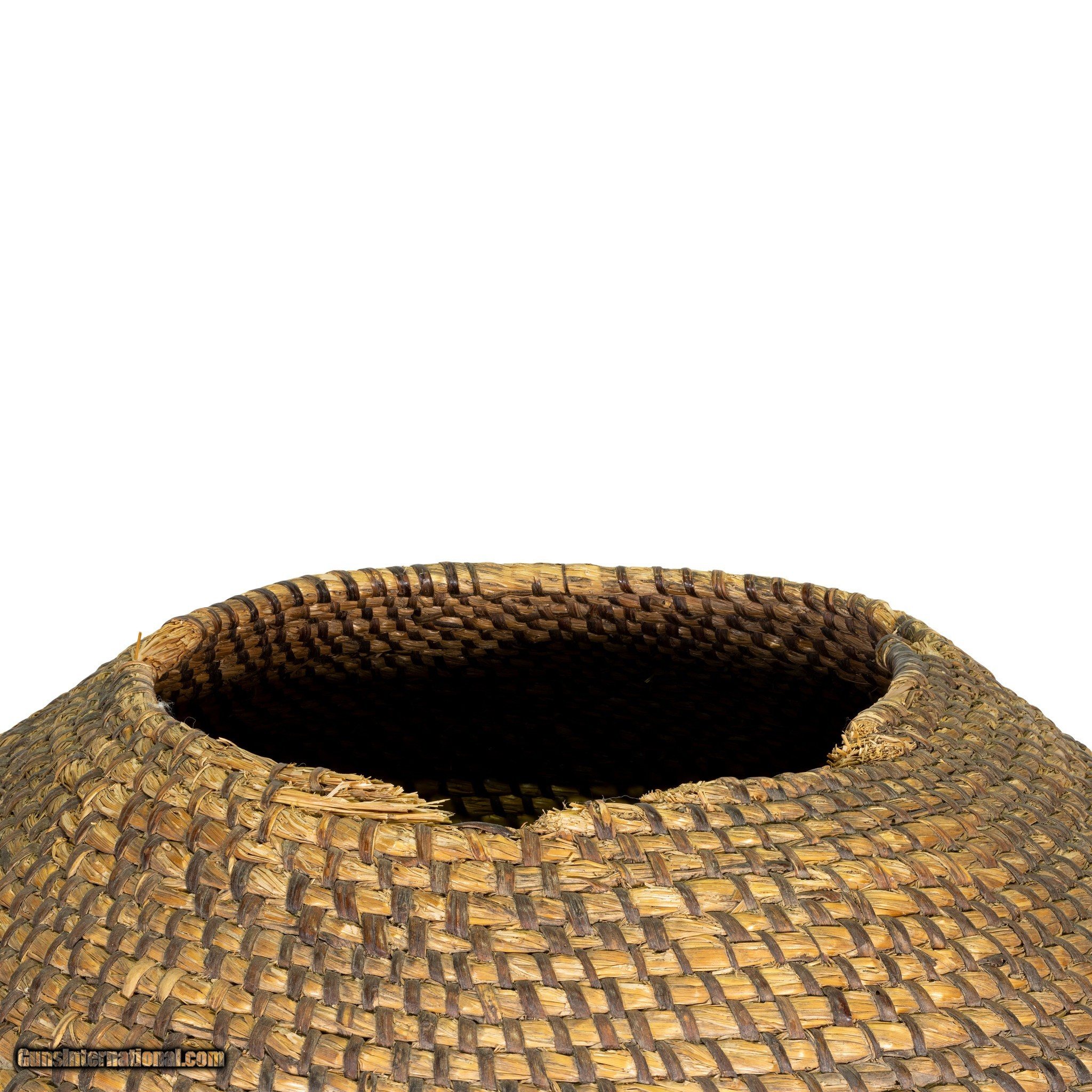 Description: Lidded Rye Straw Basket. Utilitarian storage basket from Colonial Williamsburg. Late 18th century or early 19th century. Patina and rim wear from use. 21"D x 20"H SOLD |